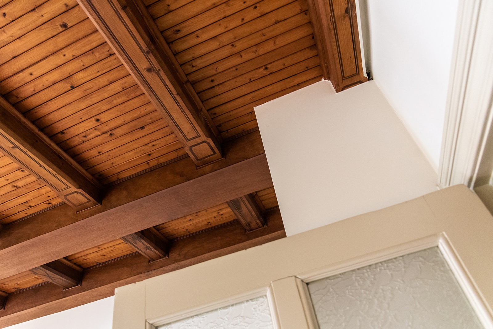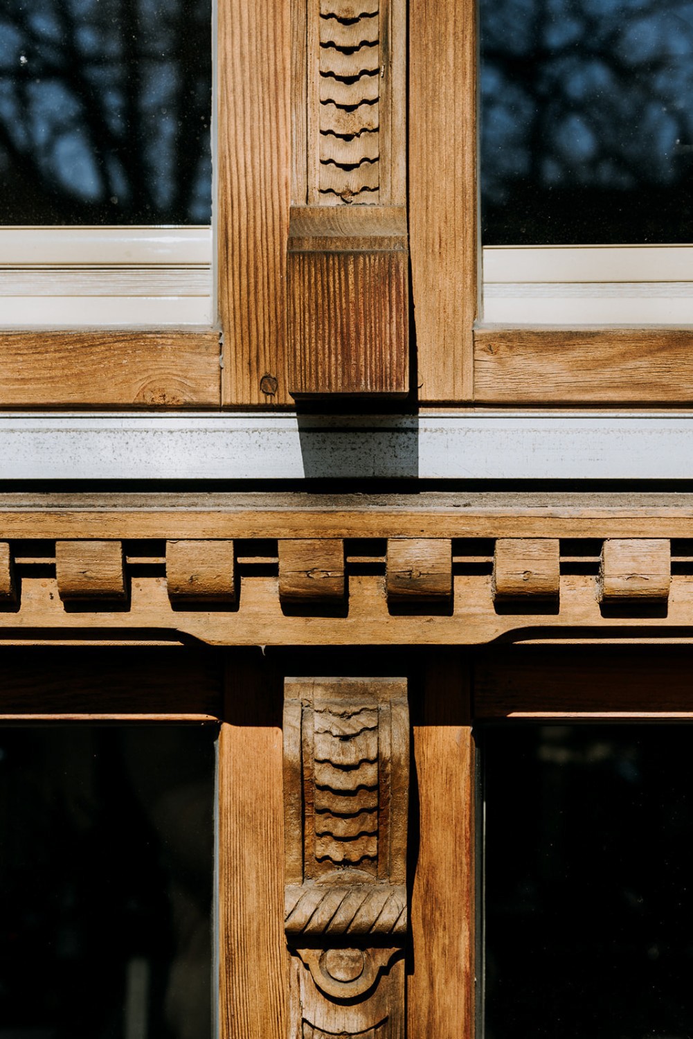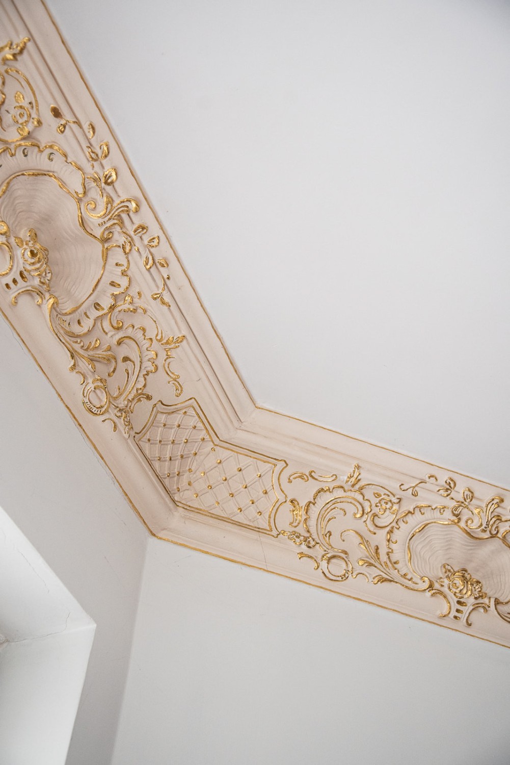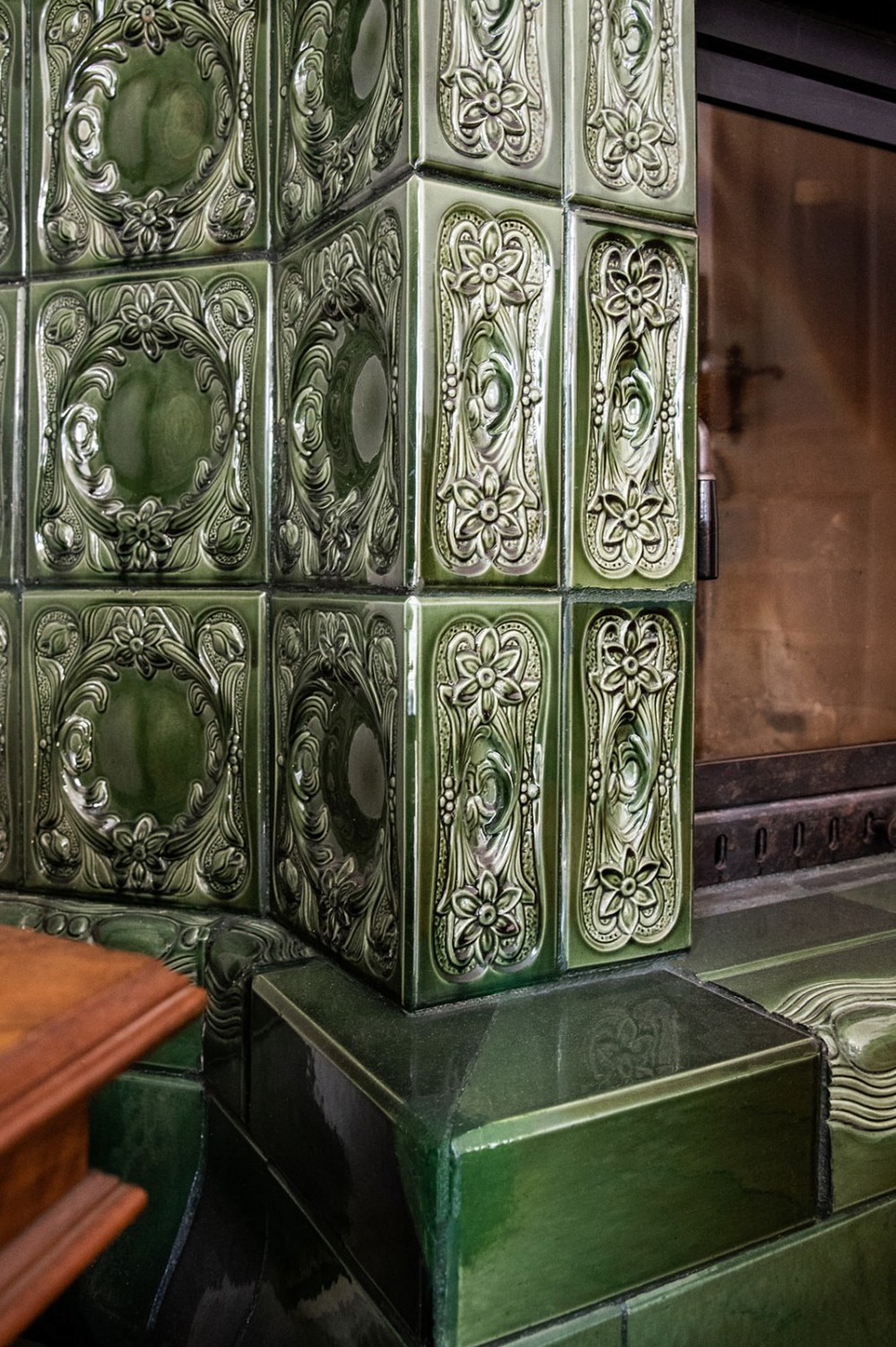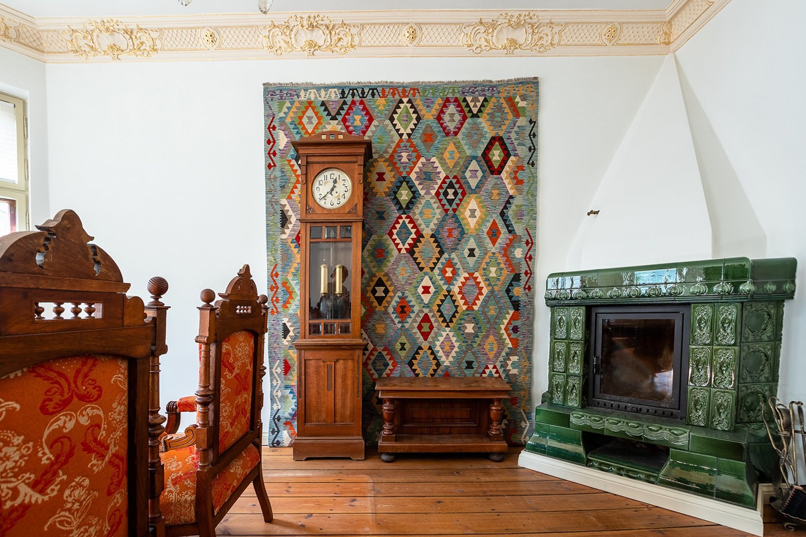 Die Fassade ist reich gegliedert mit historischen Details, darunter ein Löwenrelief, eine Kartusche mit Blumen- und Fruchtvase sowie kannelierte Pilaster mit korinthischen Kapitellen. Im Innenraum sind Stuckdecken mit floralen Motiven und Vergoldungen, historische Kachelöfen in Flaschengrün sowie originale Türen mit Messingbeschlägen und dekorativen Verglasungen erhalten. Auch die profilierte Dachspitze sowie die originale Türklingel mit der Aufschrift „Tucholla“ sind erhalten geblieben.