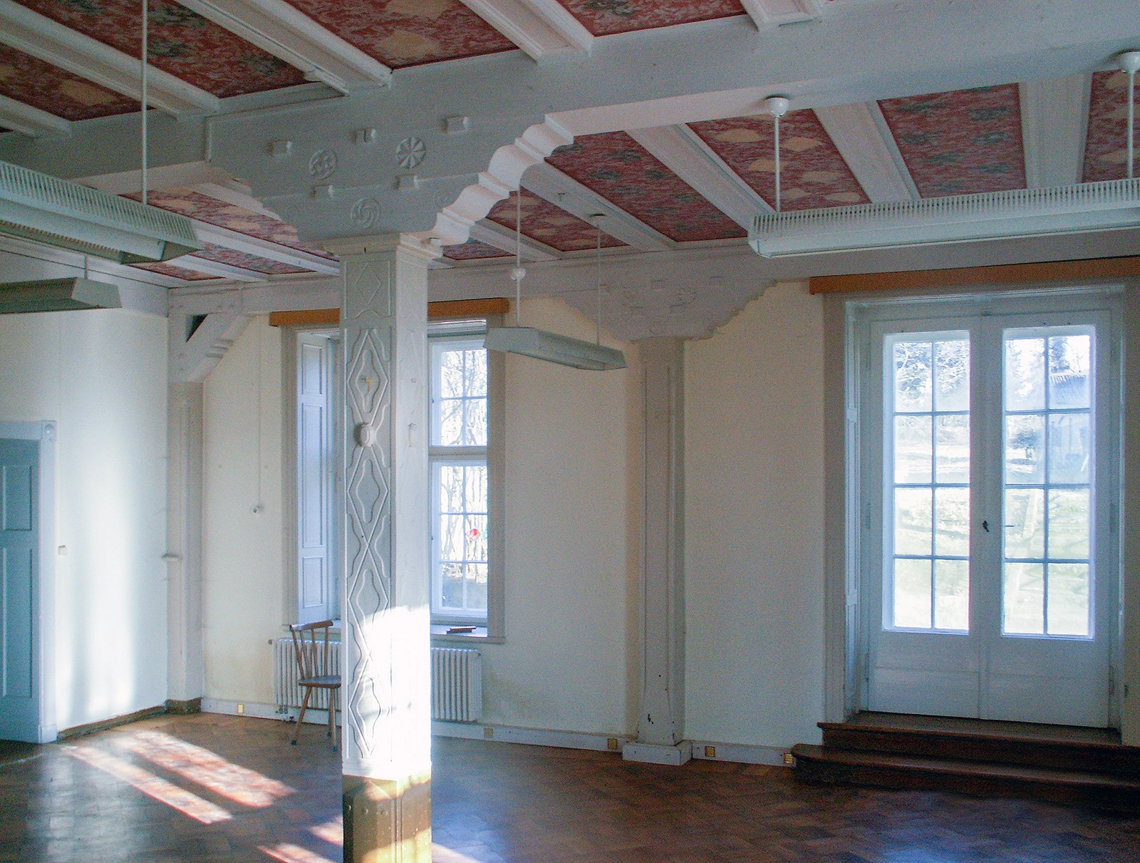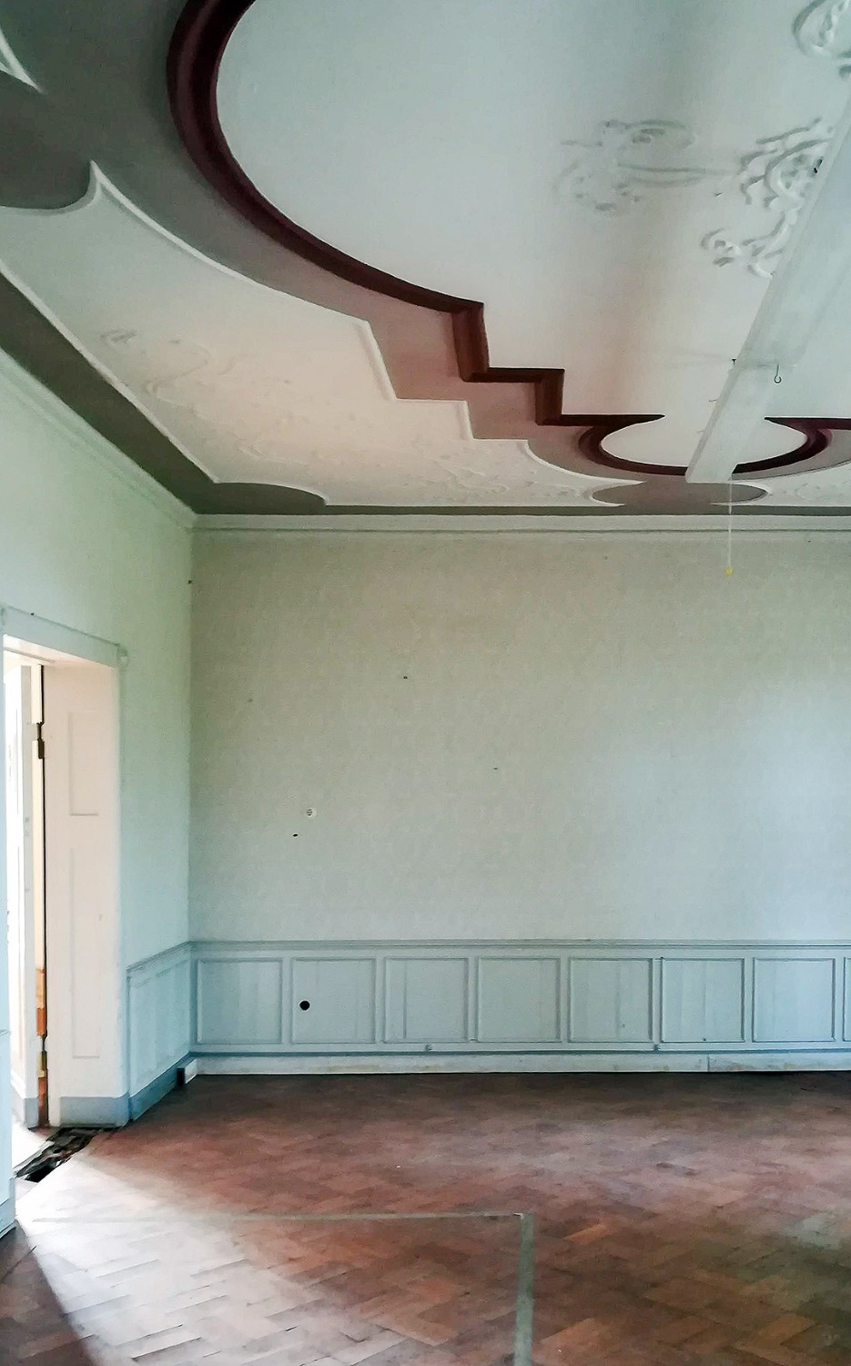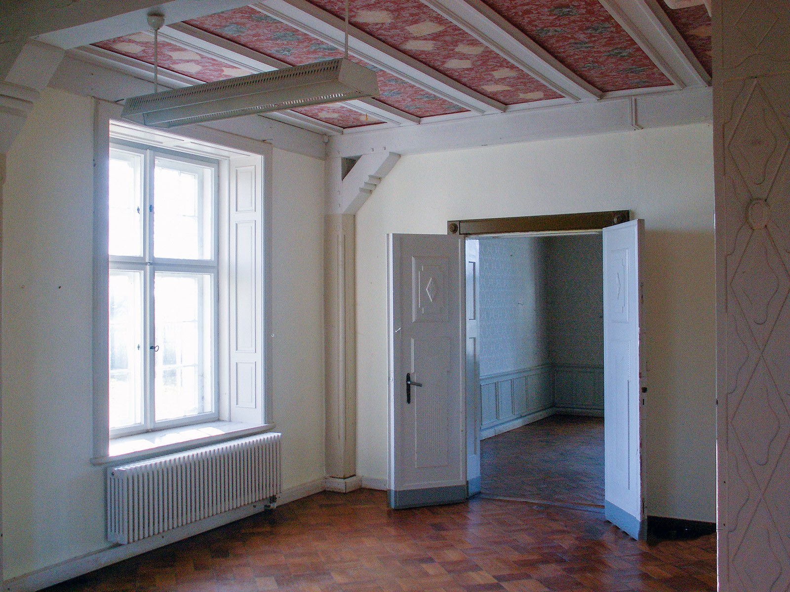 Fino al 2002, il maniero è stato utilizzato come asilo e centro doposcuola; gli interni presentano quindi uno stato di finitura semplice e ormai datato. Per un utilizzo futuro, sarà necessario pianificare lavori di ristrutturazione e modernizzazione estesi. I dettagli architettonici originali, come la scala, i pannelli in legno, le porte e i soffitti in stucco, offrono una solida base per un restauro rispettoso della sostanza storica.
