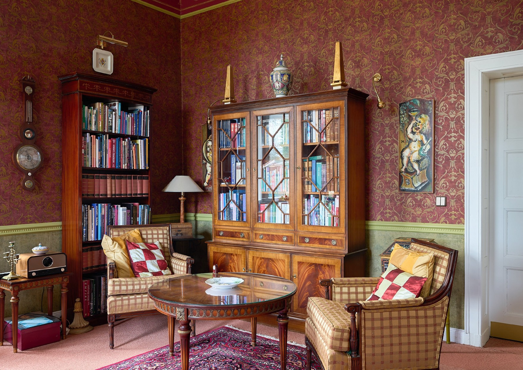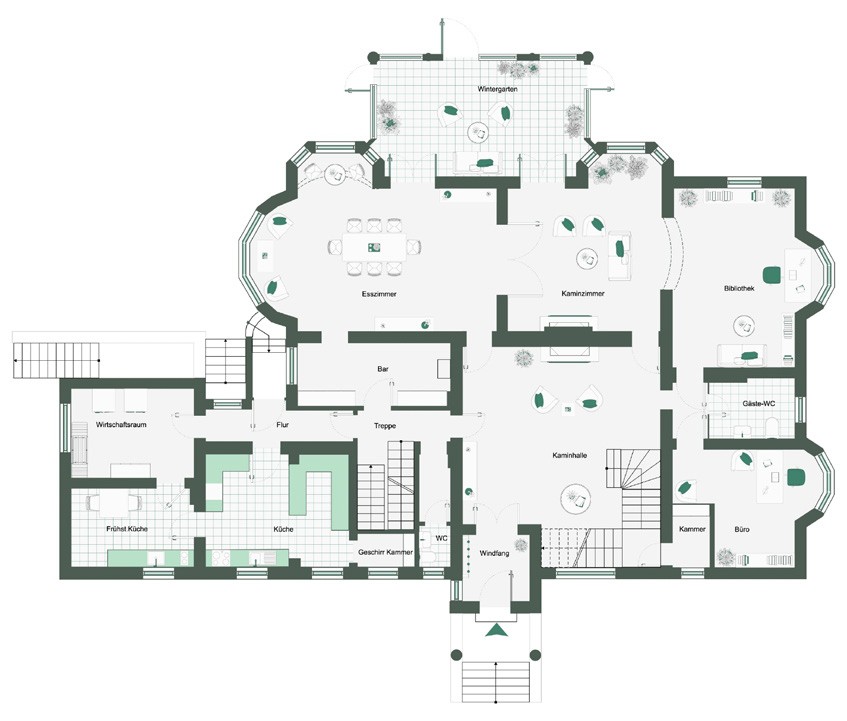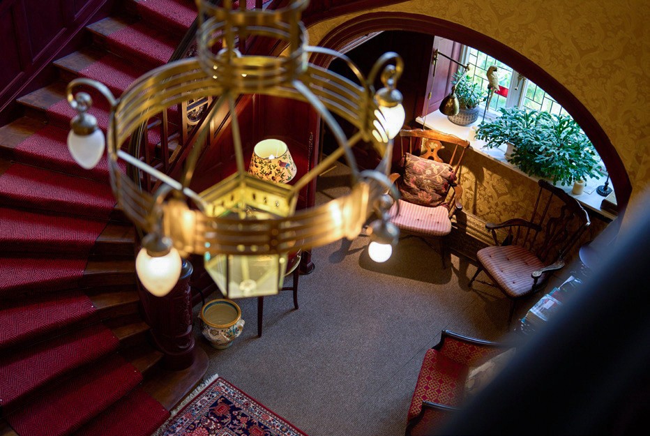 Il cuore della casa è l’ingresso con un’altezza del soffitto di circa 7,5 metri e una scala rappresentativa. Numerosi dettagli originali sono stati conservati nelle stanze, tra cui camini, soffitti decorati, pannellature e lavori in legno. La biblioteca, la sala da pranzo e la veranda offrono una vista sul giardino e sul lago. Gli ambienti mantengono il loro carattere storico ma sono funzionali per le esigenze quotidiane odierne.