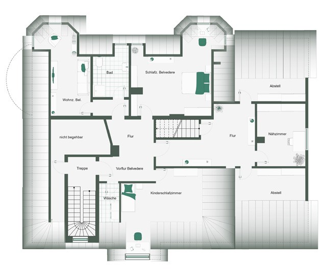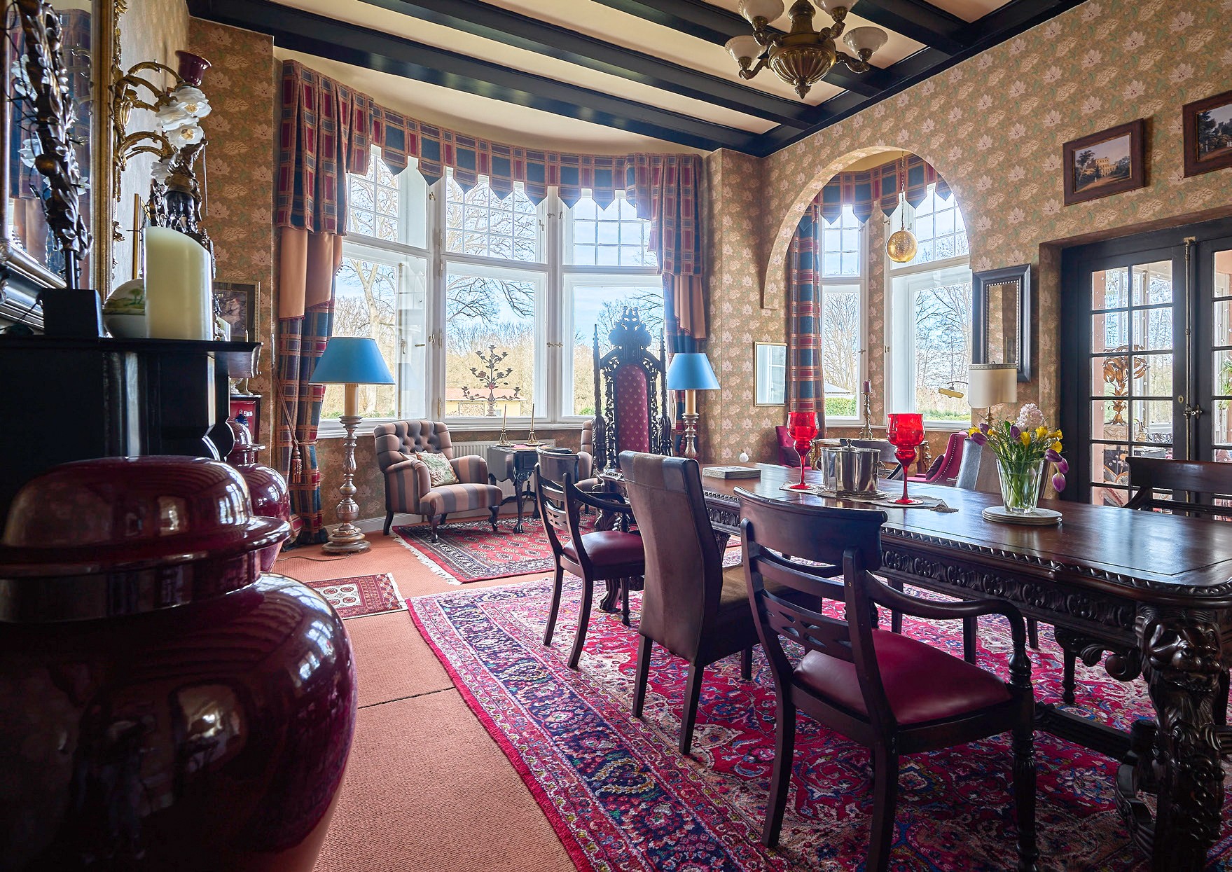 Il piano mansardato con le sue torrette sporgenti è un elemento architettonico marcante che offre una bella vista sulla proprietà e sull’ambiente circostante.