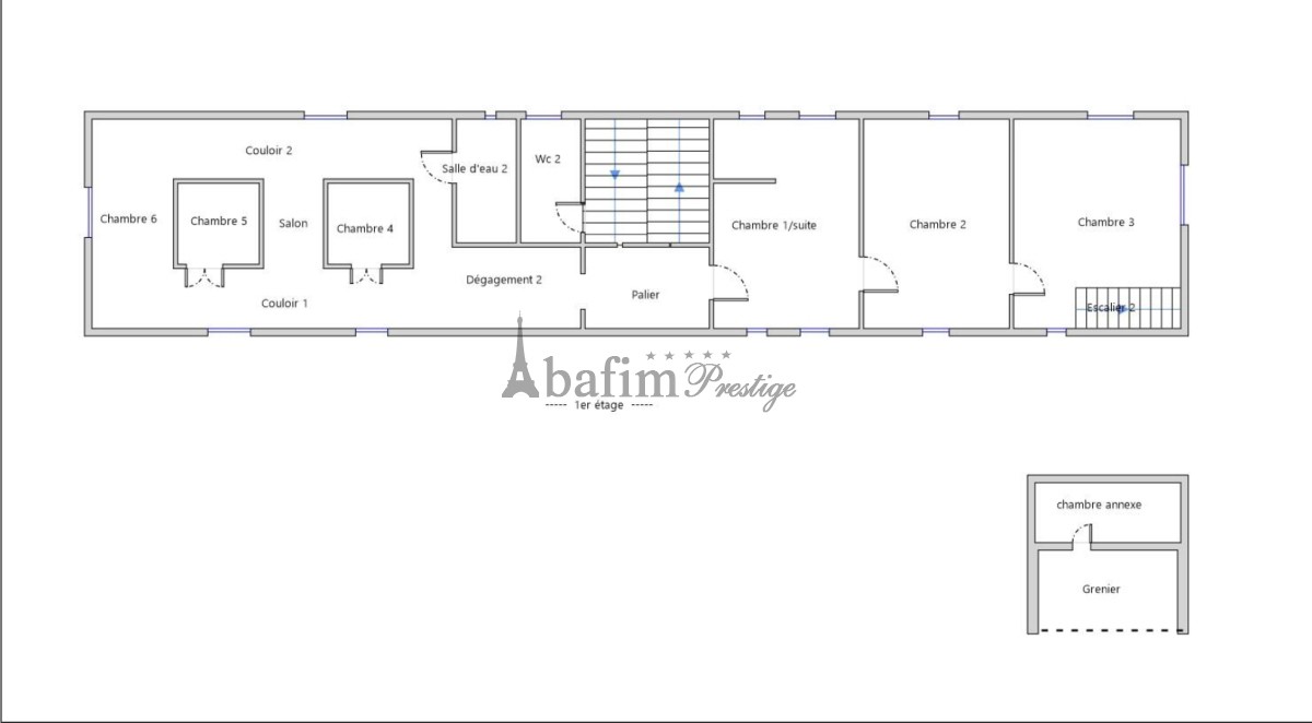 A sinistra del corridoio, la prima camera da letto di oltre 30 m² dispone di un bagno privato. Due altre camere di 26 e 29 m² sono a vostra disposizione. Nell'ultima suite, una scala conduce a un terzo bagno (con vasca, doccia e WC). Un piccolo corridoio accanto al bagno porta a un garage funzionale di 43 m², che ospita anche la lavanderia.