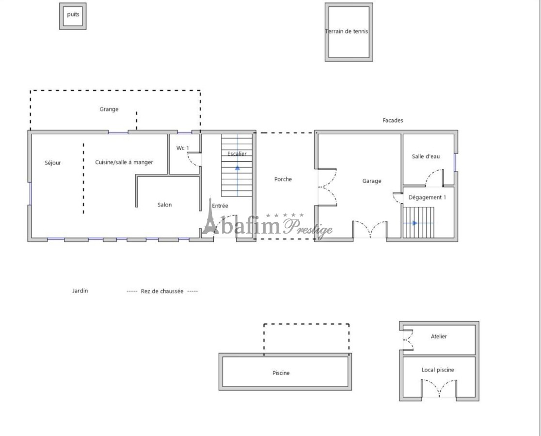 L'ingresso è composto da un piccolo vestibolo che conduce alle scale e da un piccolo salotto di 14 m². La zona giorno (34 m²) include una sala da pranzo, una cucina attrezzata (con piano cottura, forno e lavello) e un'isola centrale. Dietro il camino con grill integrato si trova la cucina molto luminosa (con un secondo lavello e una lavastoviglie), caratterizzata da travi a vista.