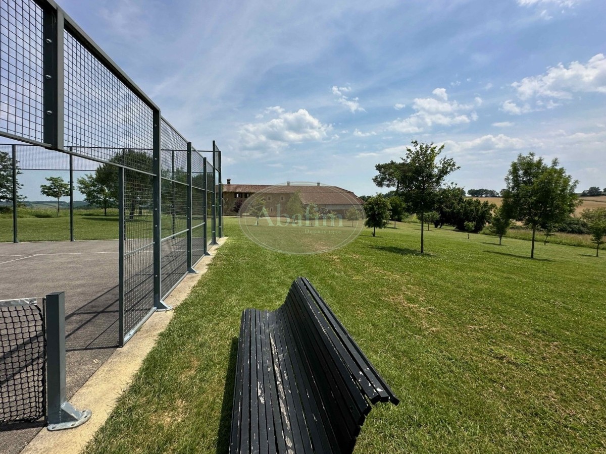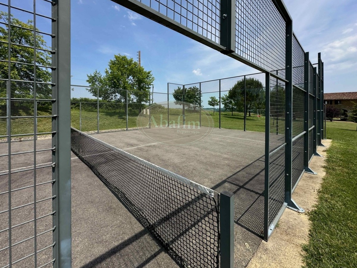 Il terreno di 3 ettari comprende un parco con alberi giovani, un raro campo da padel privato, una piscina di 4 x 12 metri con filtro a sale, un prato fiorito e un piccolo bosco che può fornire legna per gran parte dell'anno. Un pozzo con pompa e quattro uscite, collegato alla rete idrica urbana, consente l'irrigazione strategica in diversi punti del parco.