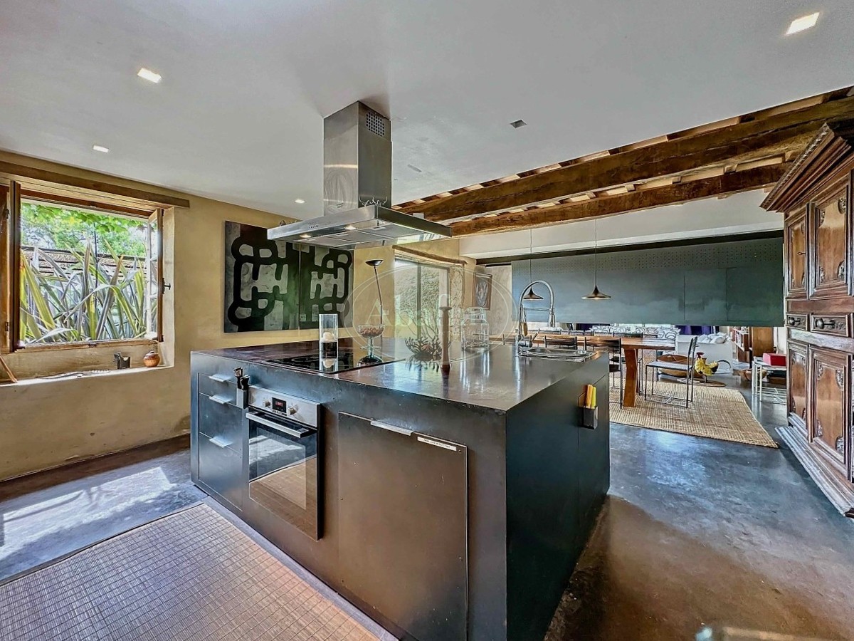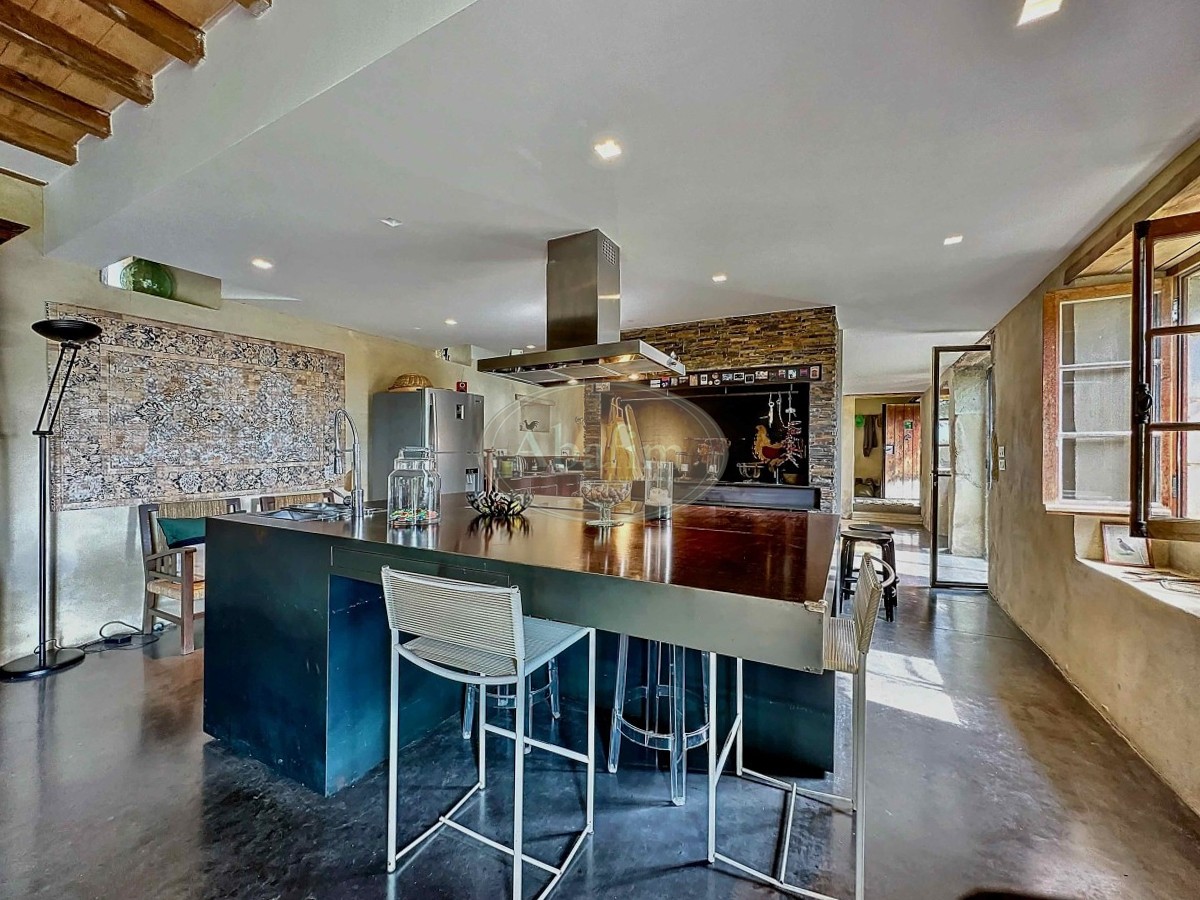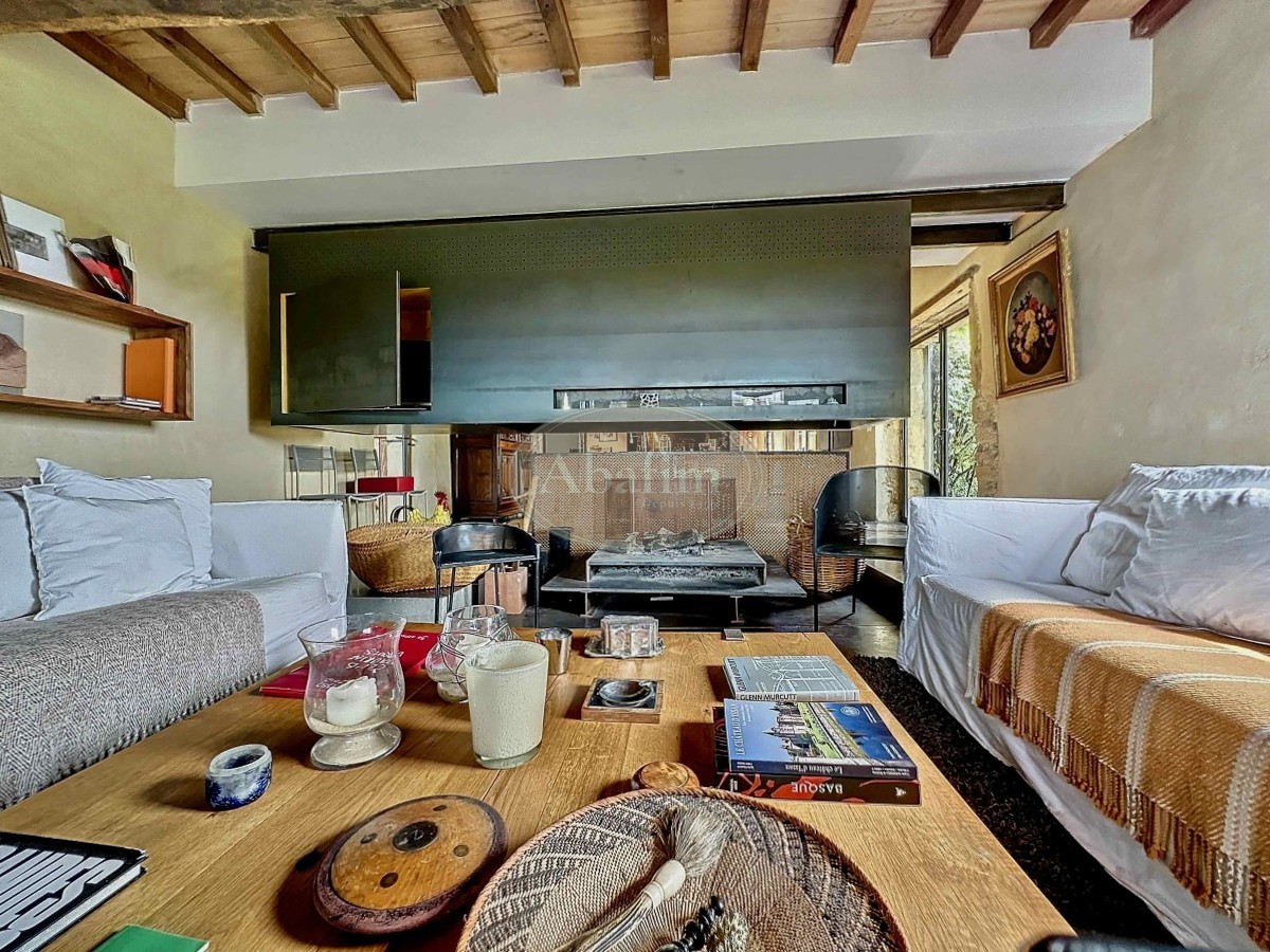 Due gradini più in basso si trova un accogliente soggiorno di 34 m², separato dalla zona pranzo-soggiorno da un grande camino in metallo, permettendo di godere del fuoco aperto in entrambi gli ambienti. Il pavimento è in cemento cerato (con riscaldamento a pavimento), e diverse porte-finestre conducono a splendide terrazze, sia aperte che coperte, orientate a est, sud e ovest, offrendo la possibilità di godere del sole o dell'ombra, del caldo o del fresco in ogni momento della giornata.