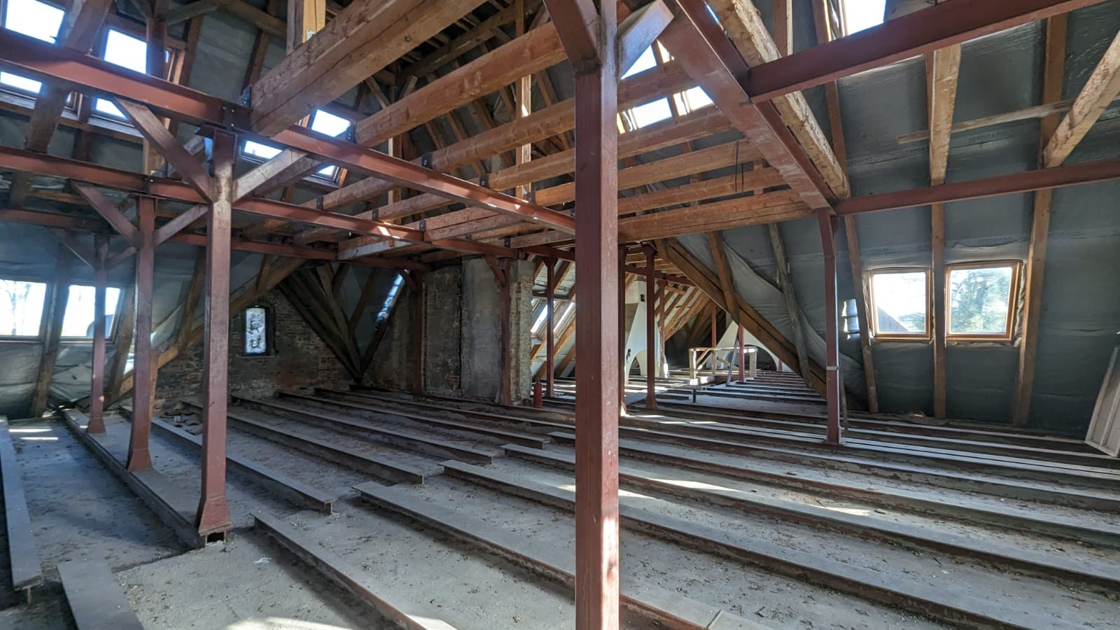 Il castello ha un seminterrato e offre una superficie utilizzabile di 1.823,83 metri quadrati. È stato parzialmente ristrutturato, in particolare le sale rappresentative al piano terra e la facciata. Al piano terra c'è un ampio salone con camino. Le grandi finestre offrono una vista sul giardino e sugli edifici annessi. Il cuore è la sala da ballo con accesso alla terrazza e al parco. Ci sono anche camere da letto, una cucina, bagni e altri spazi qui. I piani superiori sono stati preparati per il completamento, con spazi aperti creati, vecchi intonaci e impianti rimossi, e soffitti rinforzati.