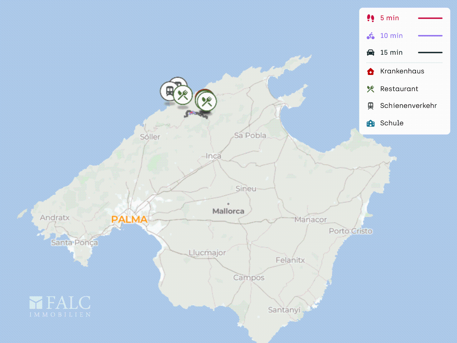 Il villaggio più vicino è raggiungibile in circa 10 minuti di auto. Nelle vicinanze di Lluc si trovano una farmacia, una clinica e l’Escolania de Lluc come offerta scolastica. Le spiagge naturali di Cala Tuent e Platja del Torrent de Pareis si trovano a pochi chilometri e sono tra i tratti costieri più spettacolari dell’isola. L’aeroporto di Palma di Maiorca è raggiungibile in circa un’ora, a seconda del percorso.