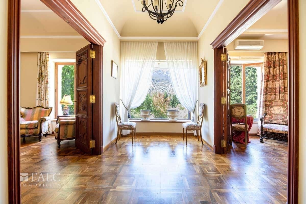 La proprietà comprende la casa principale, due case per gli ospiti indipendenti e ulteriori edifici accessori, tra cui una serra e garage. La superficie totale costruita è di circa 1.522 m².