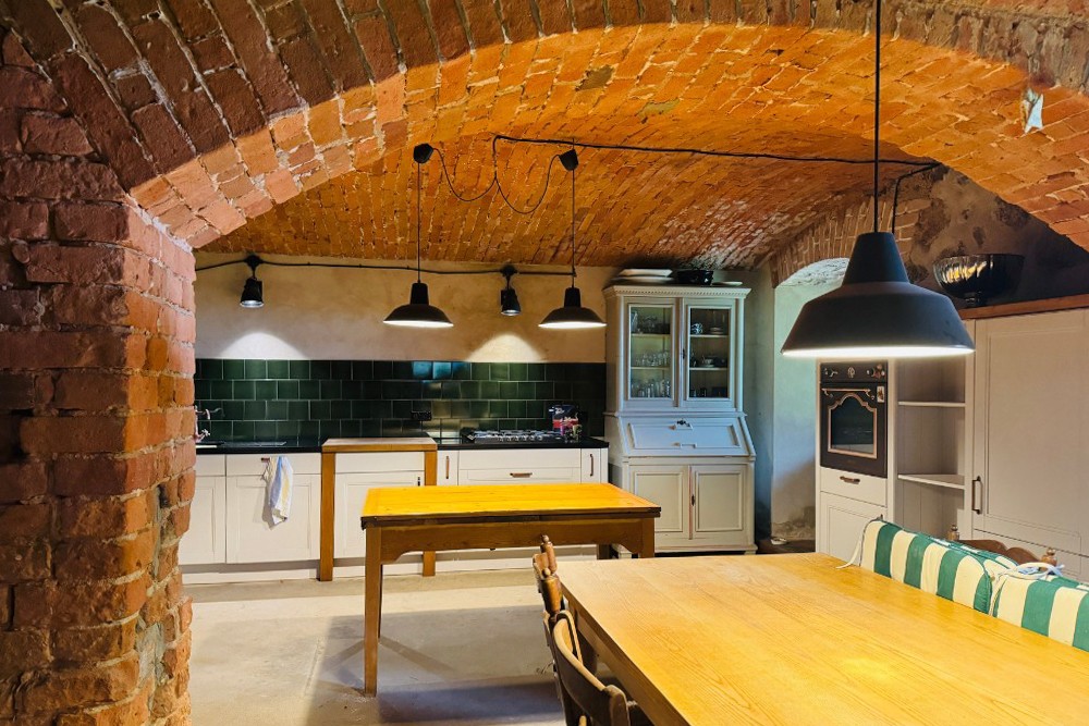 La metà della villa in vendita si apre su interni accuratamente restaurati. Nel seminterrato voltato si conserva la storica cucina del palazzo con una accogliente stufa in ghisa. Al piano terra è stato completato un piccolo appartamento per ospiti con bagno privato; accanto si trovano cucina, sala da pranzo e salone che si aprono su una terrazza quasi ultimata. Al primo piano ci sono diverse camere da letto e un’area ospiti indipendente collegata al suggestivo vano della torre, attualmente utilizzato come camera da letto. Questo piano offre anche ampie possibilità di ampliamento.