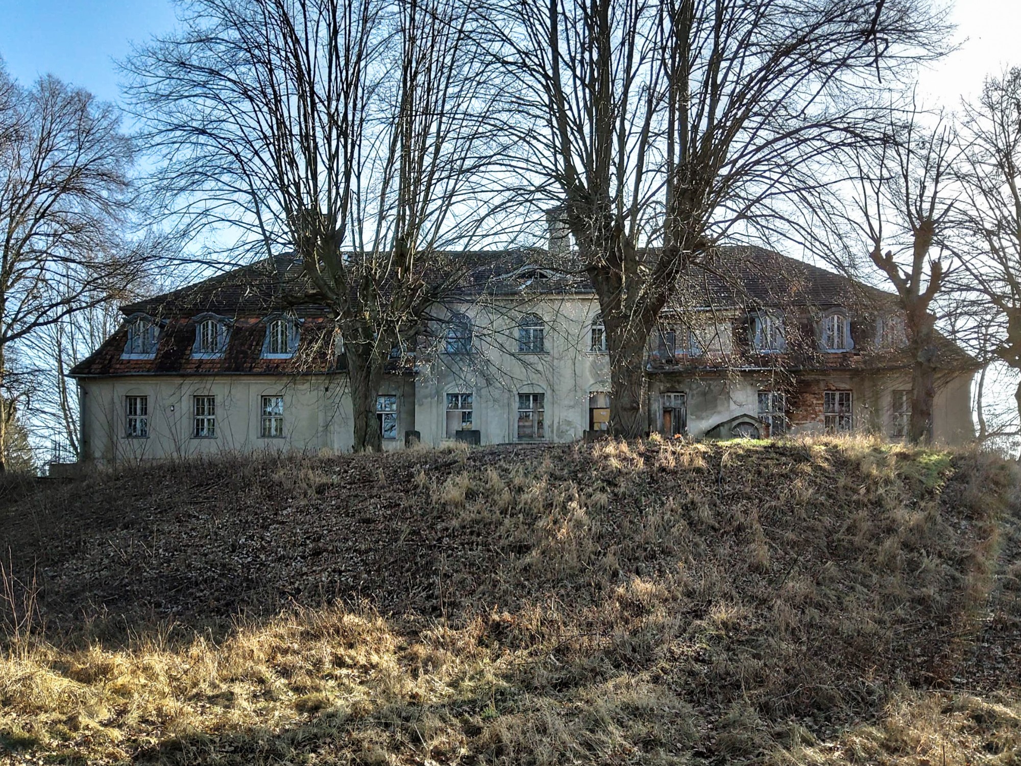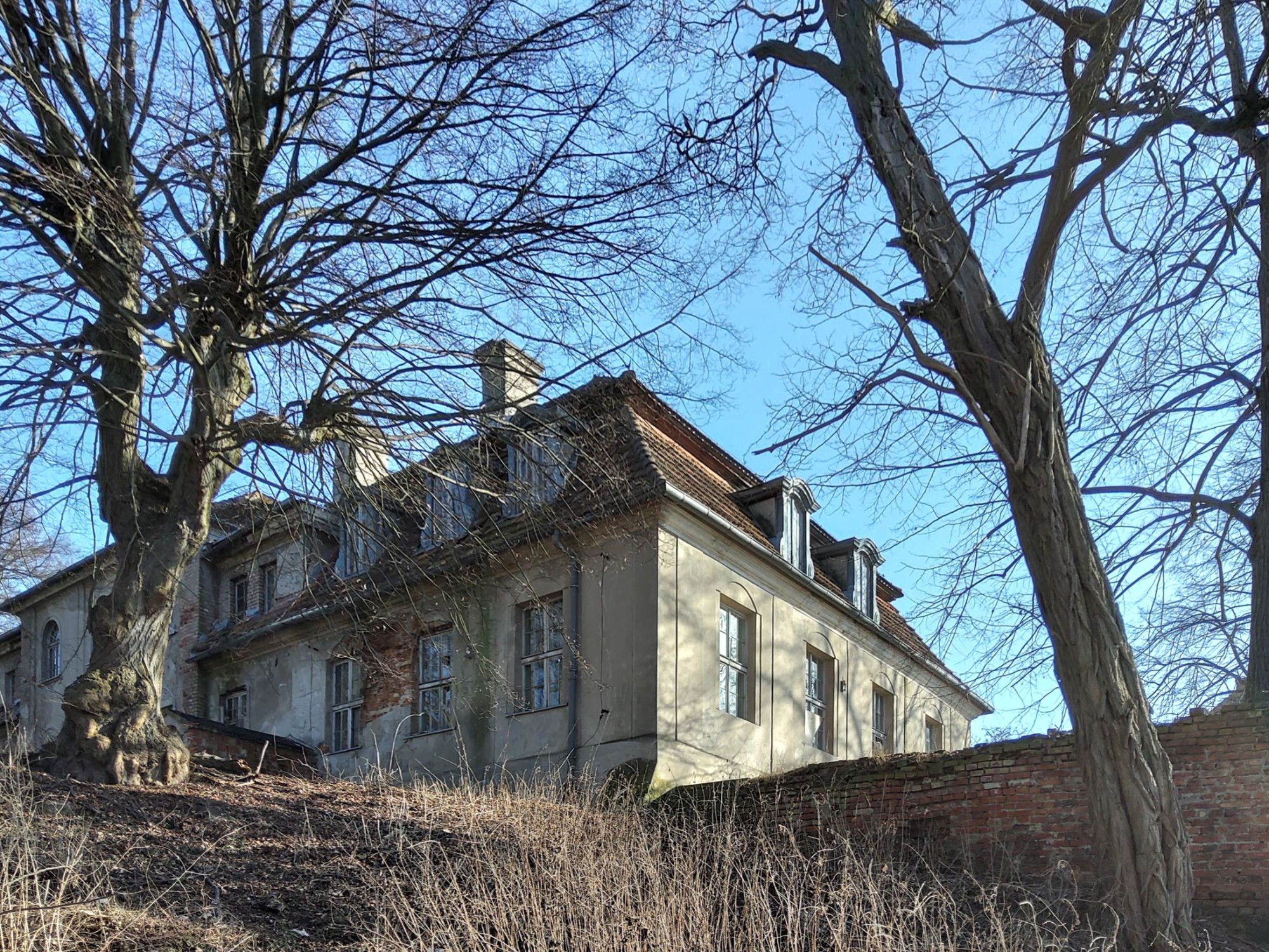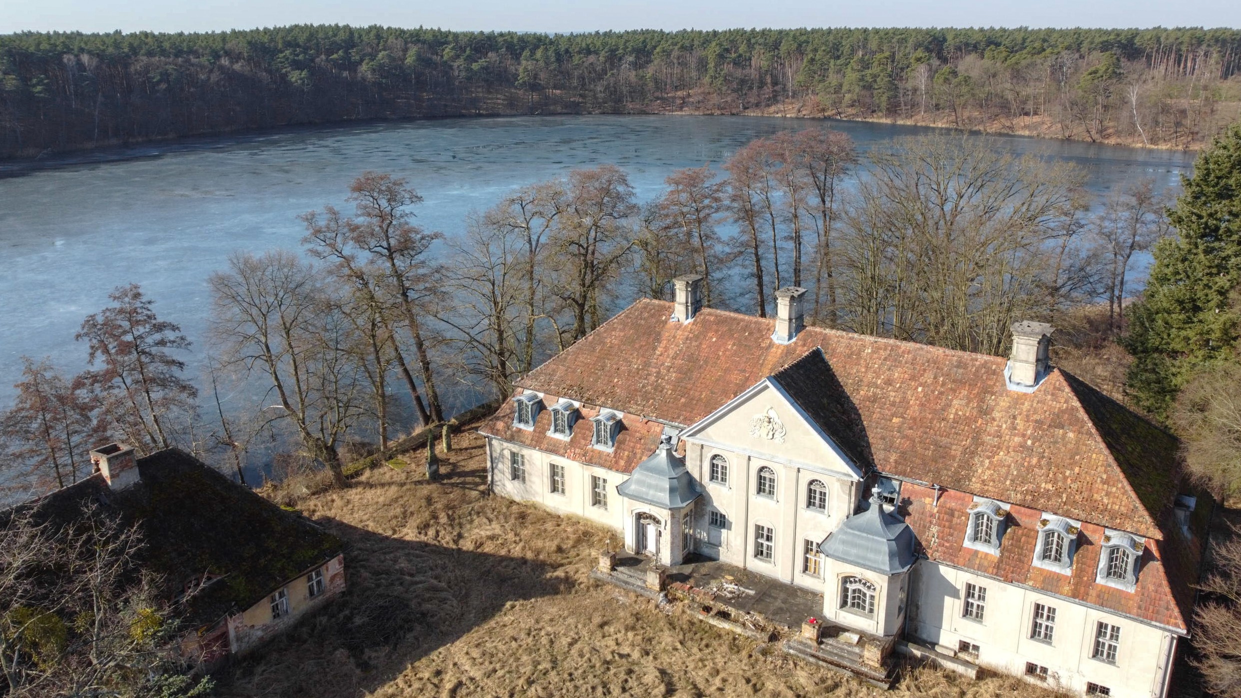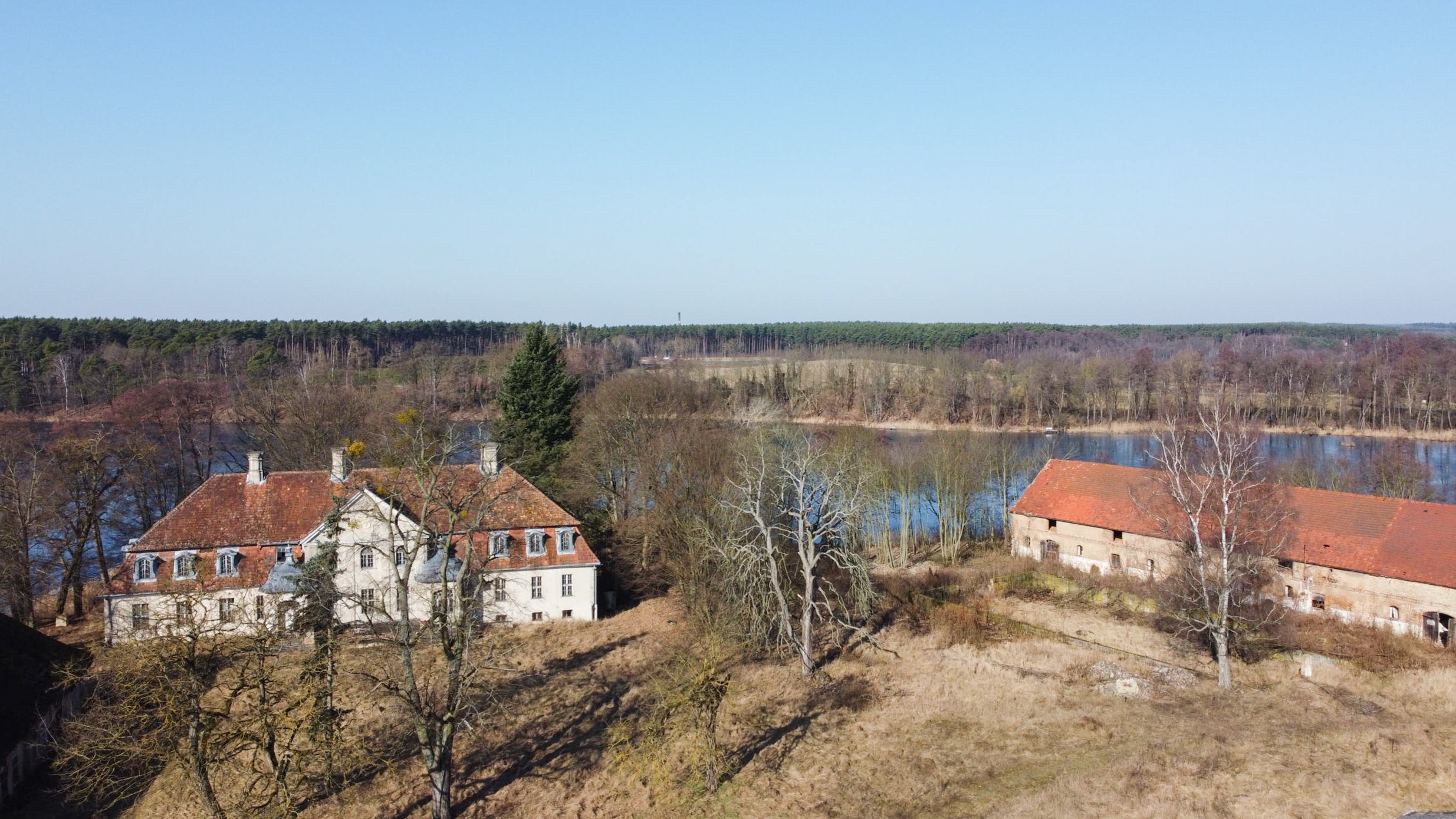 Questa tenuta storica si trova su una penisola privata di circa 30.000 m² nella voivodina di Lubusz, direttamente sul lago e circondata da un parco storico con querce e faggi secolari. Le origini risalgono al XIII secolo, con diverse epoche costruttive ancora visibili, tra cui volte gotiche e un portale barocco. Negli anni ’80 sono stati rinnovati soffitti e scale in cemento. Da allora gli interni sono allo stato grezzo e richiedono una completa ristrutturazione.