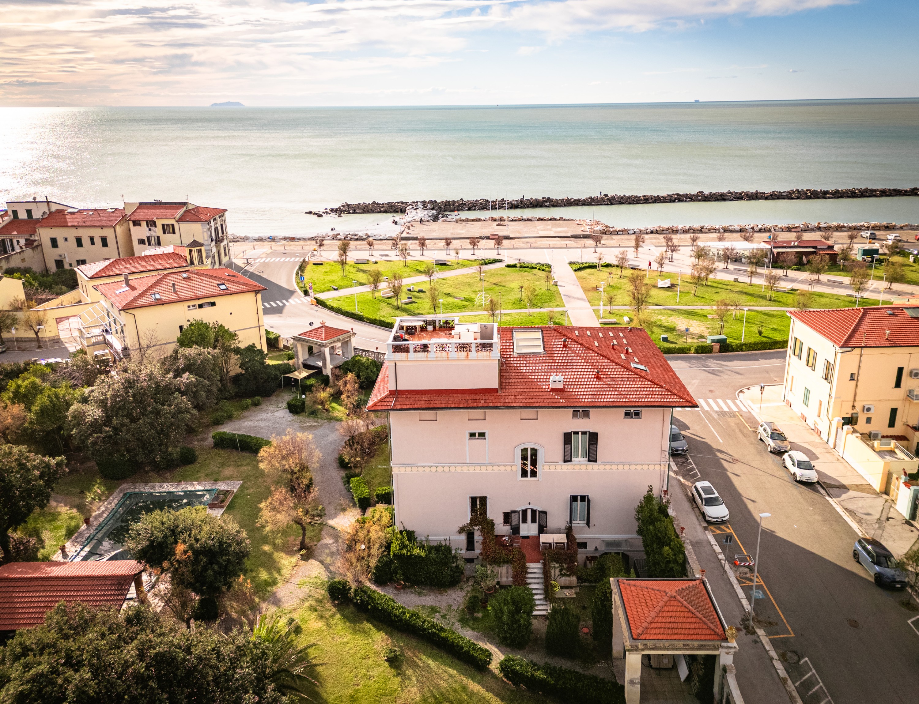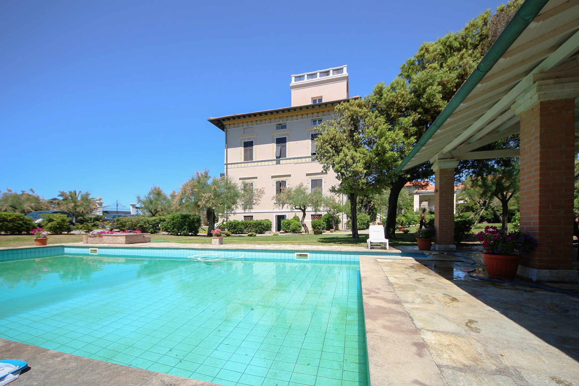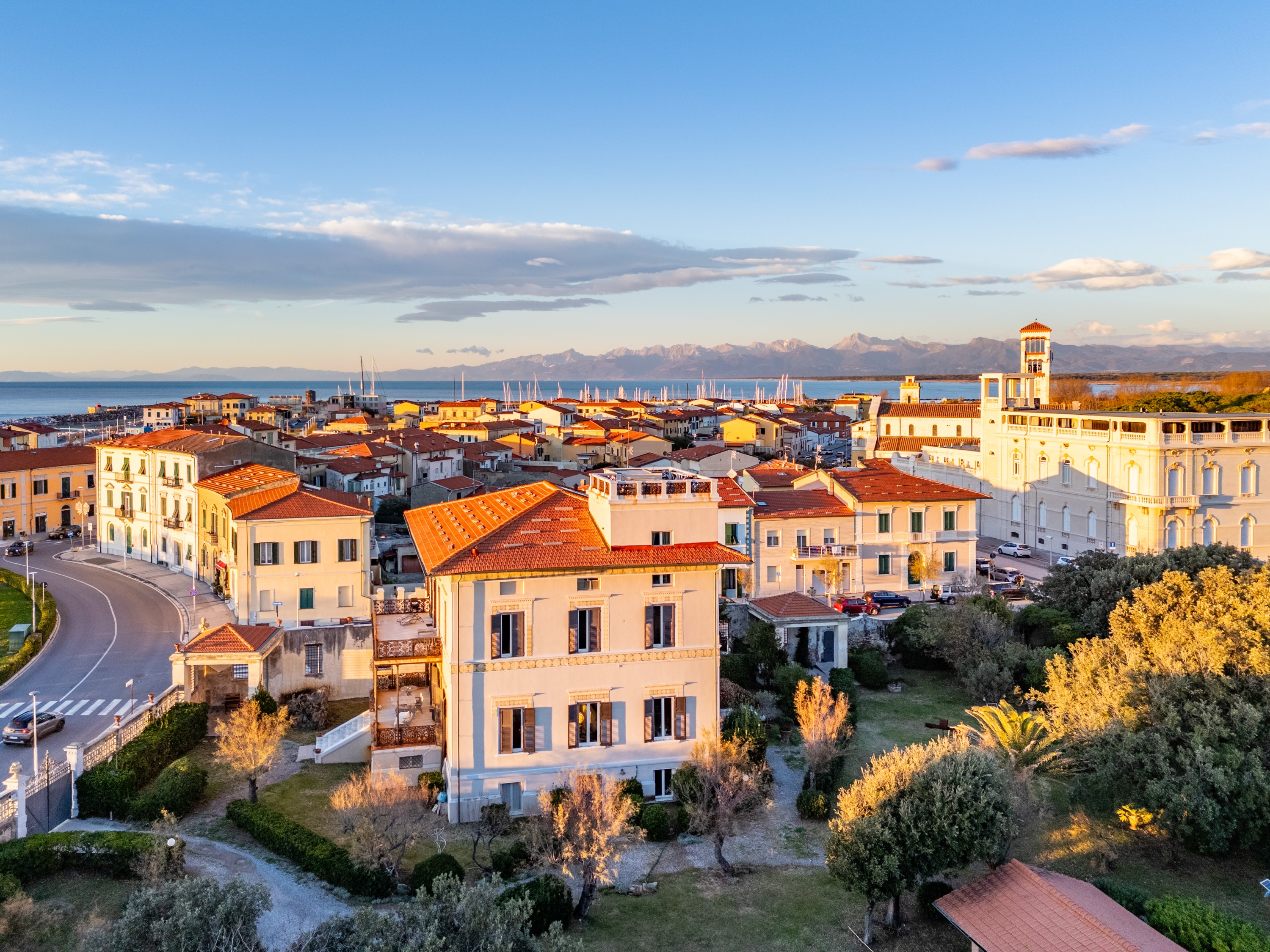 Villa Bondi appartiene alle Dimore Storiche D'Italia, è un esempio di eleganza senza tempo, immersa nella bellezza di Marina di Pisa. Qui ogni dettaglio è pensato per offrire comfort, privacy e relax, con spazi raffinati e una vista incantevole. La dimora conserva pregevoli decorazioni in maiolica attribuibili alla Manifattura di Signa, storica fabbrica ceramica attiva tra Otto e Novecento e legata alla famiglia proprietaria della Villa Bondi, che conferiscono alla residenza un particolare valore decorativo e testimoniano il gusto artistico dell’epoca. La Villa, di circa 1016 mq circondata da un giardino di 3.500 mq con piscina, fu edificata fra il 1905 e il 1909 dalla famiglia Bondi, commercianti fiorentini, fondatori nel 1888 della Manifattura di Signa a Firenze, da cui provengono le ceramiche che contornano le finestre della villa e i cornicioni. All'interno della villa e nel parco invece sono ancora conservati vasi decorati, bassorilievi e busti di ispirazione neoclassica. La proprietà è suddivisa in quattro unità immobiliari, ognuna dotata di ingresso indipendente, e si distingue per spazi generosi, funzionalità e massima privacy. L’unità principale, cuore della Villa, si sviluppa tra piano rialzato e primo piano e offre ambienti luminosi e perfettamente distribuiti. Al piano rialzato si trovano un’ampia cucina, una elegante sala da pranzo con camino, un luminoso soggiorno con patio esterno, uno studio e una camera ospiti con bagno privato. Il piano superiore ospita tre camere da letto, tre bagni, una funzionale stanza armadi, oltre a una pratica cucina di piano e una terrazza vista mare. La seconda unità, caratterizzata da un’atmosfera calda e riservata, si trova al livello mansardato ed è composta da cucina, una zona pranzo-soggiorno, due camere e due bagni. Infine il livello seminterrato ospita le restanti due unità, di cui una locata e adibita a studi medici, con ingresso indipendente, ideale per chi desidera coniugare abitazione e attività professionale, l’altra composta da cucina, camera e bagno, ideale come dépendance o alloggio di servizio. Allo stesso livello si trova poi un comodo locale tecnico. A completare la Villa, una torretta con vista panoramica che regala una prospettiva incantevole del mare, dei Monti Pisani e delle Alpi Apuane. L’accessibilità e comodità sono garantite dal pratico ascensore interno che collega tutti i piani principali. All’esterno, la proprietà è immersa in un giardino privato perfetto per relax, eventi e momenti di convivialità. La piscina, che misura 6x12 mq, è ideale per rinfrescarsi durante le calde giornate estive. Villa Bondi rappresenta una rara combinazione di lusso, funzionalità e versatilità, adatta sia a residenza privata che a utilizzo professionale o ricettivo. Ogni dettaglio della proprietà è studiato per offrire comfort, eleganza ed esclusività.