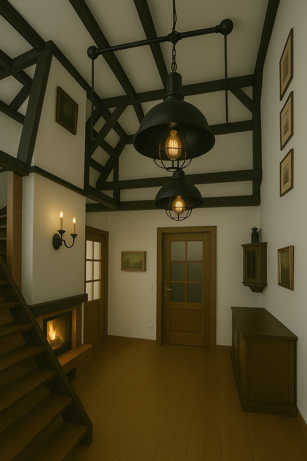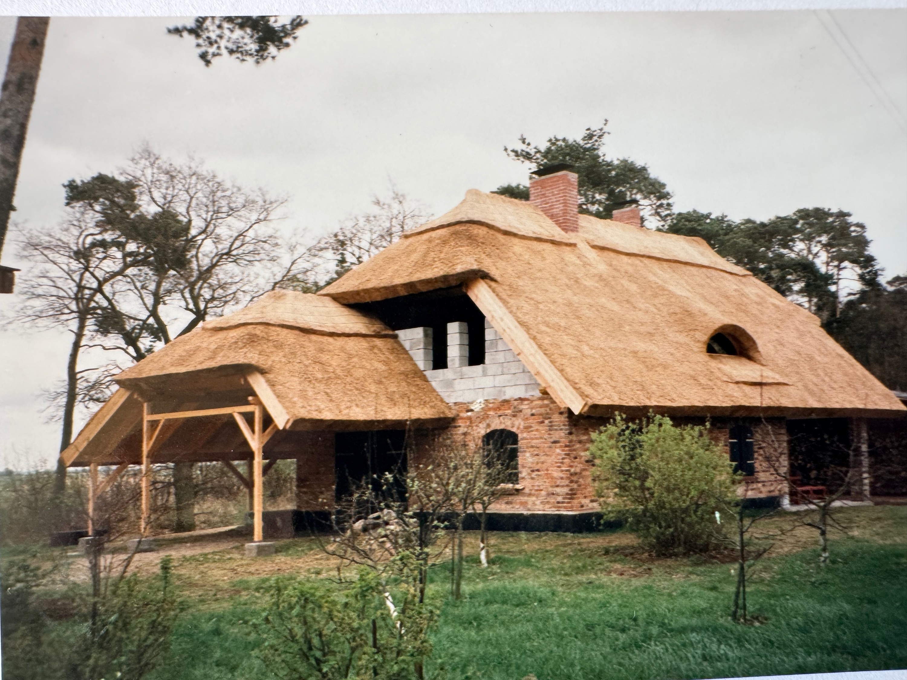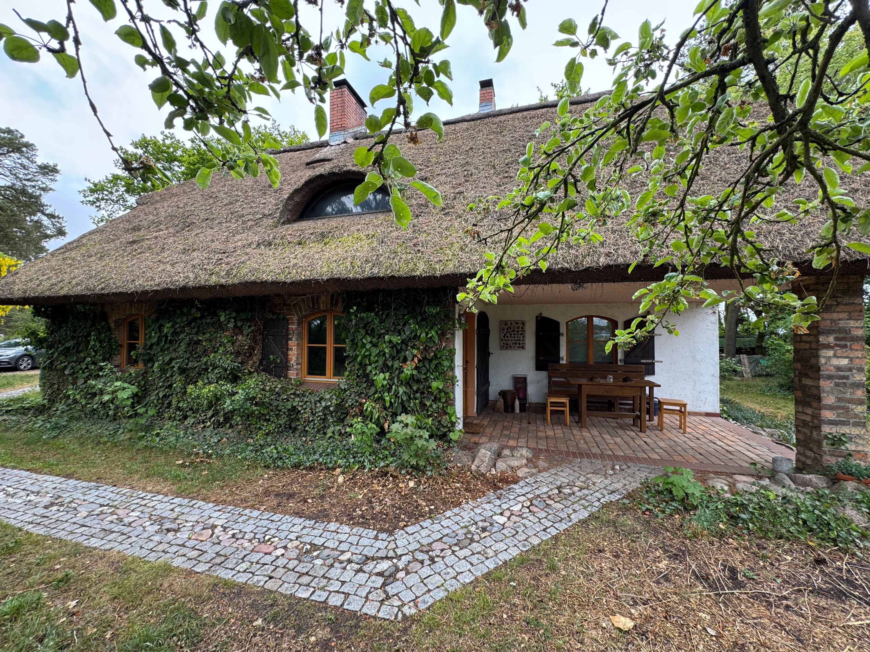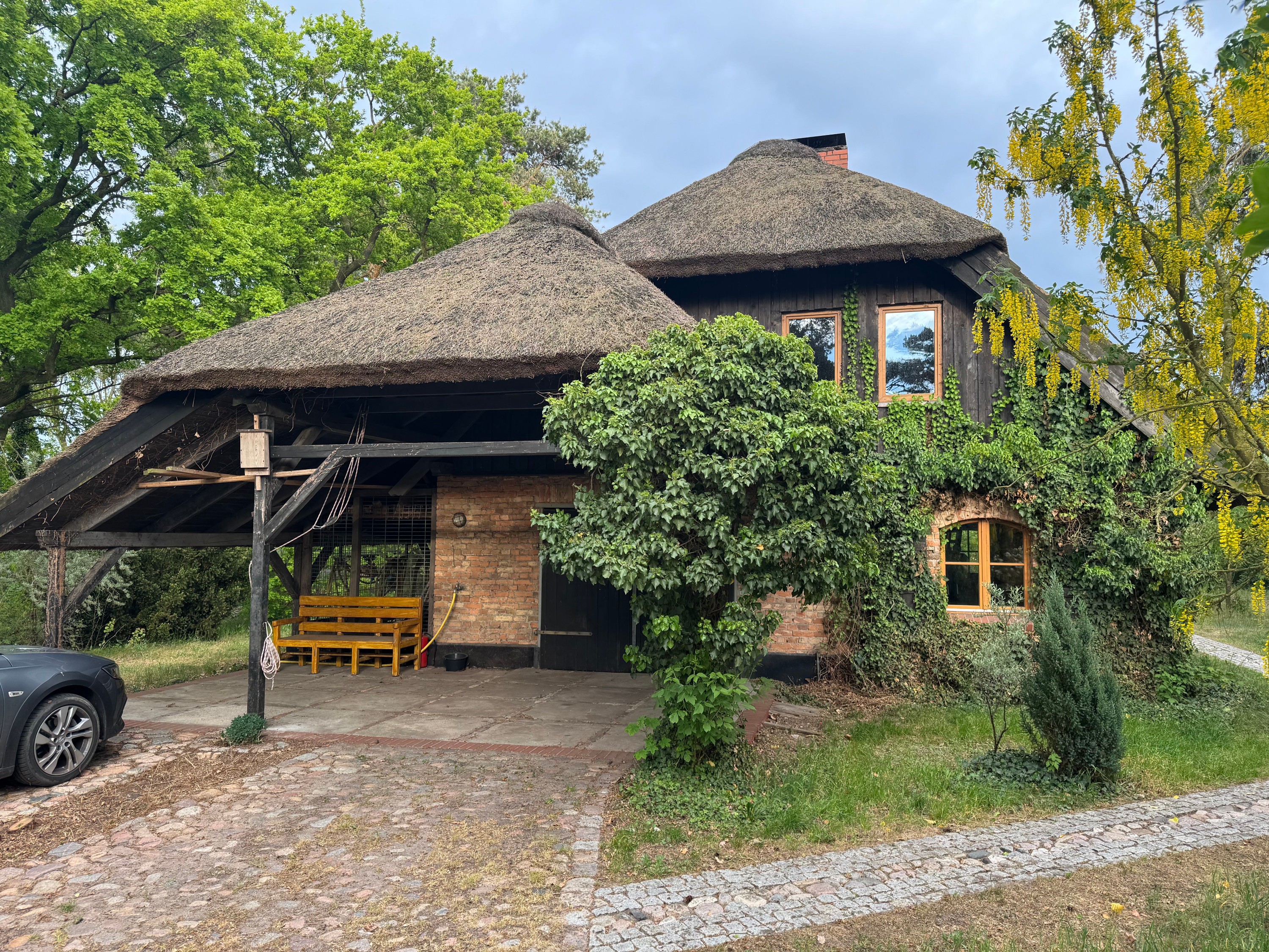 La solida muratura con finestre ad arco è stata realizzata utilizzando i mattoni originali ad alta cottura. La casa poggia su fondazioni in calcestruzzo completamente rinnovate con barriera orizzontale contro l’umidità. Un cordolo perimetrale in cemento armato, nascosto nella struttura, garantisce l’ancoraggio stabile della nuova copertura a capriate. Il tetto in paglia è stato realizzato secondo la tecnica tradizionale tipica della Pomerania Anteriore, cucito a mano e particolarmente resistente.