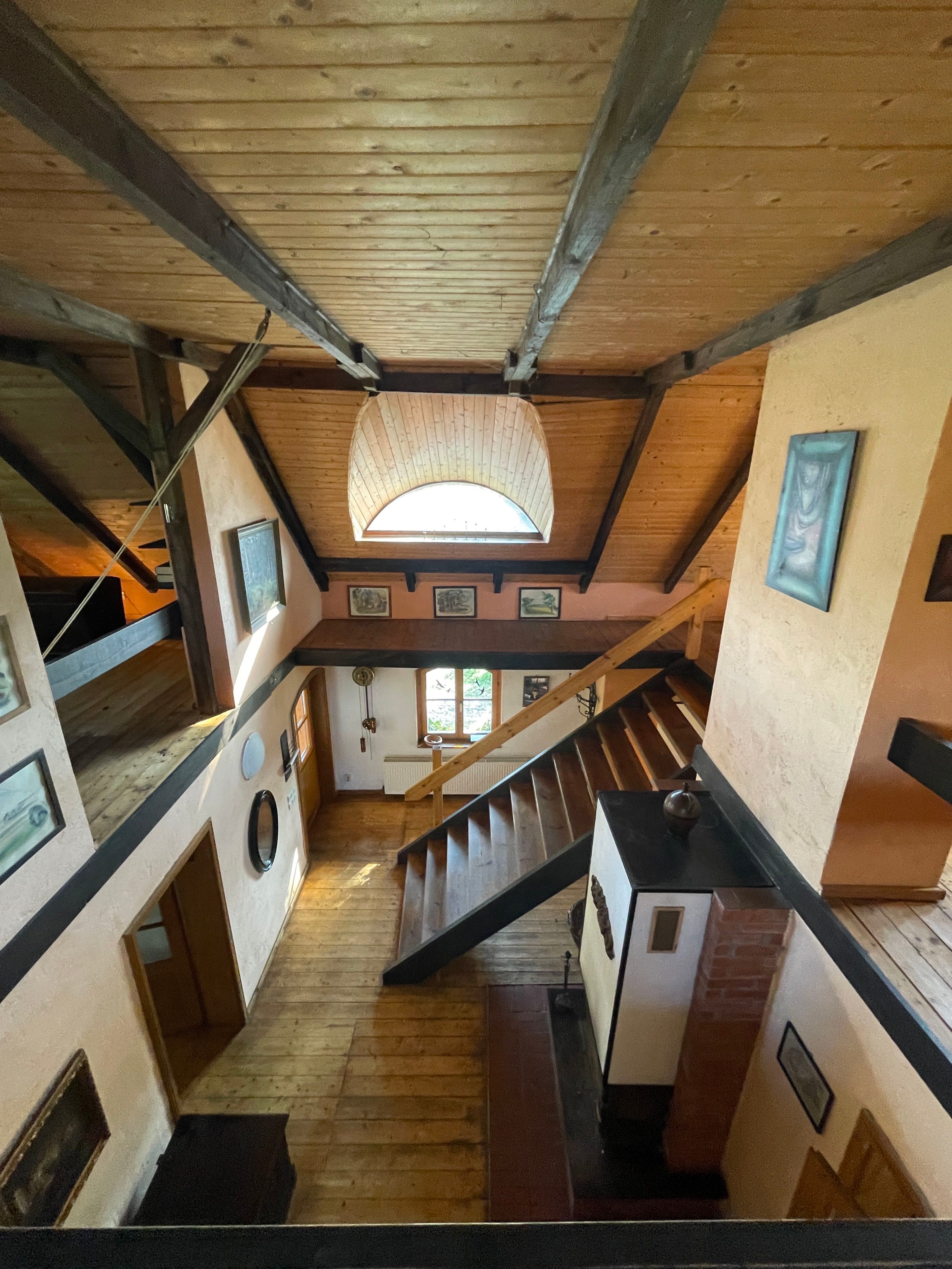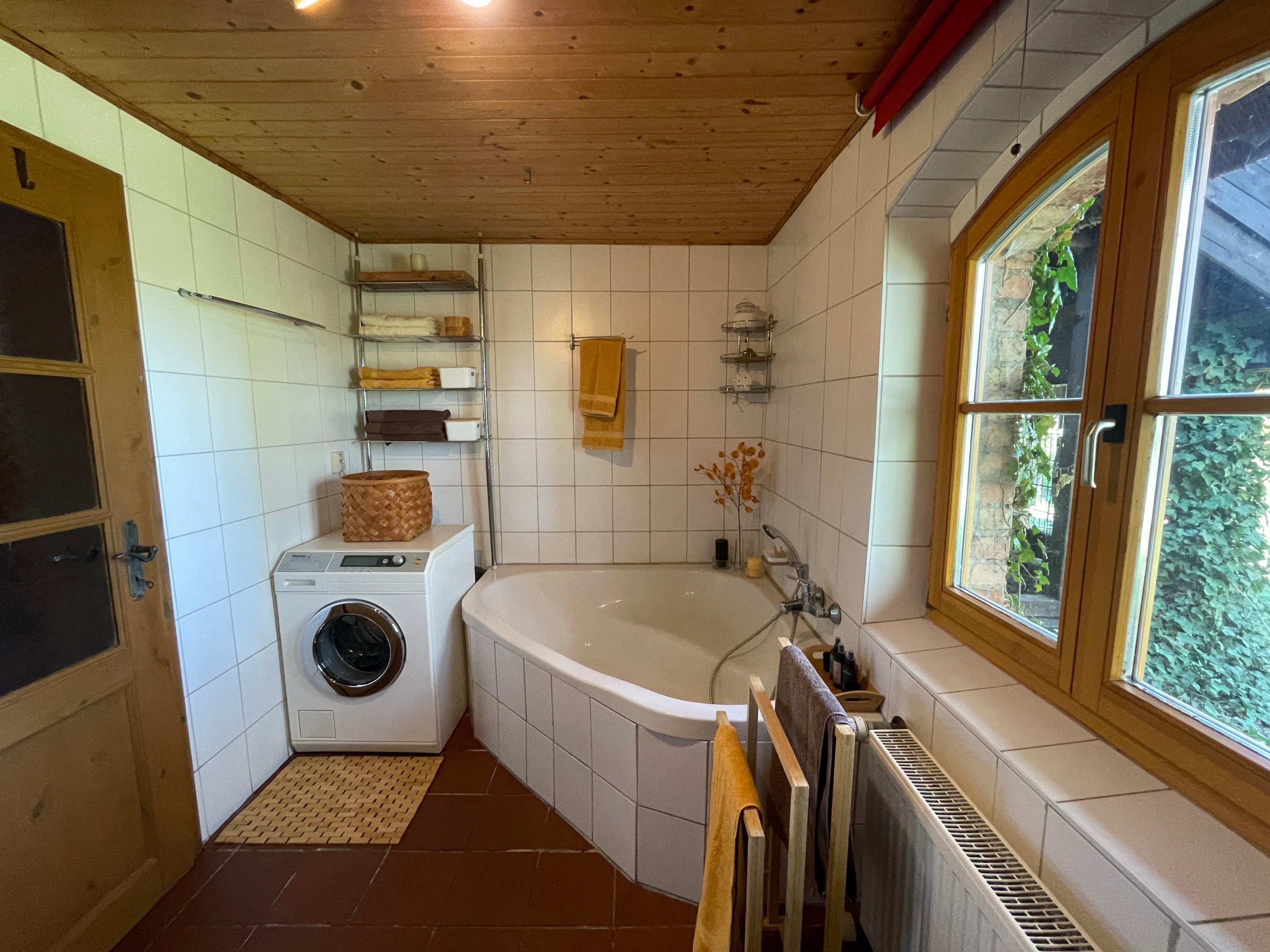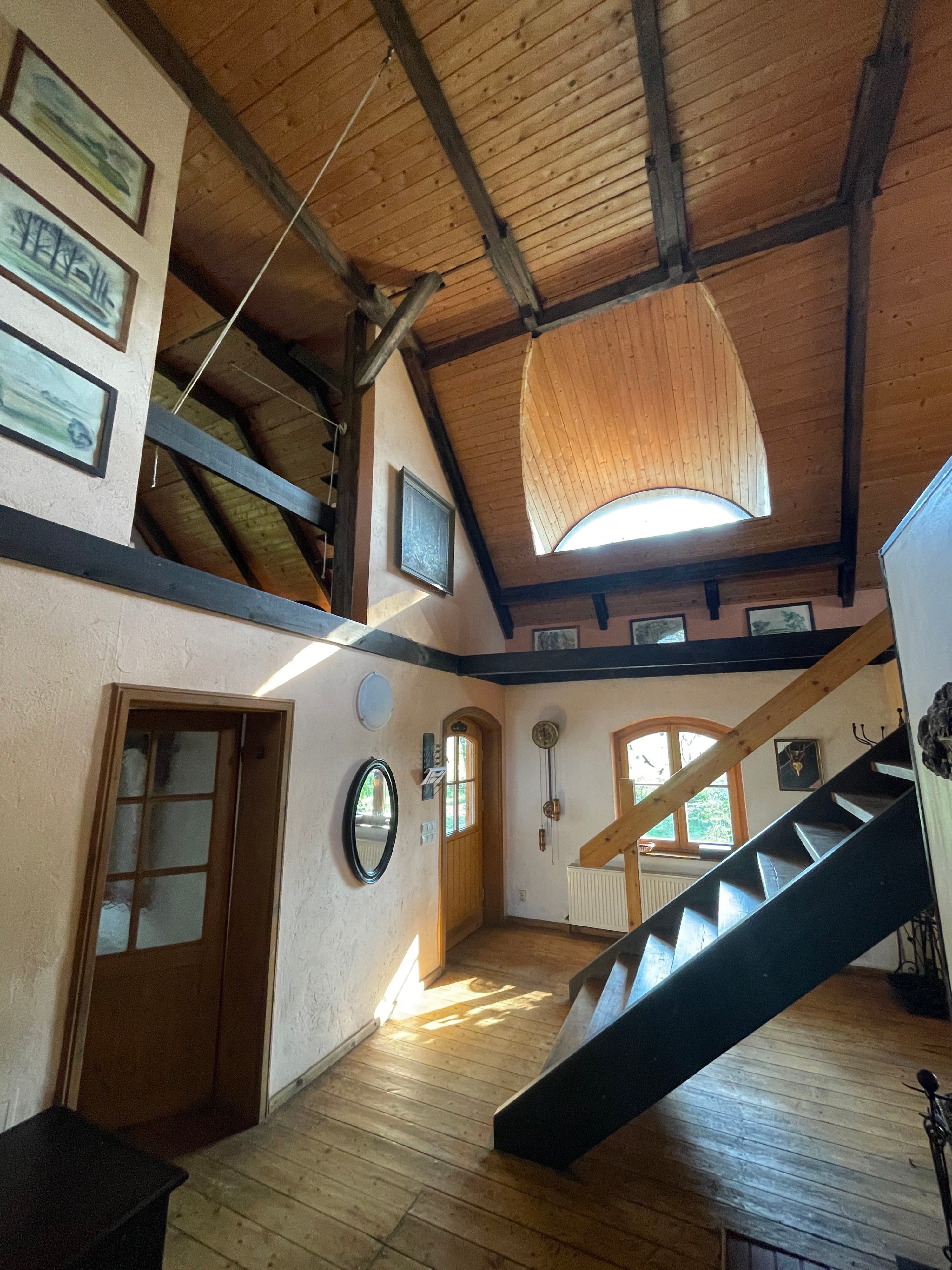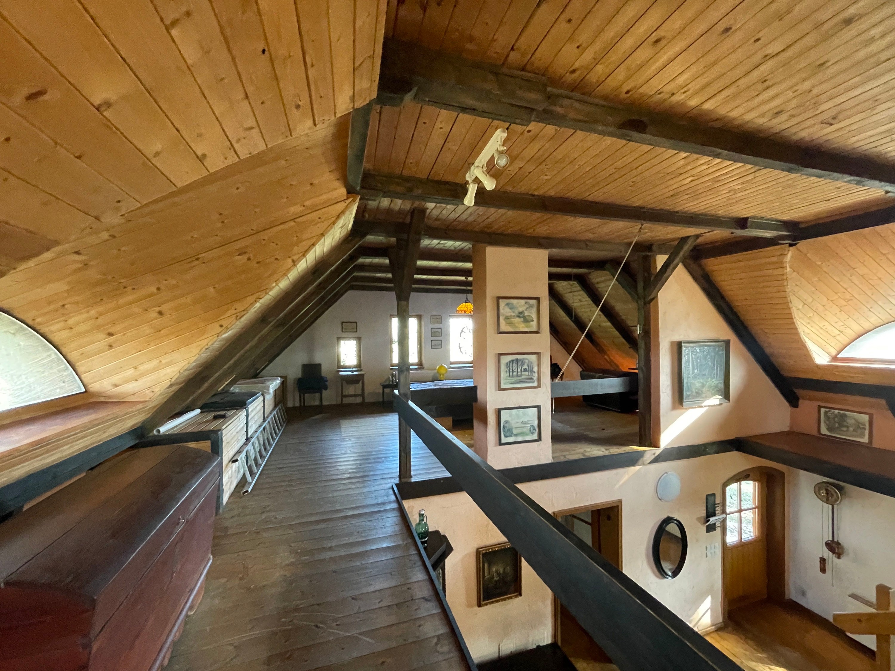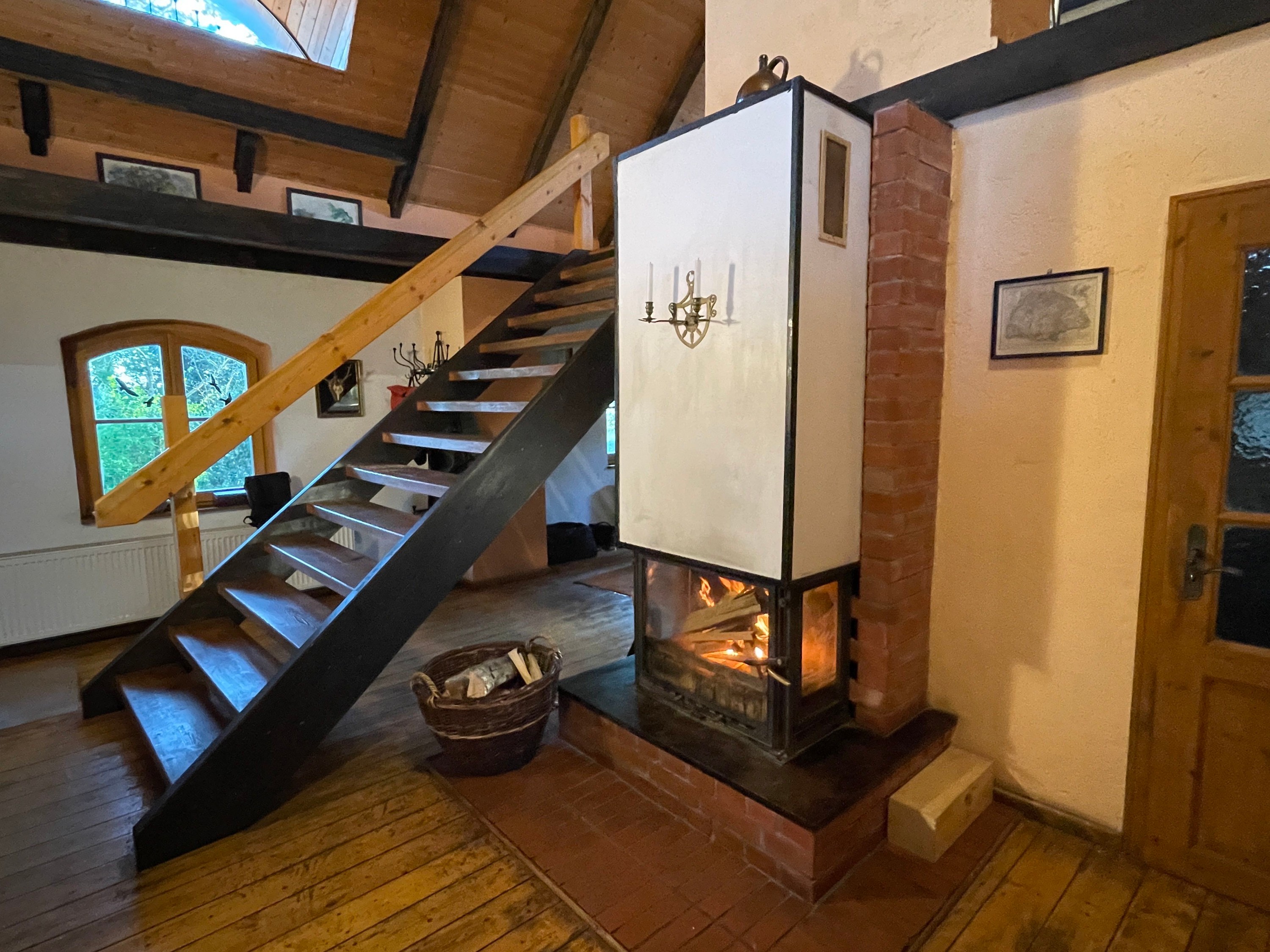 Dall’ingresso principale situato sulla terrazza si accede all’atrio con camino e vista aperta sul piano superiore, raggiungibile tramite un’ampia scala in legno autoportante. A sinistra della scala si trova l’accogliente soggiorno con vista sul giardino. Dall’atrio si accede inoltre alla cucina abitabile con un locale separato aggiuntivo, al bagno spazioso con vasca ad angolo e doccia, nonché al laboratorio con accesso alla cantina.