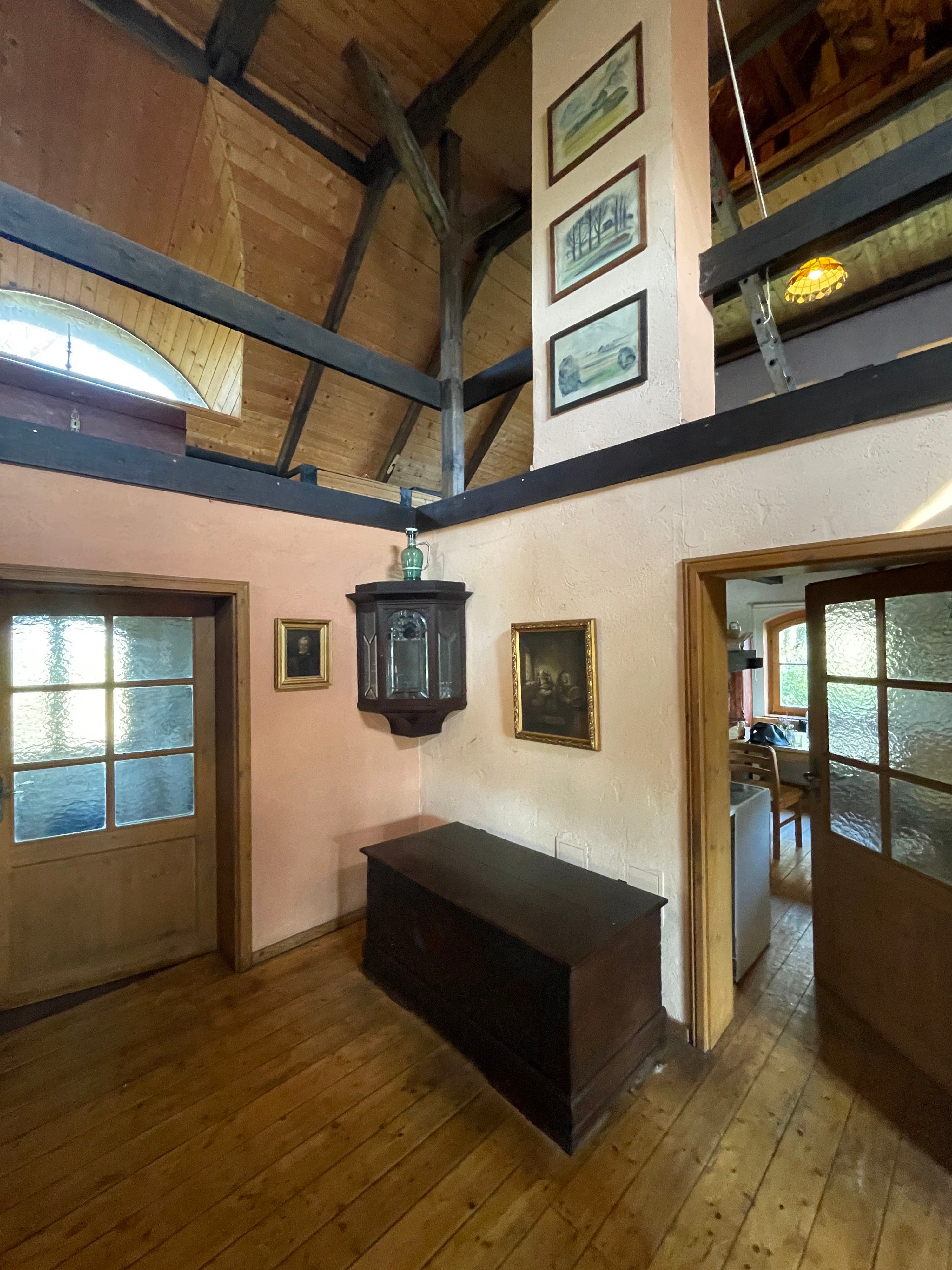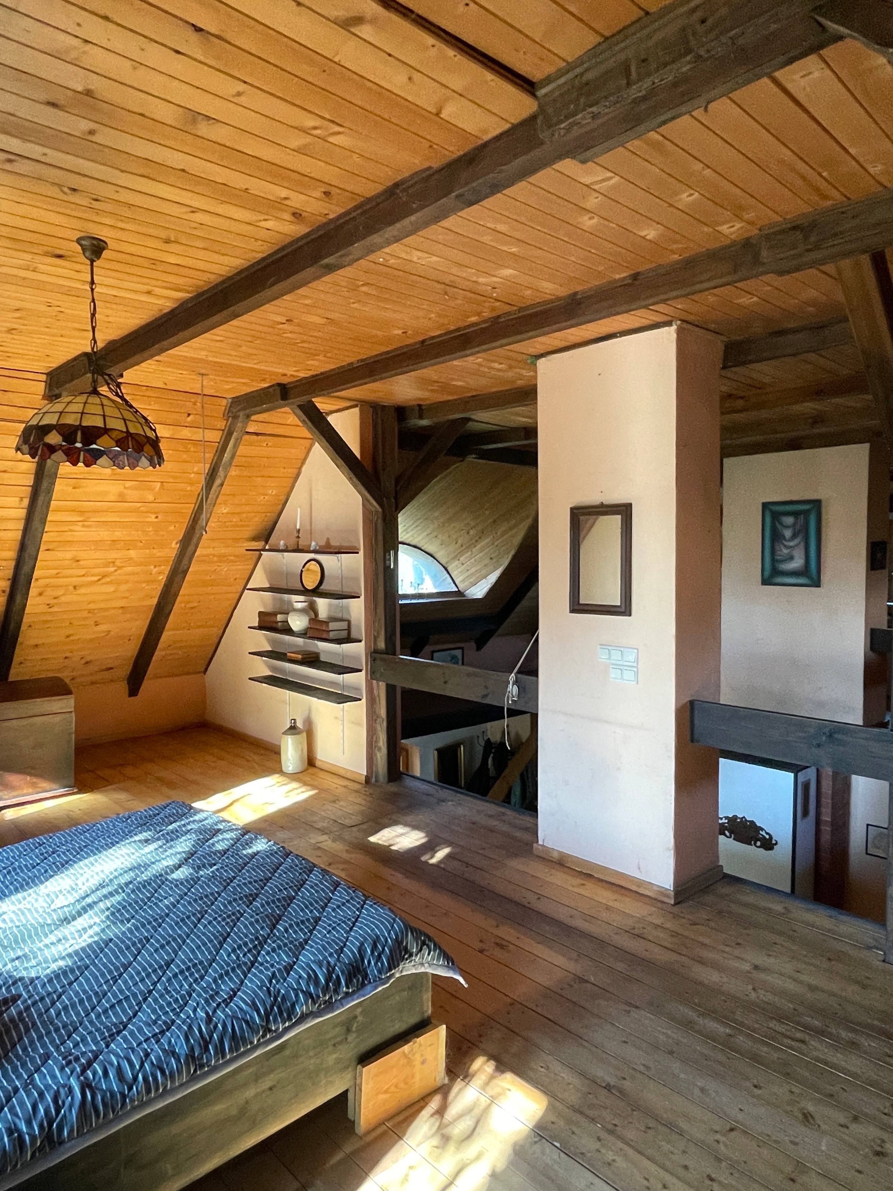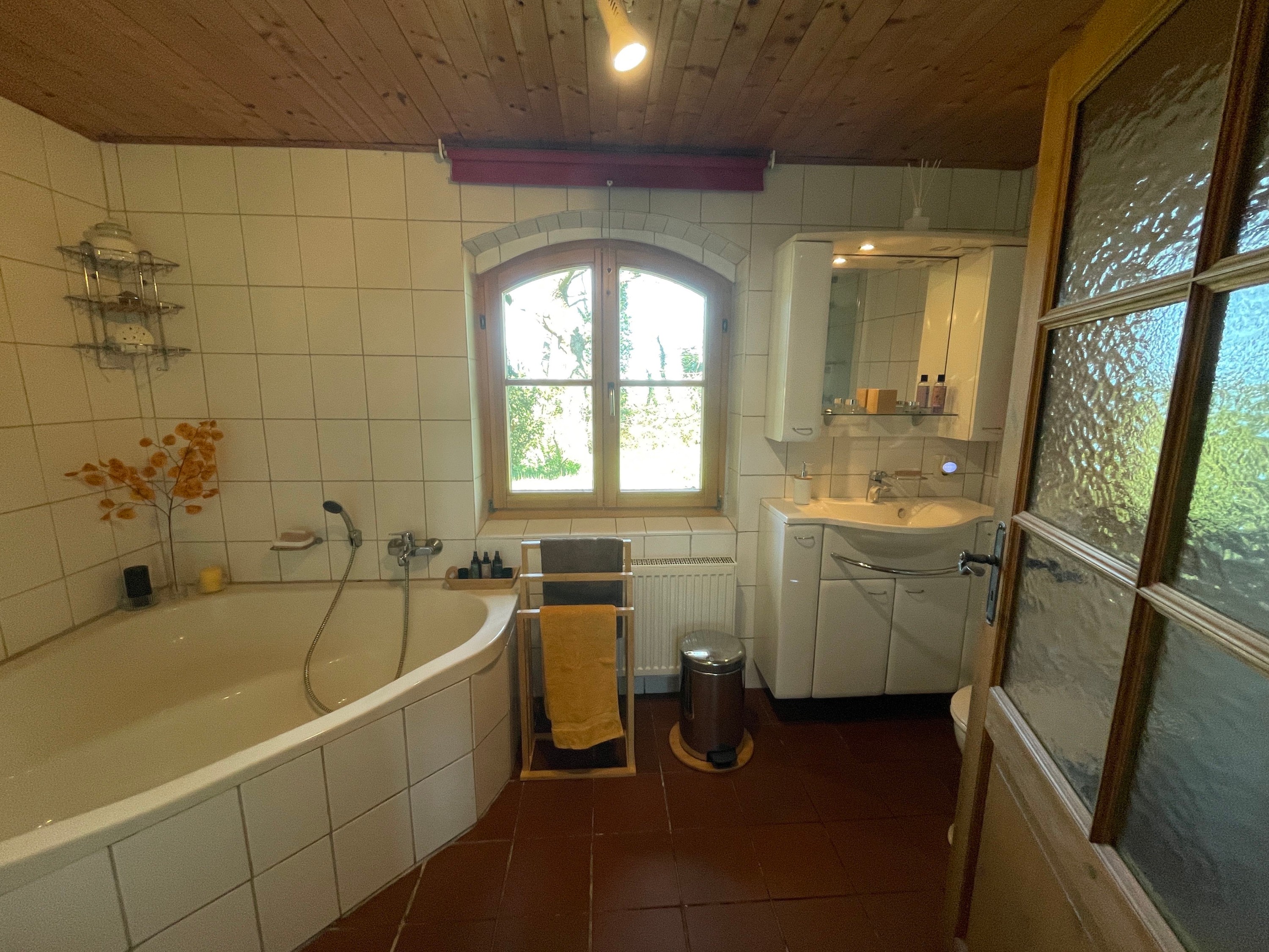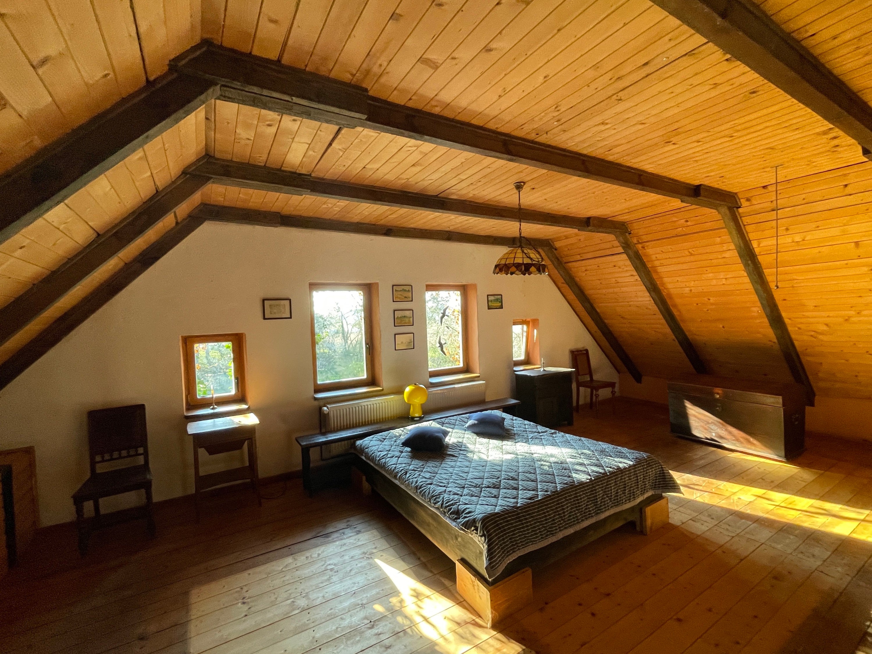 Dall’ingresso principale situato sulla terrazza si accede all’atrio con camino e vista aperta sul piano superiore, raggiungibile tramite un’ampia scala in legno autoportante. A sinistra della scala si trova l’accogliente soggiorno con vista sul giardino. Dall’atrio si accede inoltre alla cucina abitabile con un locale separato aggiuntivo, al bagno spazioso con vasca ad angolo e doccia, nonché al laboratorio con accesso alla cantina.