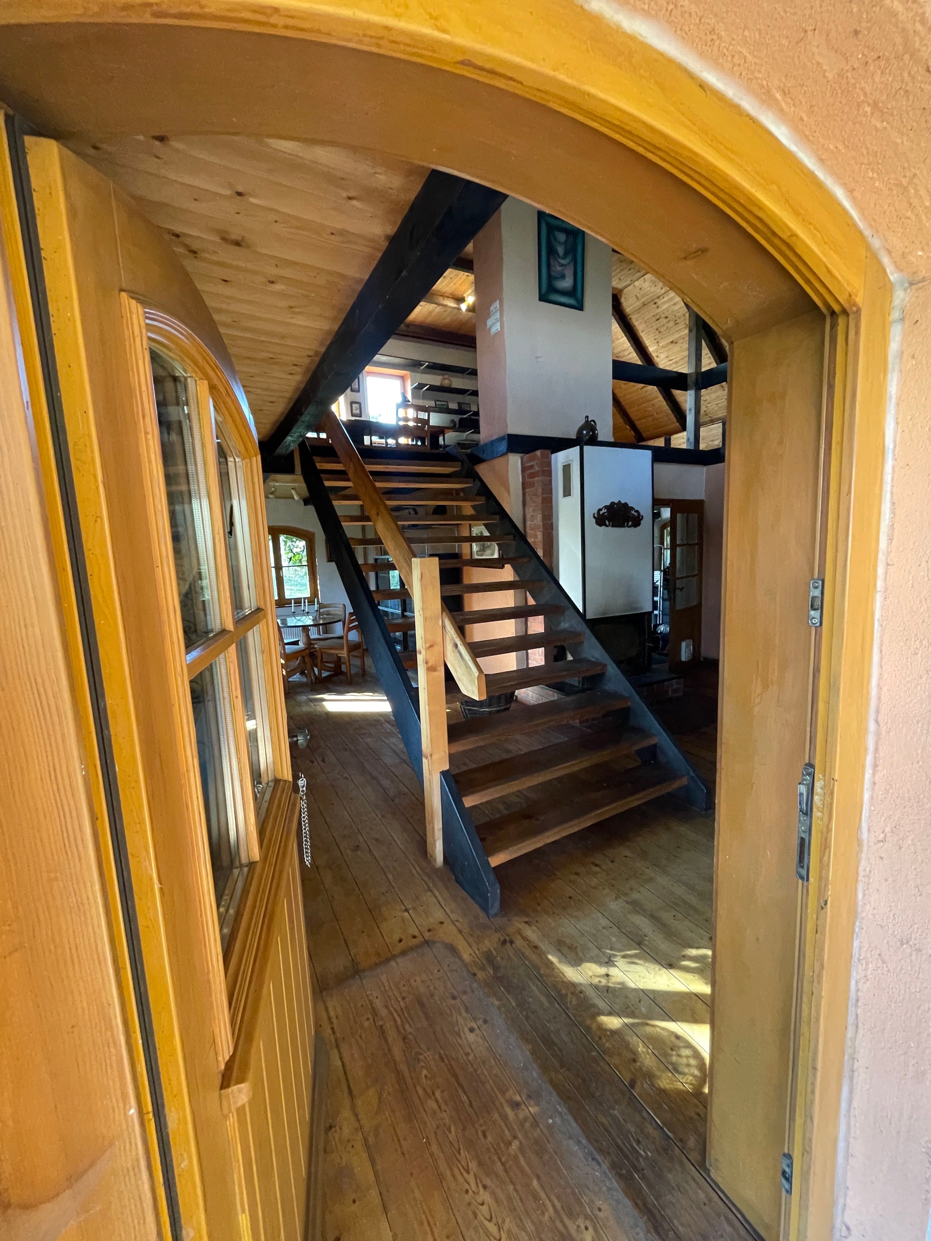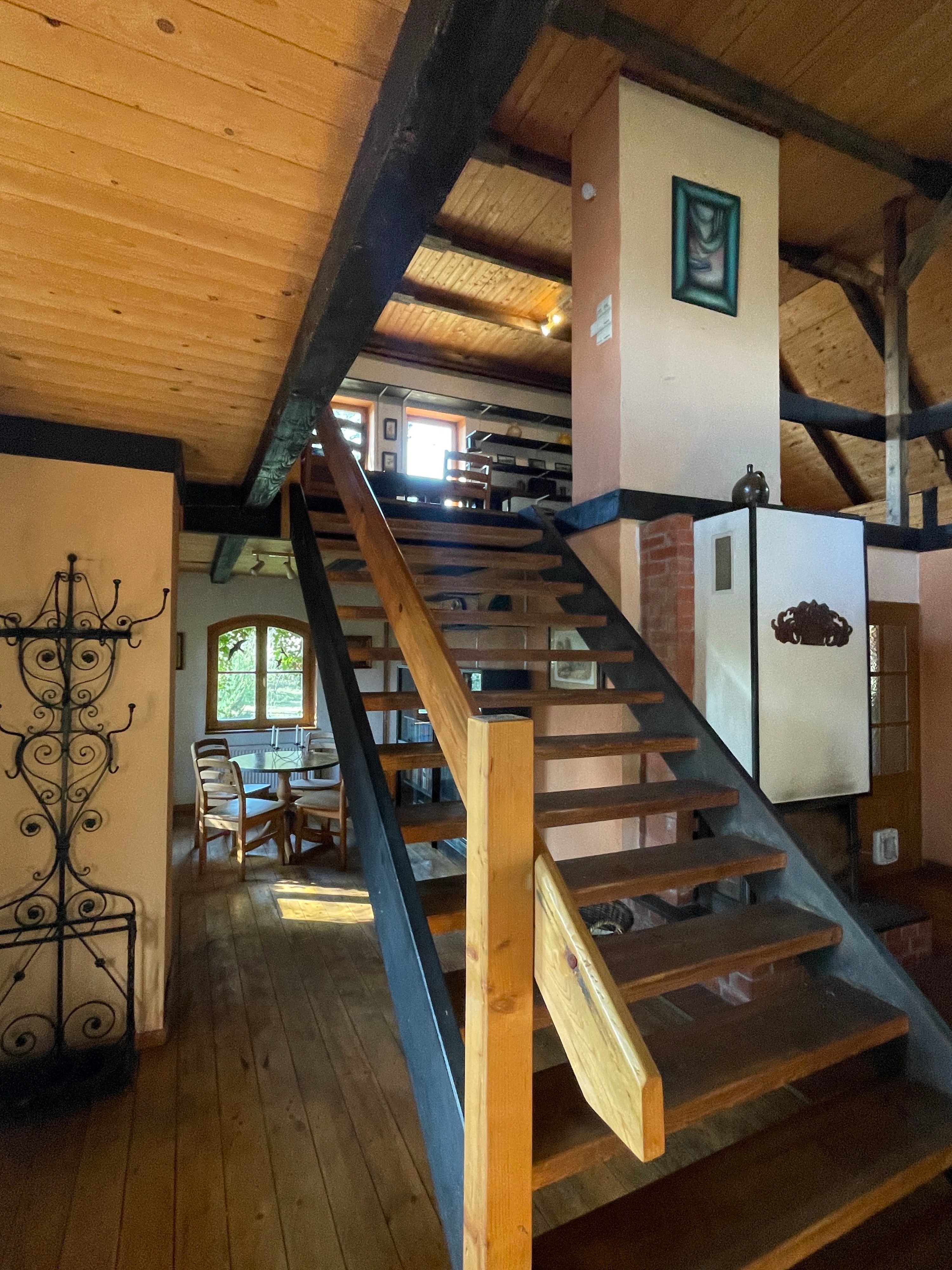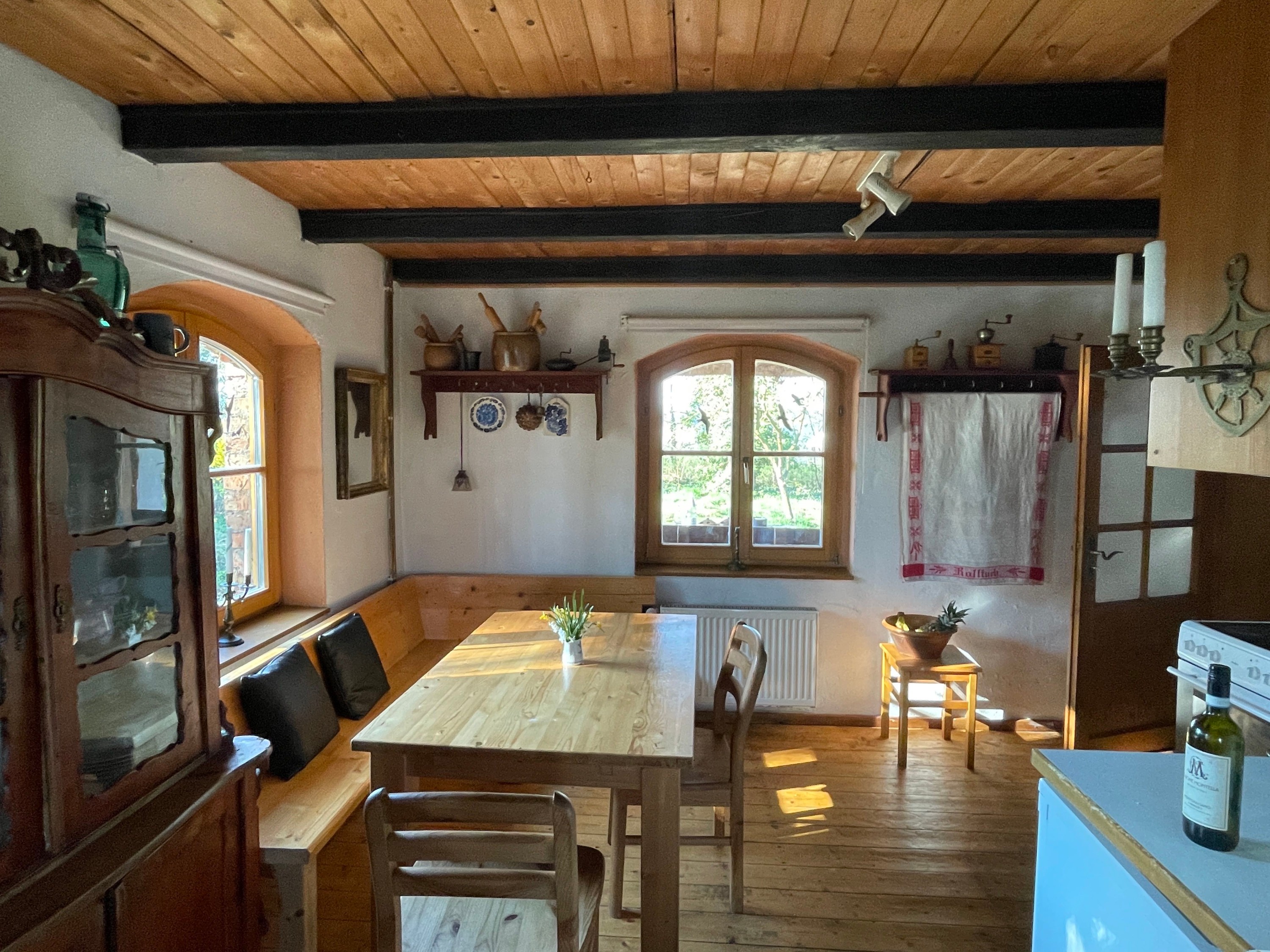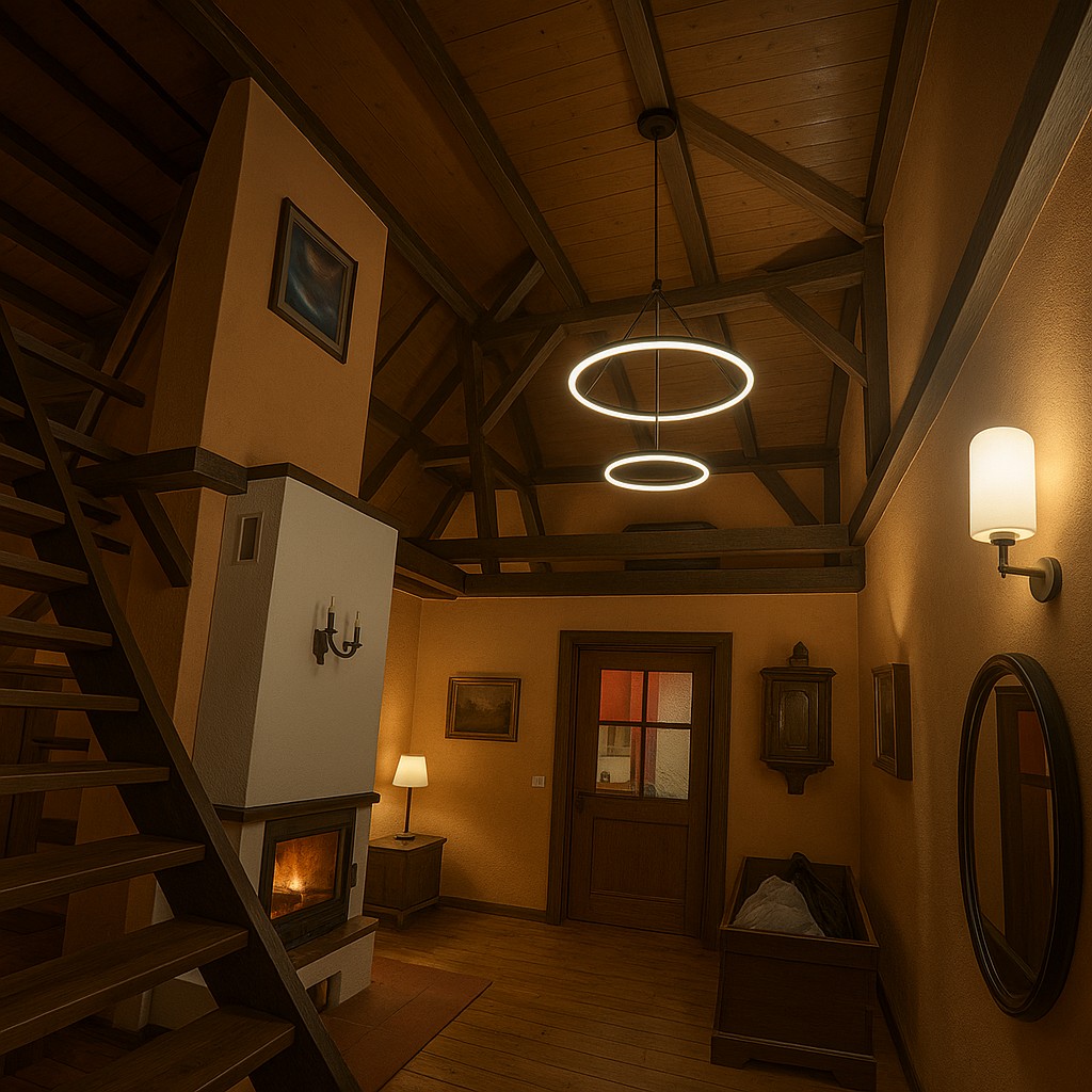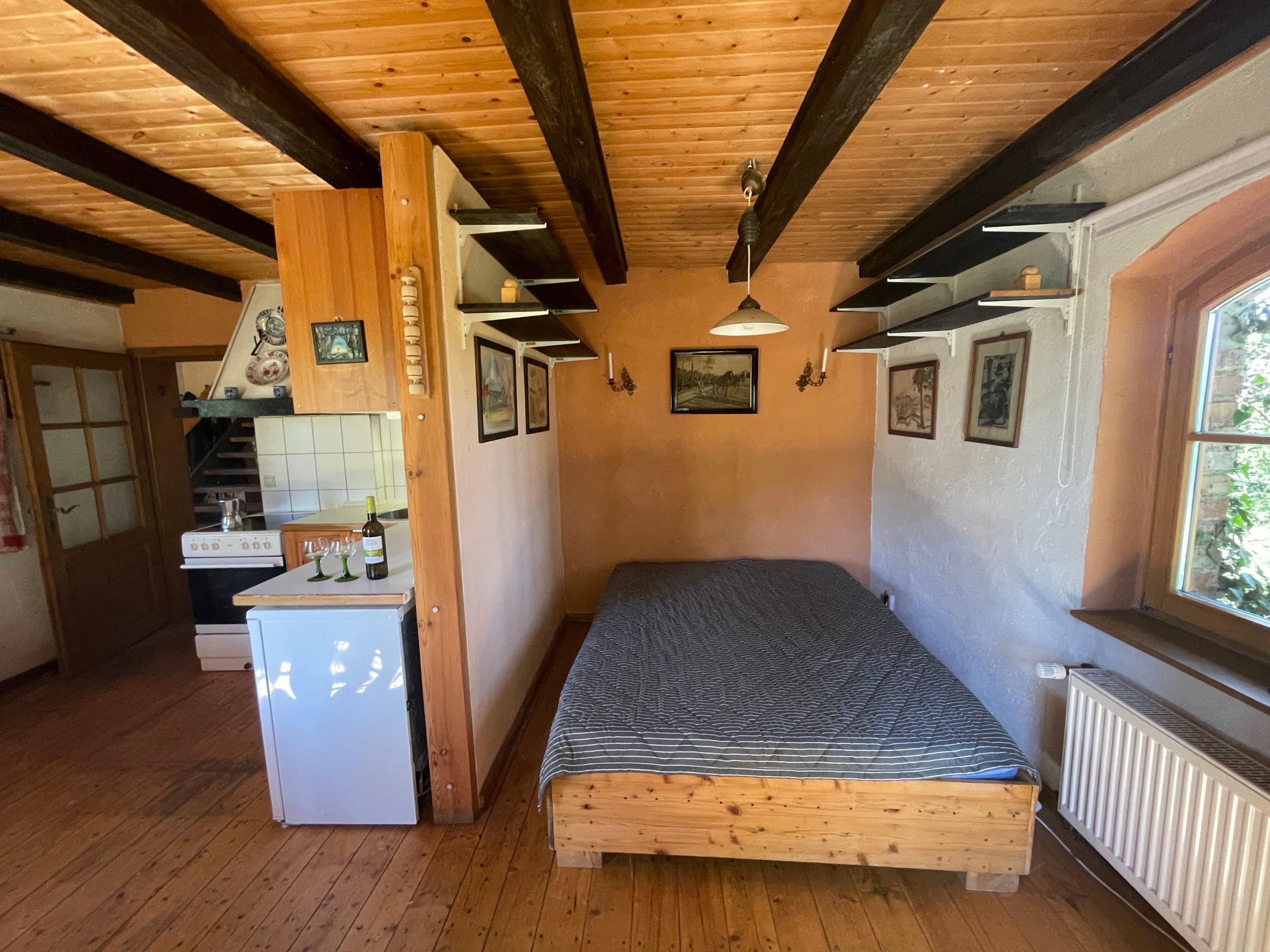 Dall’ingresso principale situato sulla terrazza si accede all’atrio con camino e vista aperta sul piano superiore, raggiungibile tramite un’ampia scala in legno autoportante. A sinistra della scala si trova l’accogliente soggiorno con vista sul giardino. Dall’atrio si accede inoltre alla cucina abitabile con un locale separato aggiuntivo, al bagno spazioso con vasca ad angolo e doccia, nonché al laboratorio con accesso alla cantina.