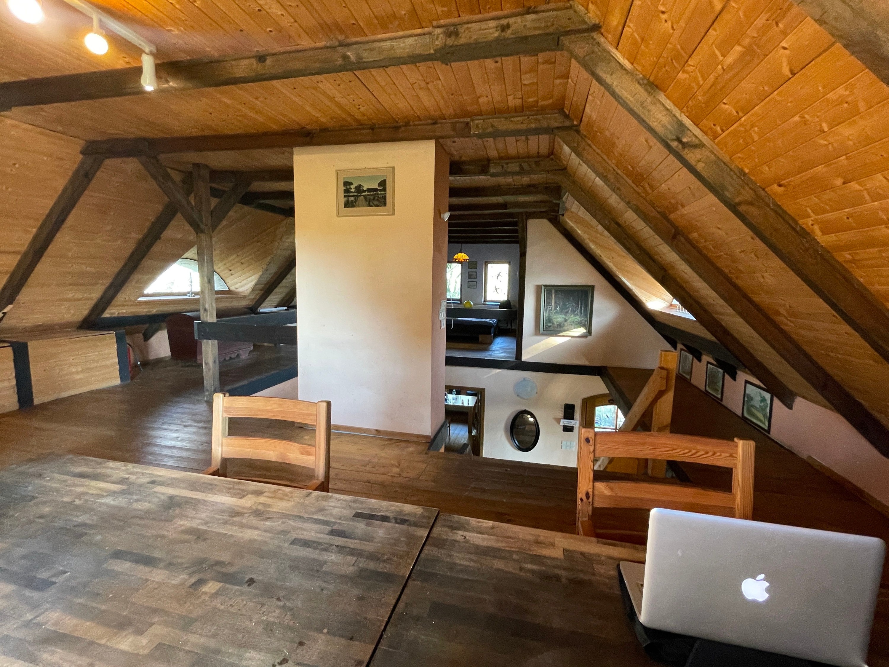 Il piano superiore è composto da un ampio spazio open space nel sottotetto con due abbaini contrapposti lungo la galleria, oltre a una zona studio e una zona notte situate nelle testate a timpano.
