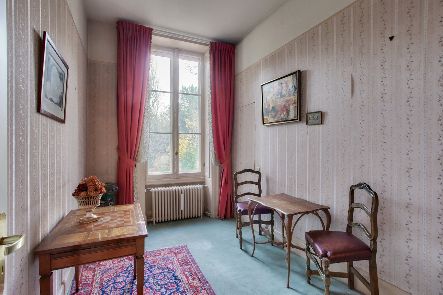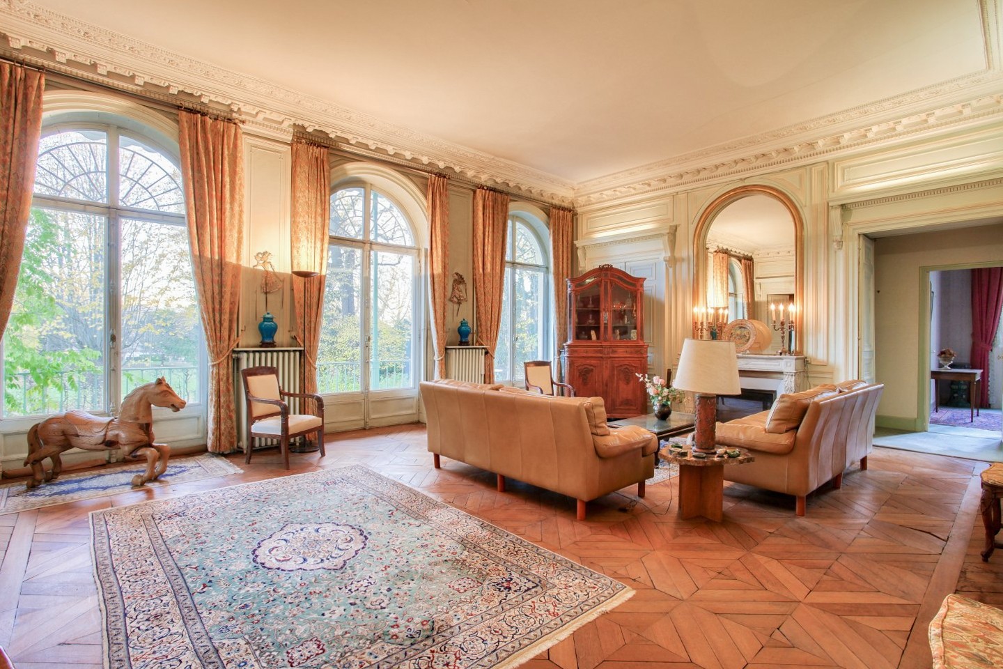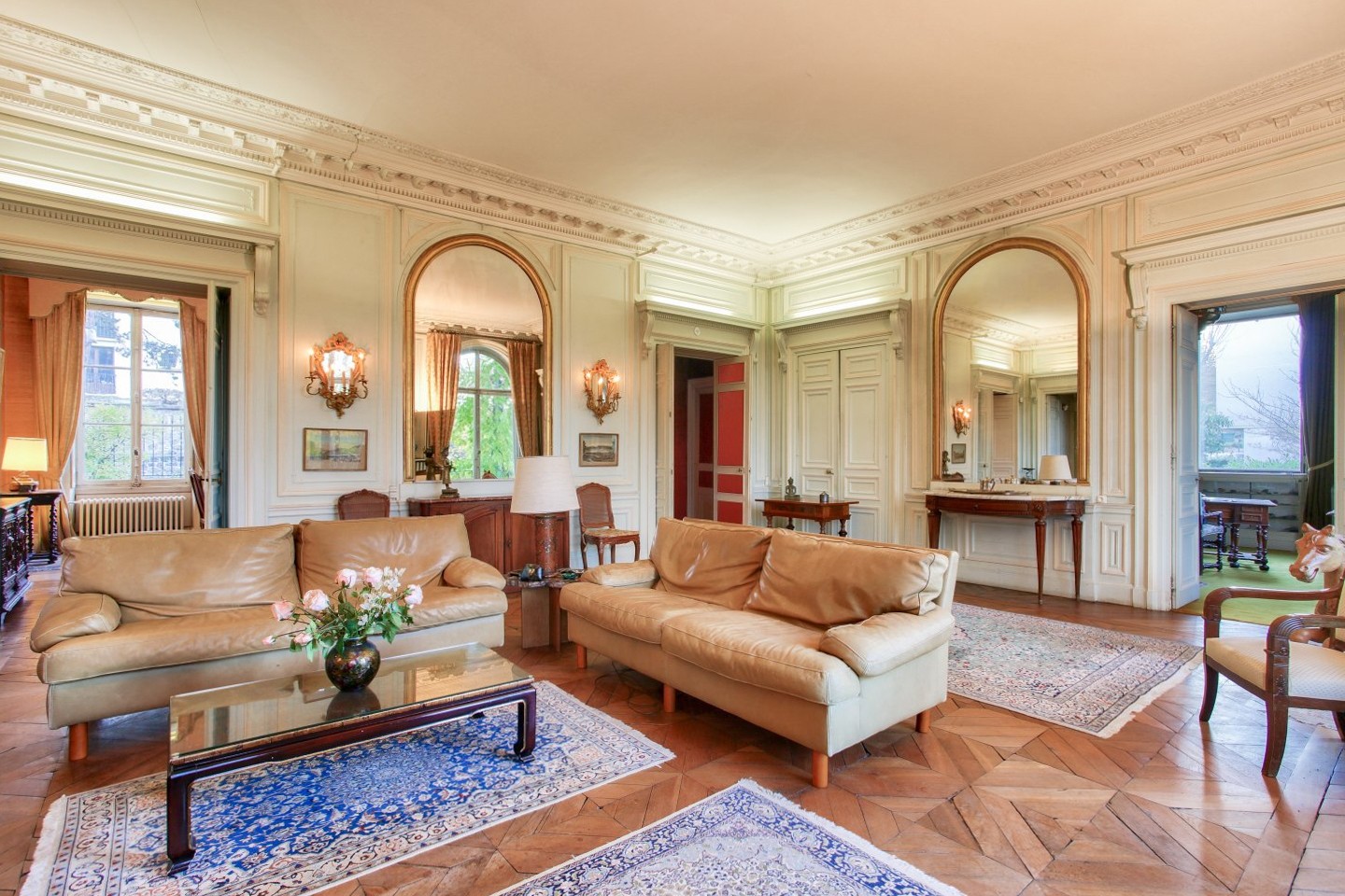 L'ingresso conduce a un ampio soggiorno con camino in marmo. Grandi porte-finestre si aprono su una terrazza che scende nel parco e nel giardino privato. Uno studio/camera da letto con doppia esposizione si trova in successione al soggiorno e si apre anche su una grande sala da pranzo.