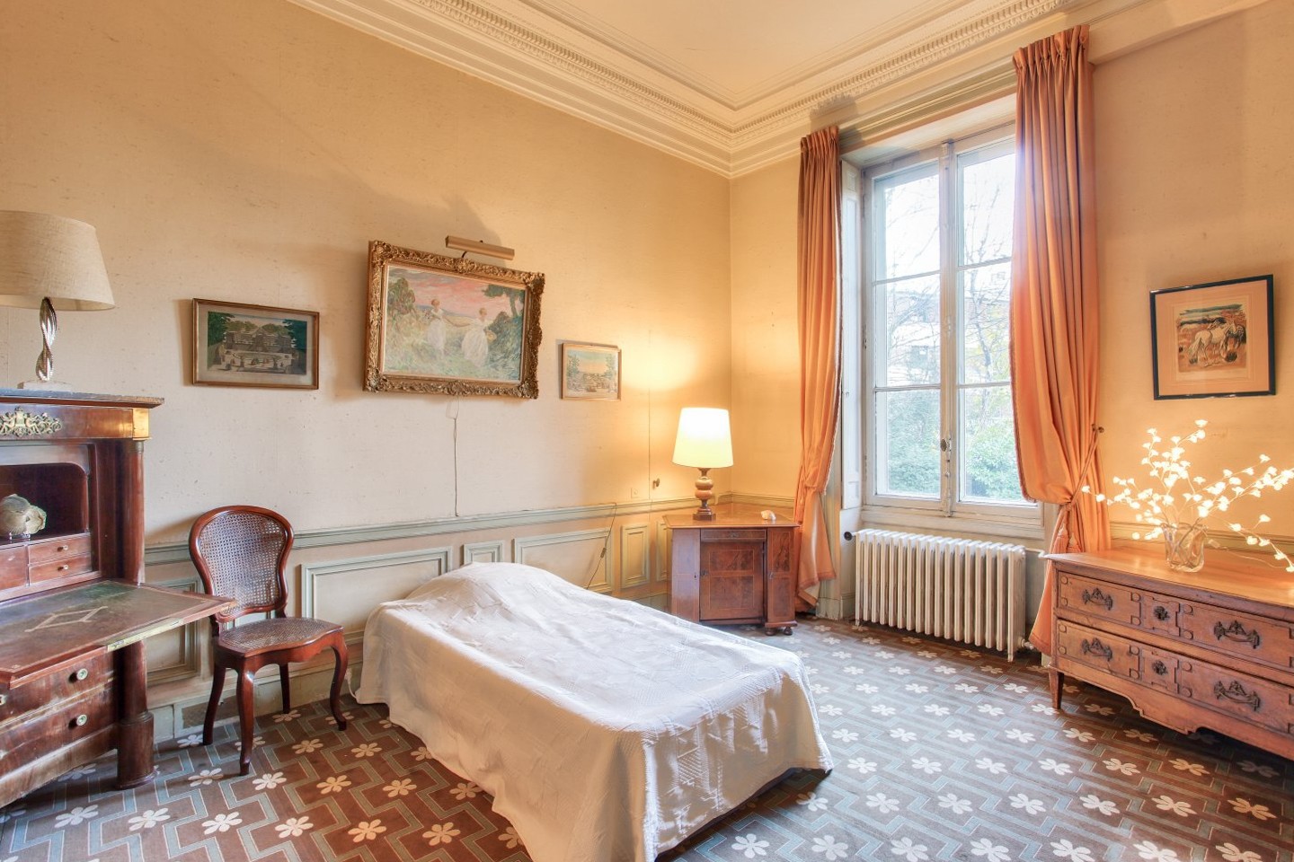 L'appartamento si trova al piano terra della "Maison des Colonnes", costruita nel 1826 dall'architetto Auguste Jean-Marie Guénepin sui terreni dell'ex Château de Bellevue. Si distingue per la sua disposizione su un unico livello, i soffitti eccezionalmente alti con modanature e i pavimenti in parquet originale di quercia.