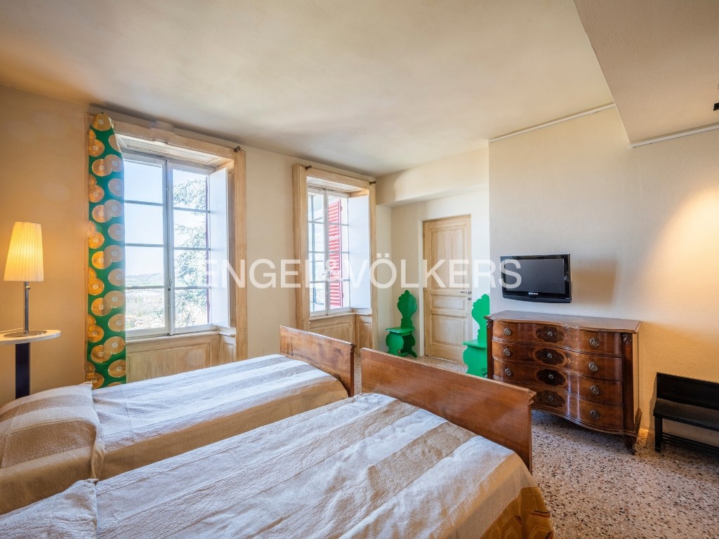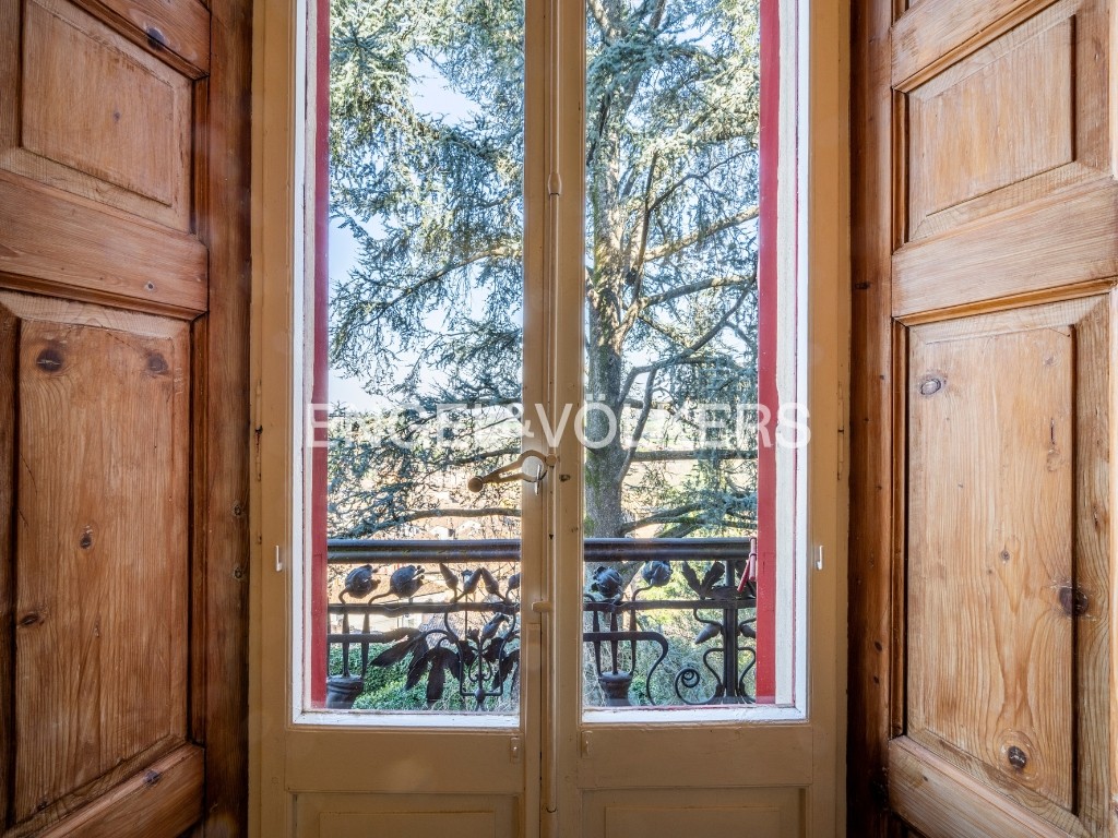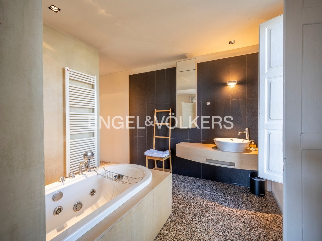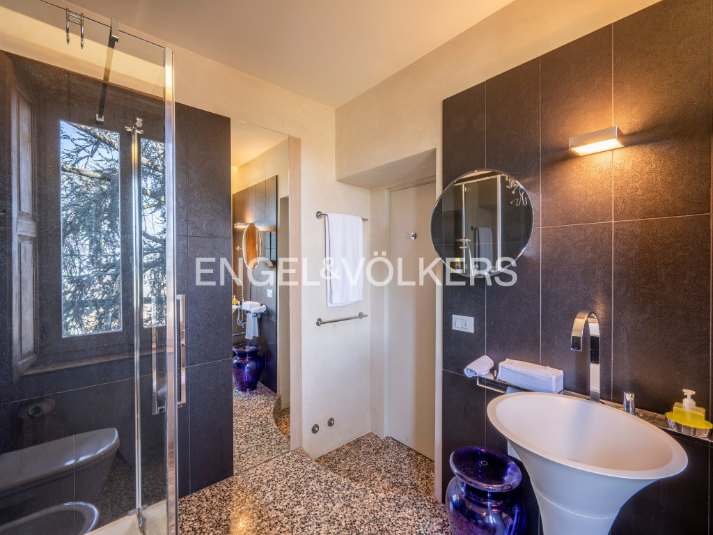 Una scenografica scala con balaustra in ferro battuto conduce al piano superiore, dove un elegante living accoglie una cucina sapientemente celata all’interno di armadiature su misura e si apre su una veranda con vista aperta e suggestiva. Questo livello ospita due raffinate suite: una spaziosa suite padronale con zona studio e ampio bagno en-suite, una seconda suite composta da camera matrimoniale con cabina armadio, camera singola e bagno.