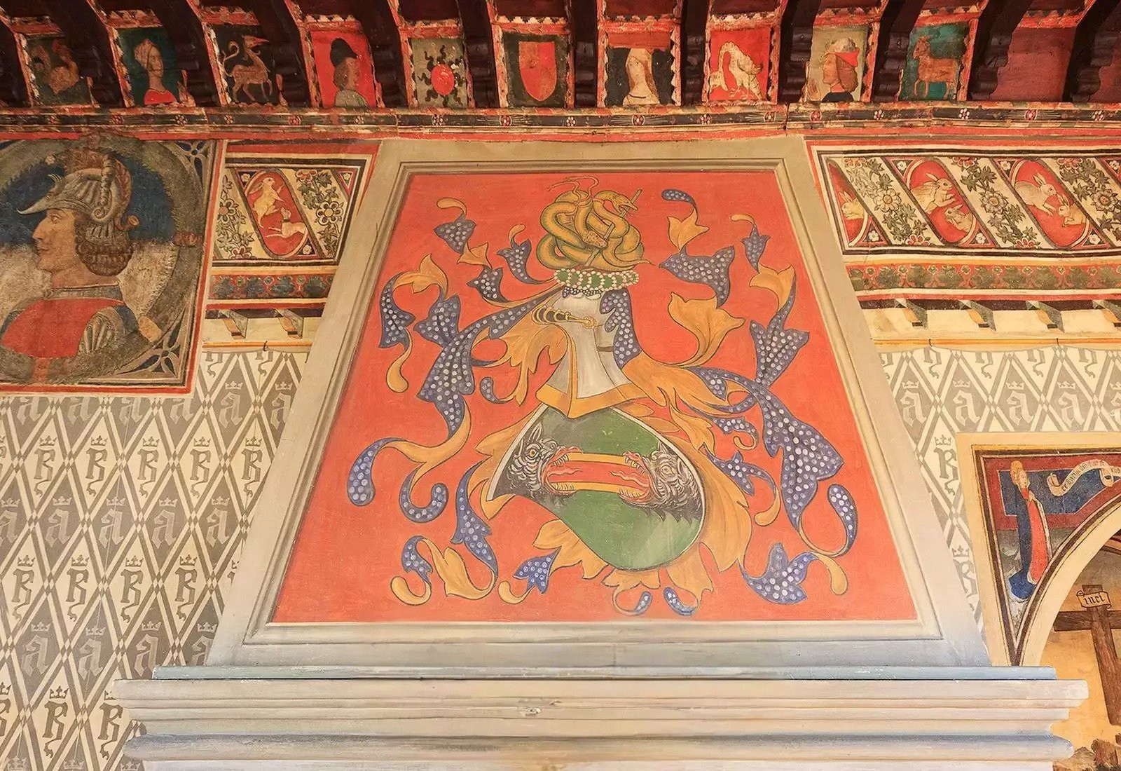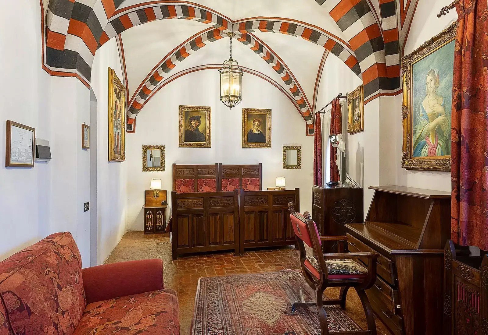 L’impianto conserva torri, cortili interni e mura merlate di epoca medievale. All’interno sono presenti decorazioni storiche, pavimentazioni in pietra e una struttura portante in ottime condizioni.