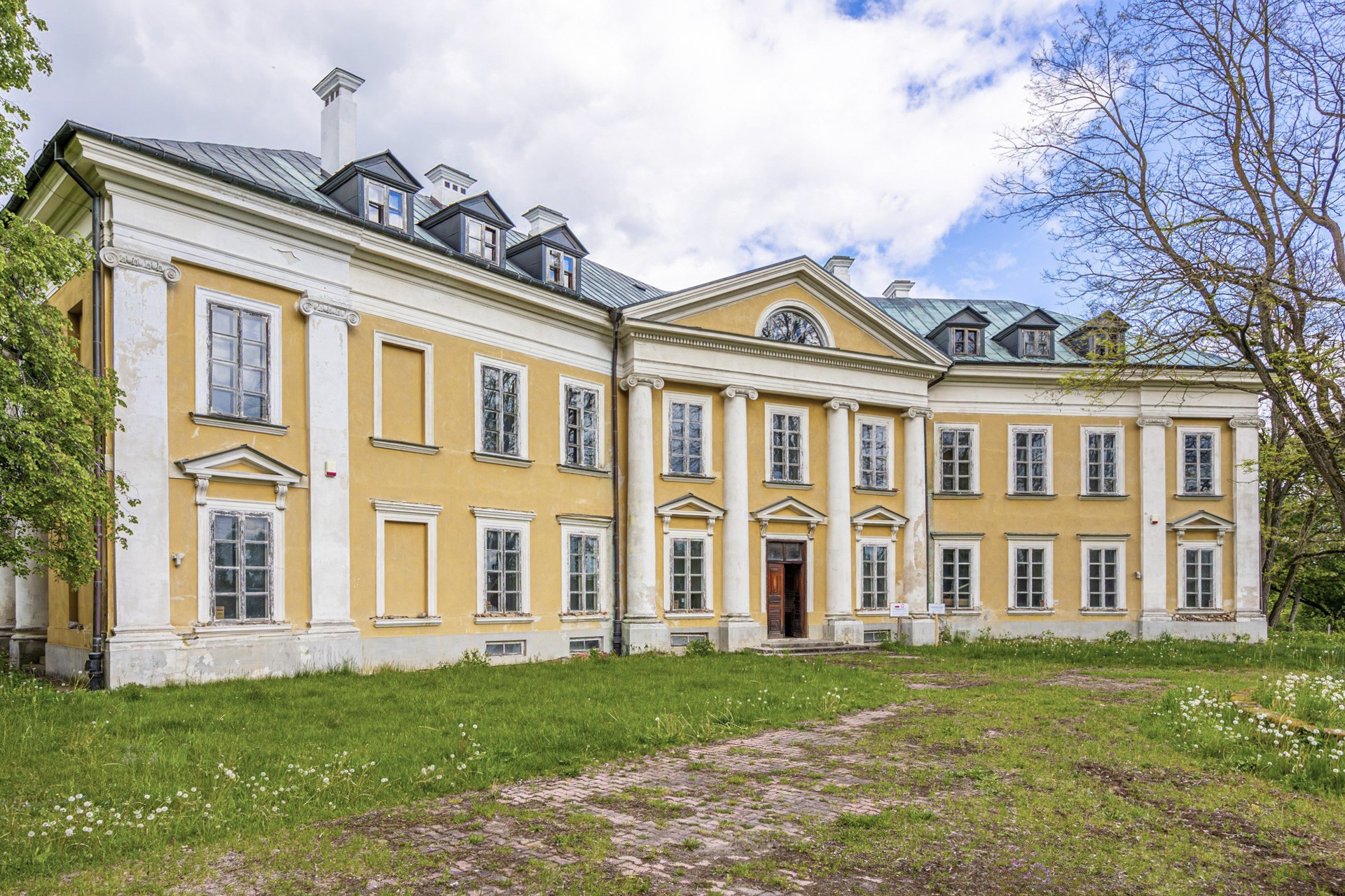 Il palazzo è composto da due ali rettangolari disposte a un angolo ottuso tra loro. La parte centrale con tre campate di finestre è caratterizzata da un portico ionico a quattro colonne. Il lato giardino presenta una disposizione irregolare, con un portico che sostiene un balcone e una loggia nell’angolo dell’edificio. Questa configurazione rompe consapevolmente gli schemi classici barocco-classici. Il parco si estende a ovest del palazzo mentre a nord e a est confina con una riserva naturale attraversata da un piccolo ruscello.