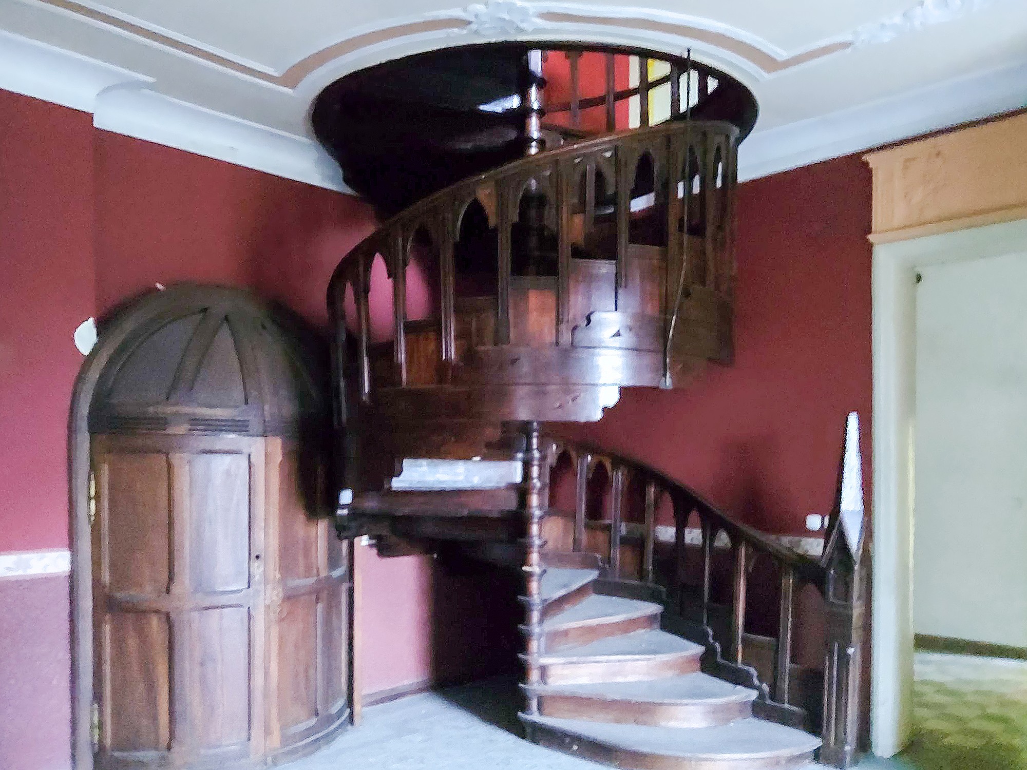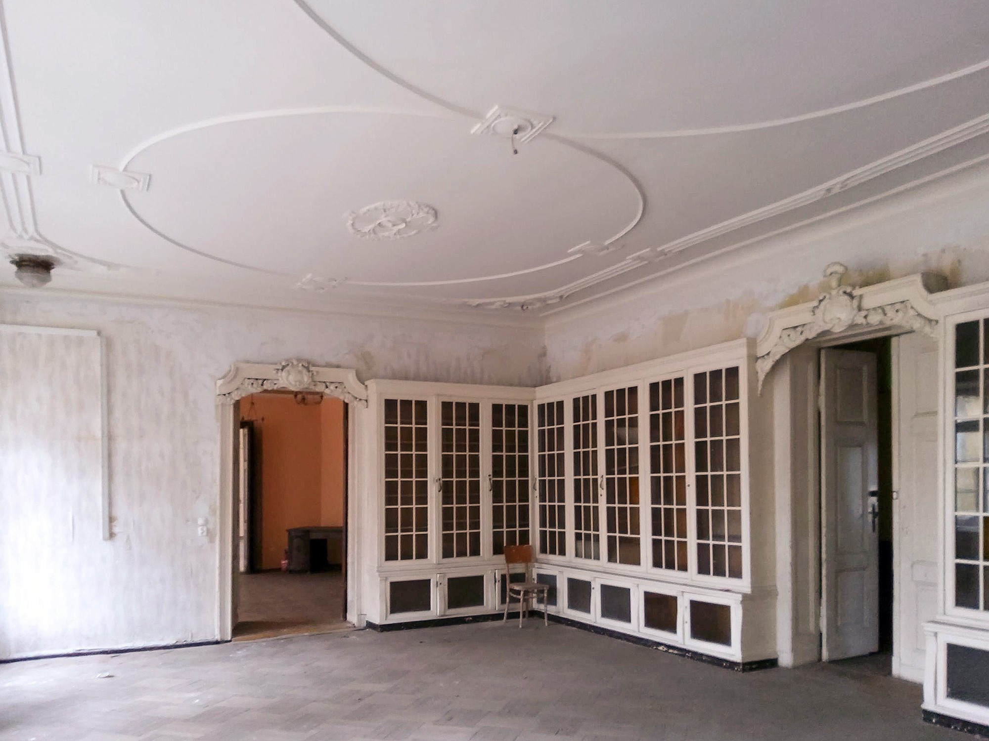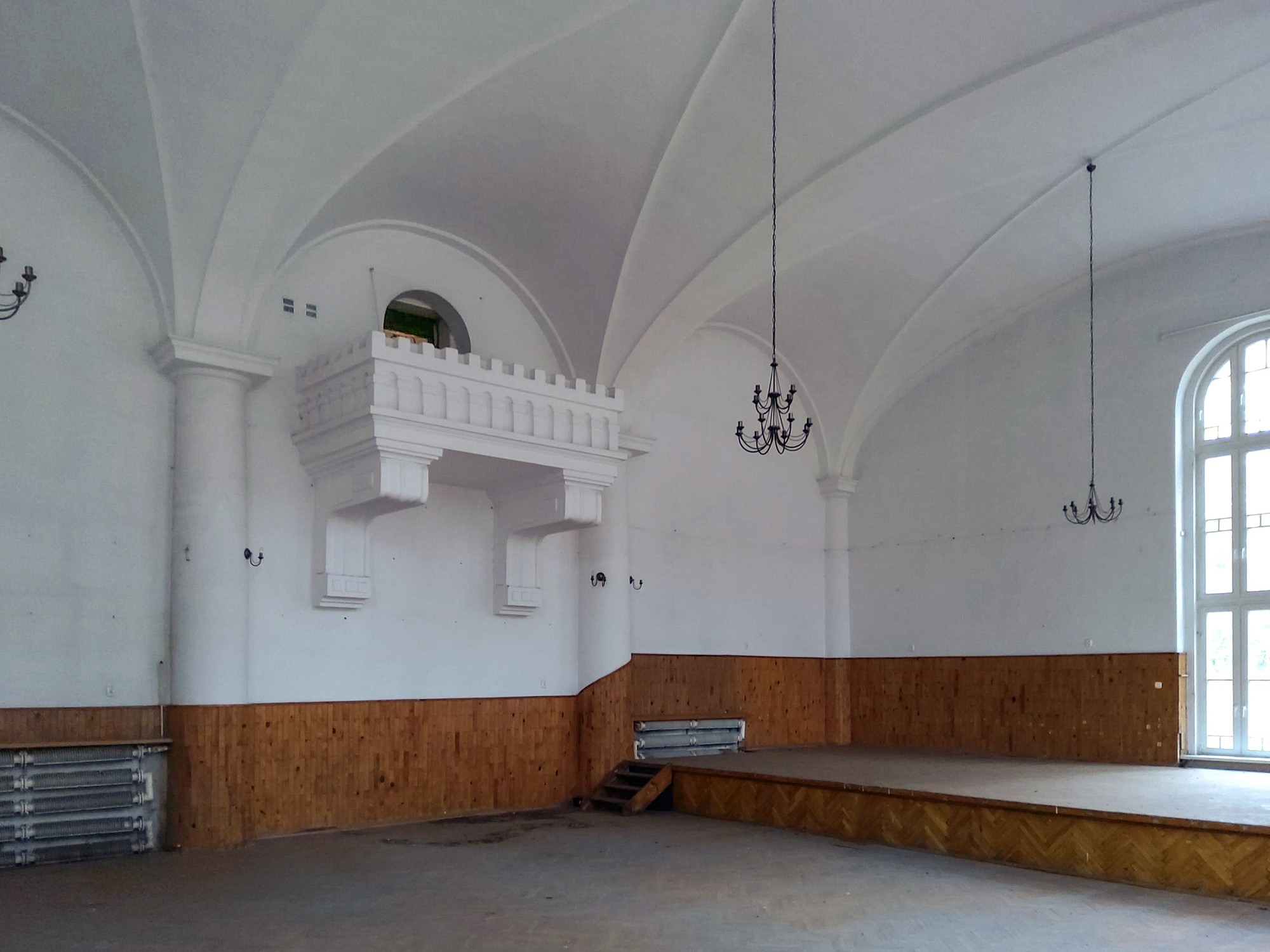 Il cuore del piano terra è la grande sala da ballo con un balcone in pietra per l'orchestra. Inoltre, sono conservati pavimenti in parquet lavorati con arte, pavimenti in piastrelle decorate, una biblioteca con stucchi elaborati, numerosi salotti e una spettacolare scala a chiocciola in legno nella hall d'ingresso. Le finestre in legno, rinnovate negli anni '80 e '90, sono in buone condizioni. Sul lato del giardino, un altro balcone arricchisce l'aspetto elegante dell'edificio.