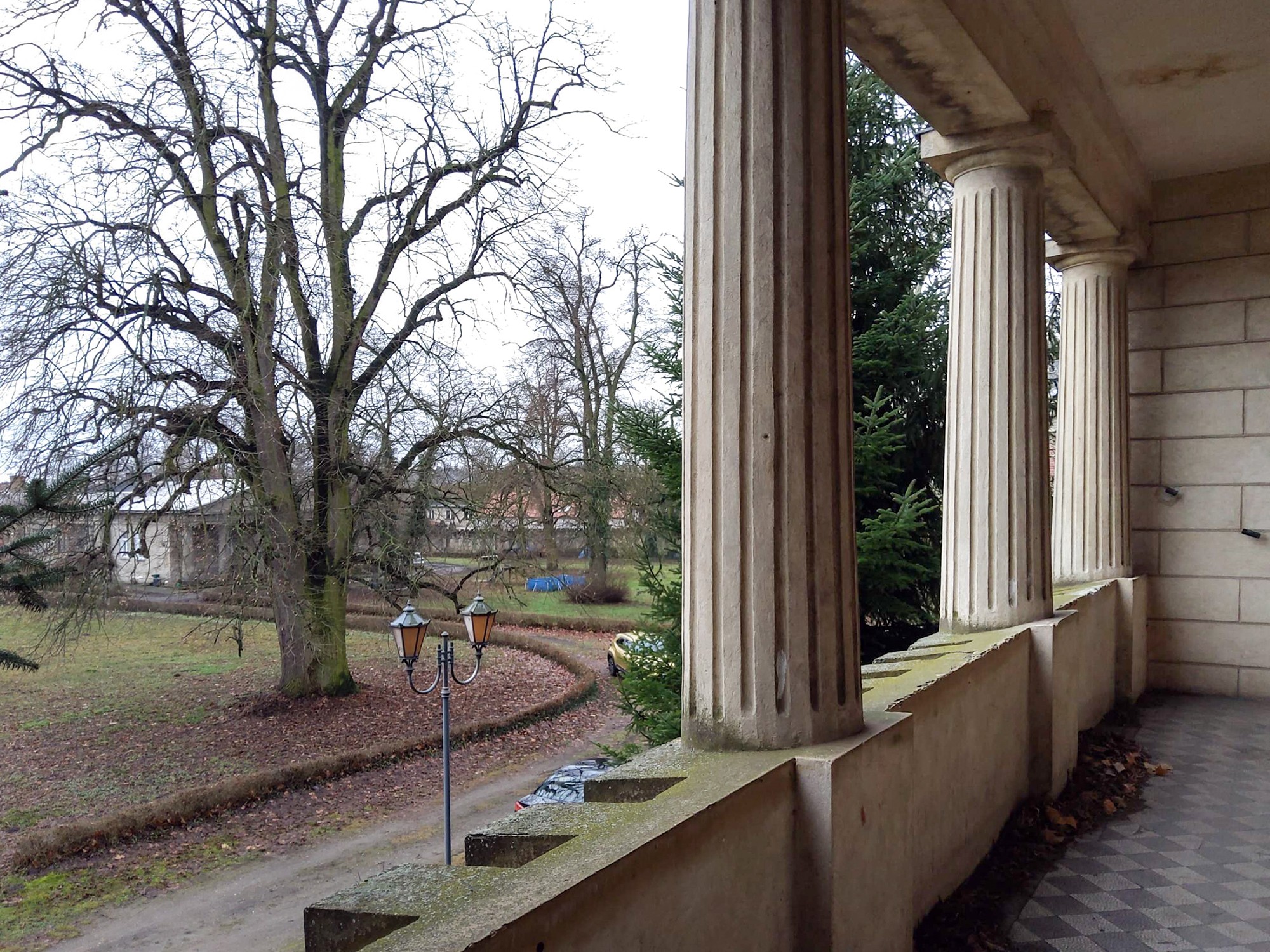L'accesso alla ex tenuta avviene tramite un imponente cancello decorato da due colonne con statue di leoni e uno stemma familiare. Il cancello è incorniciato da una elegante colonnata dorica. La proprietà è circondata da un muro rappresentativo del 1913.