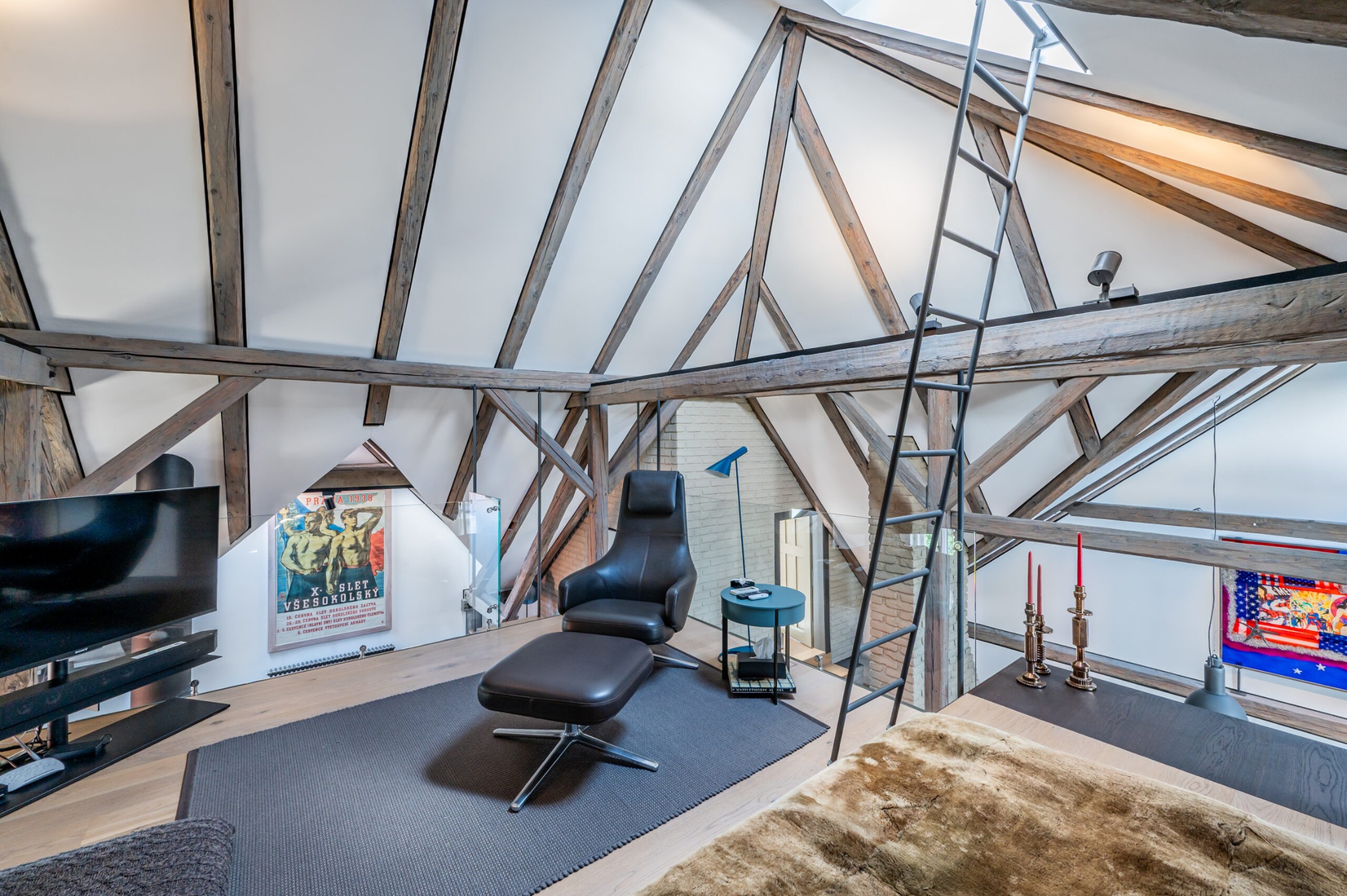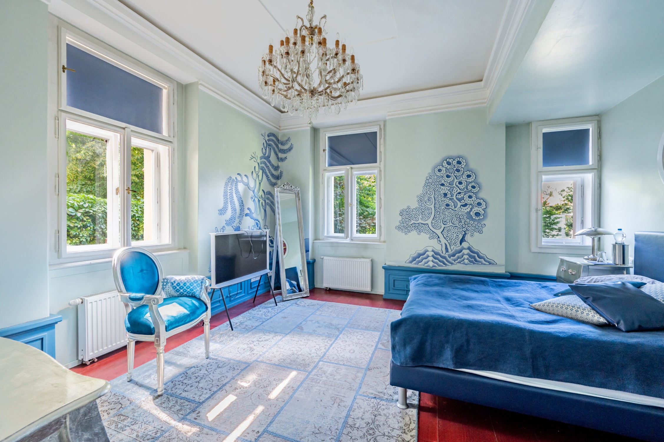 La villa si sviluppa su cinque piani con una distribuzione generosa. Ospita 20 stanze diverse, ognuna con un carattere unico – dalle camere in stile orientale a un elegante salone dorato fino a un moderno loft nell’attico con terrazza.
