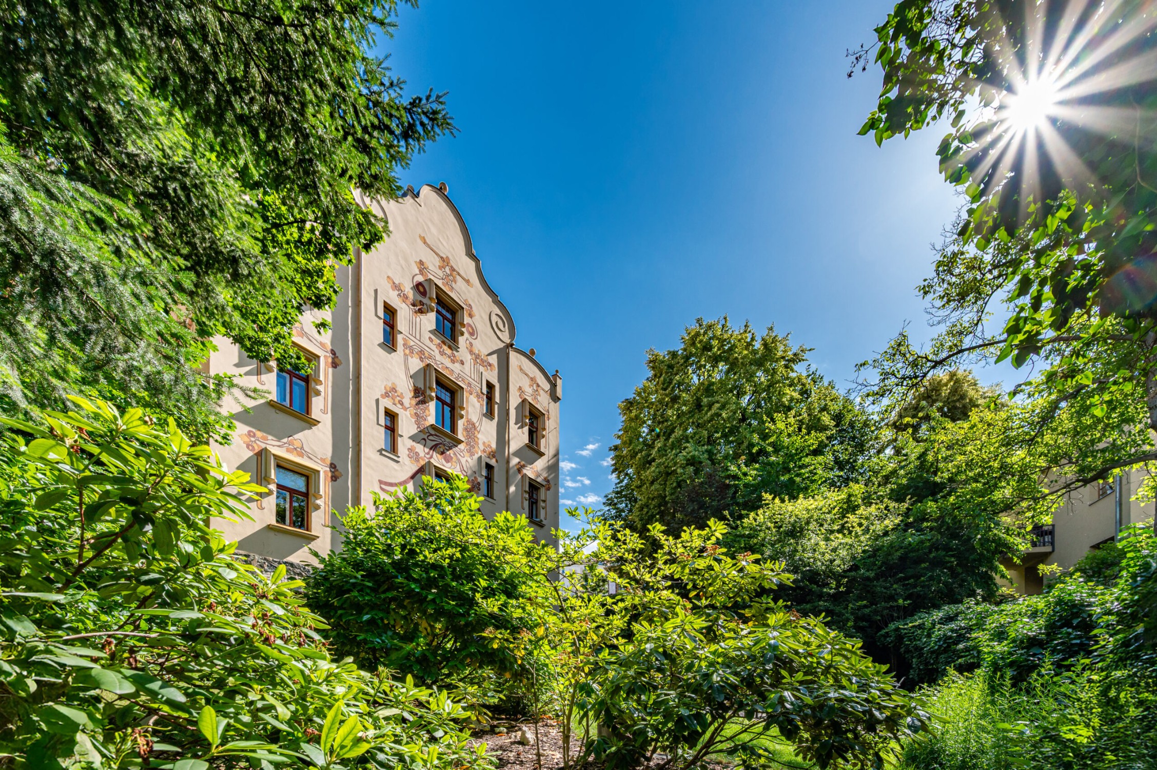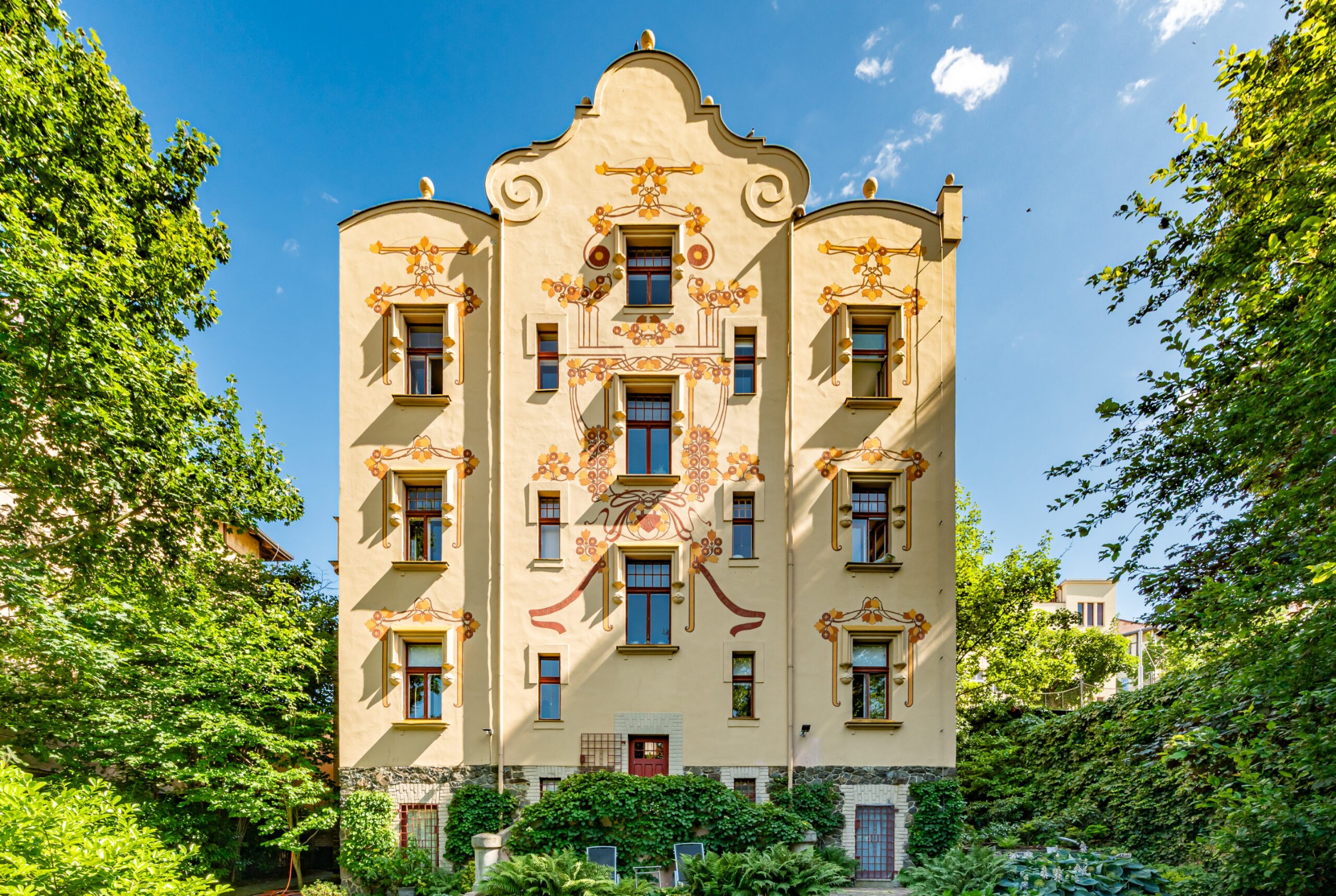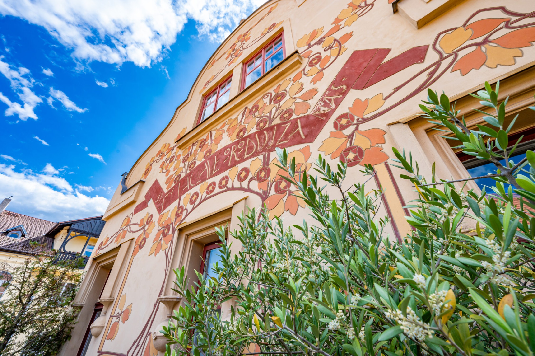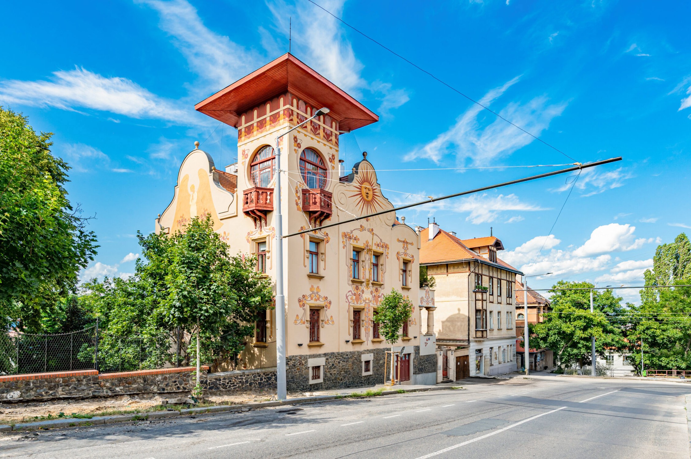 La facciata è stata progettata e decorata dal noto pittore accademico František Kobliha. La decorazione artistica comprende ornamenti, affreschi, una figura angelica e una meridiana – tutto nello stile più autentico dell’Art Nouveau.