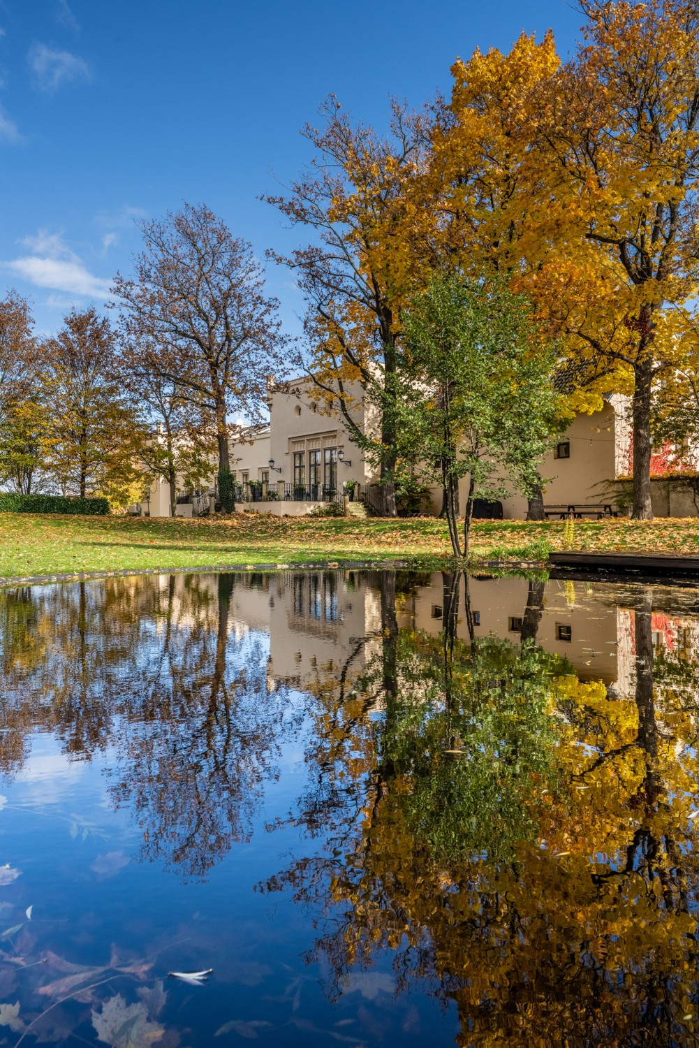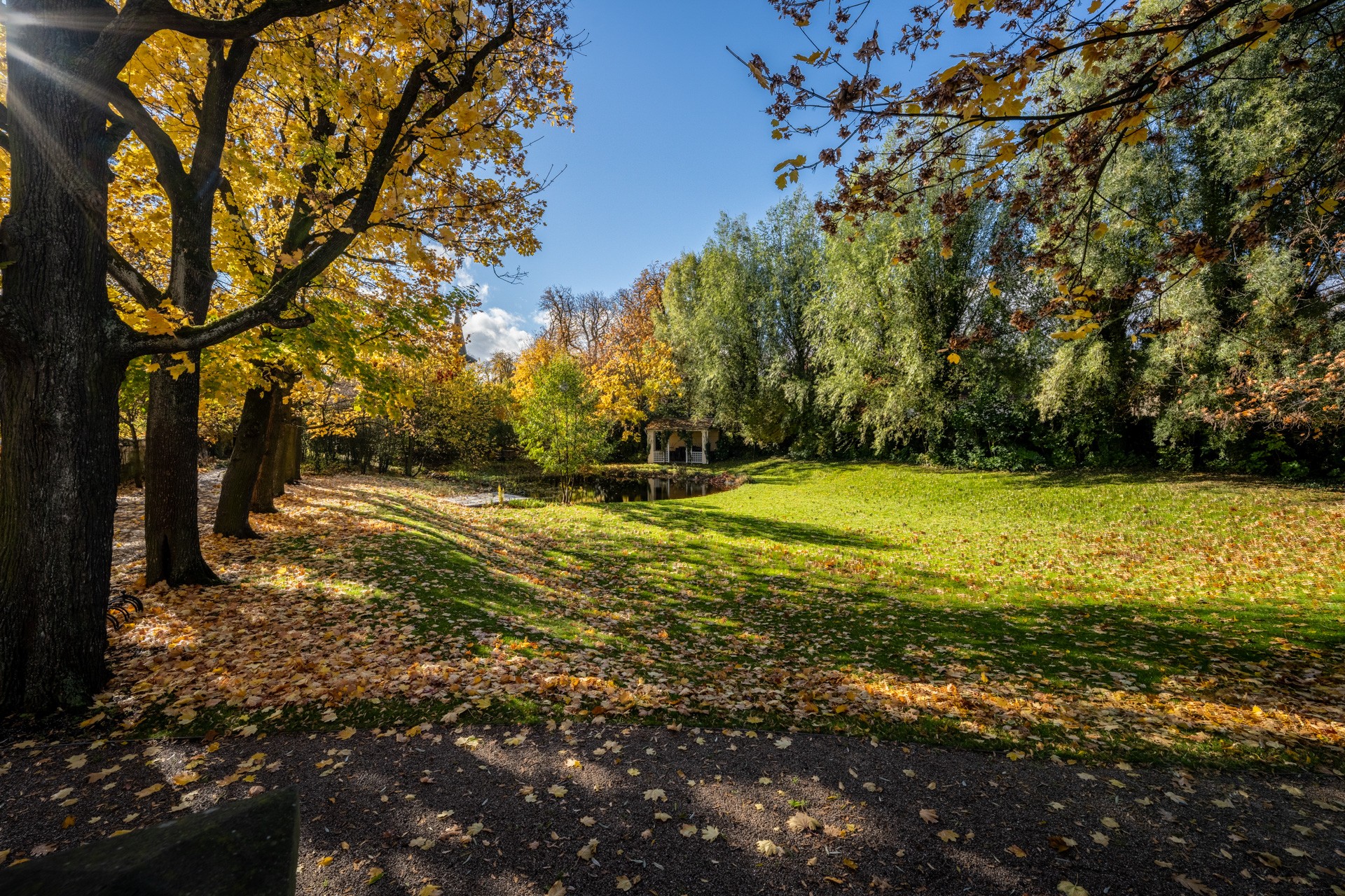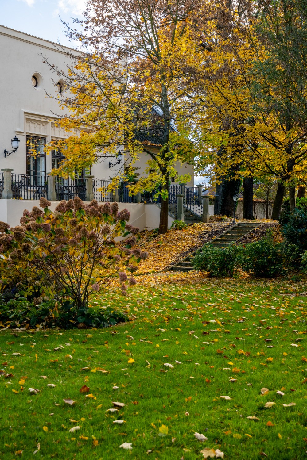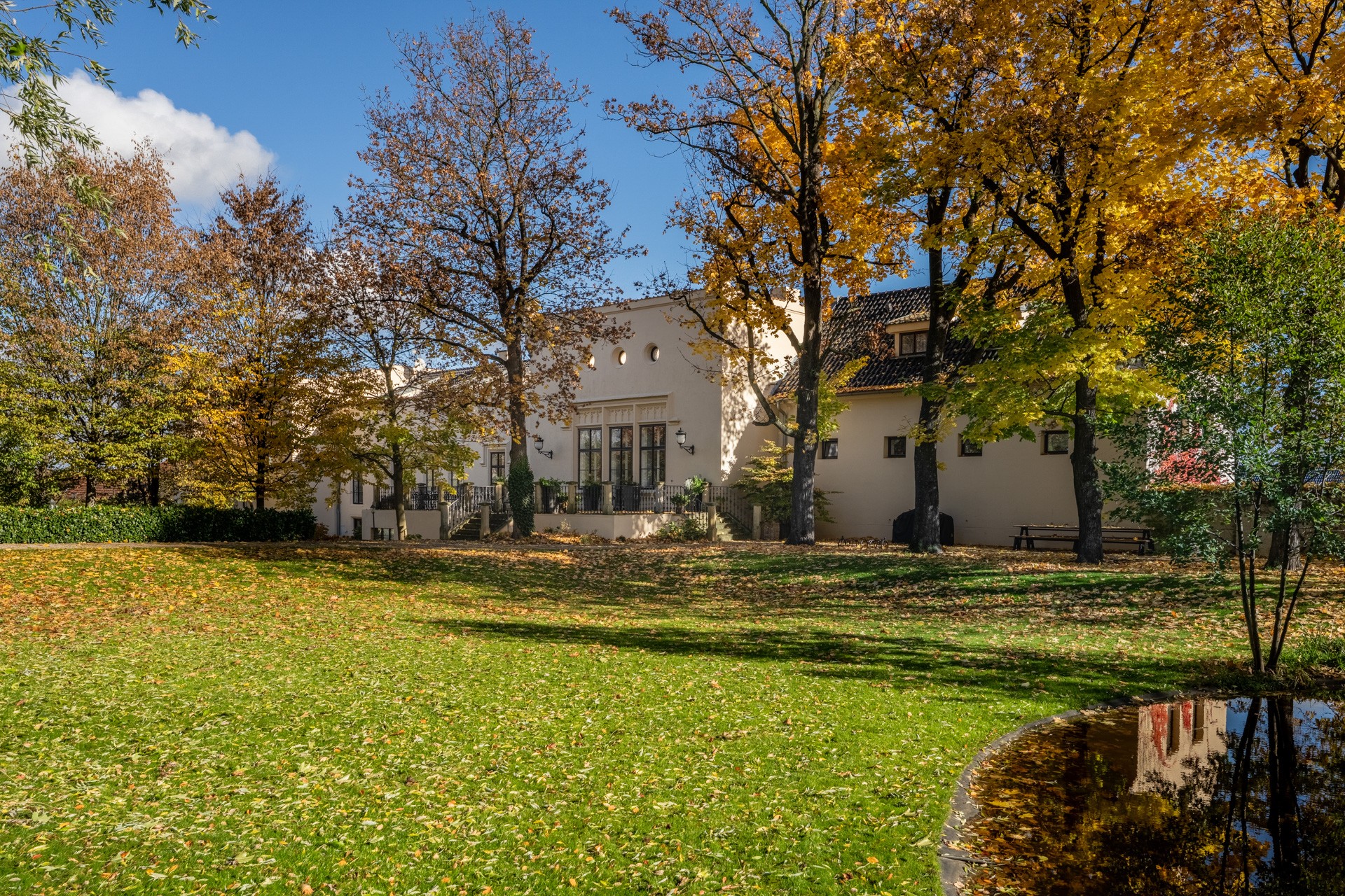 Al centro si trova un ampio salone con camino, elegante e accogliente, perfetto per ricevere ospiti. Il salone si apre su una grande terrazza e su un parco di 4.253 m², con stagno, padiglione e fontana. Il giardino combina uno stile paesaggistico inglese con la simmetria dei giardini francesi.