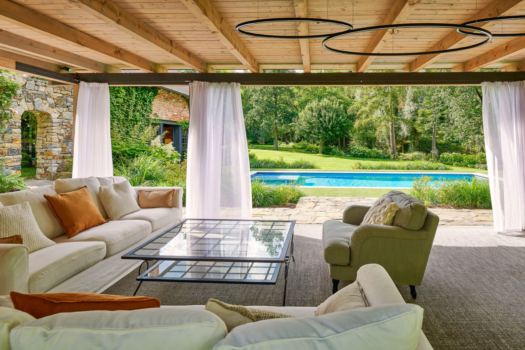L’area centrale per il relax all’aperto è la zona della piscina. Accanto alla piscina si trova una piccola casa con camino, collegata alla terrazza che conduce alla zona di balneazione. Dall’altro lato c’è una terrazza coperta con area salotto. Più distante, un fienile completamente ristrutturato funge attualmente da ampio garage, laboratorio, sala hobby e lavanderia.