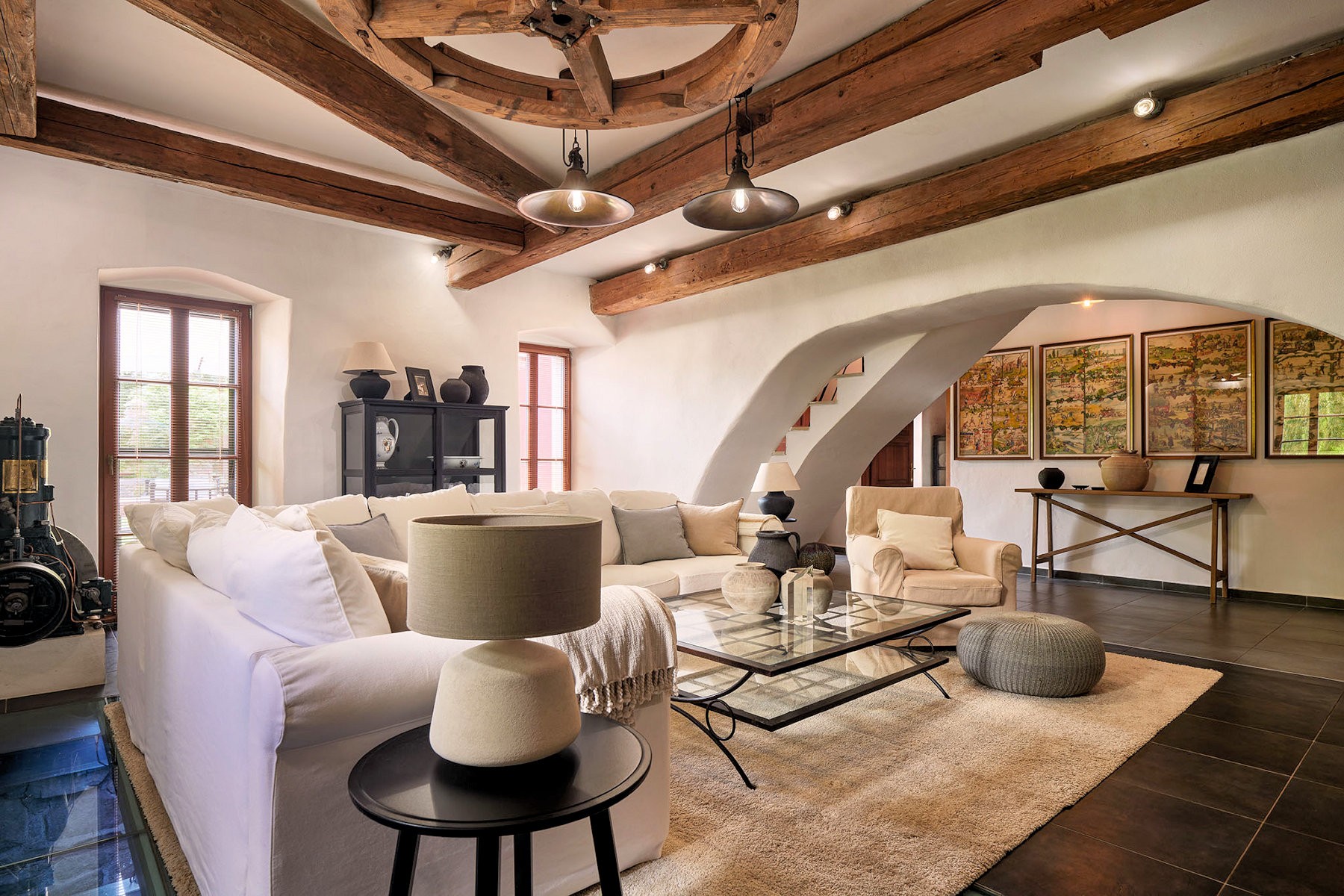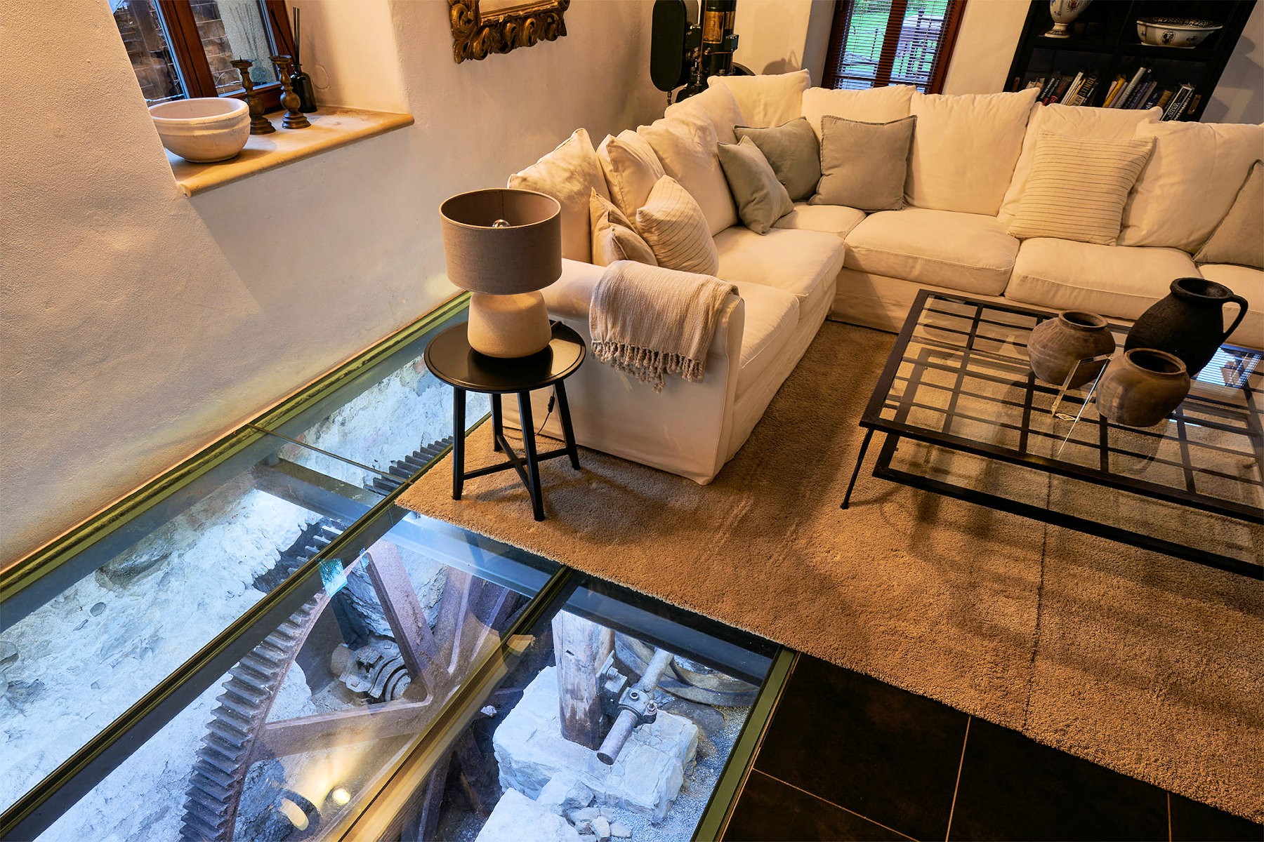 La casa principale dispone di quattro camere, tutte con bagno privato. Al piano terra si trova un ampio soggiorno con vista sulla ruota del vecchio mulino, oltre alla cucina e alle aree di servizio. Il piano interrato ospita una cantina.