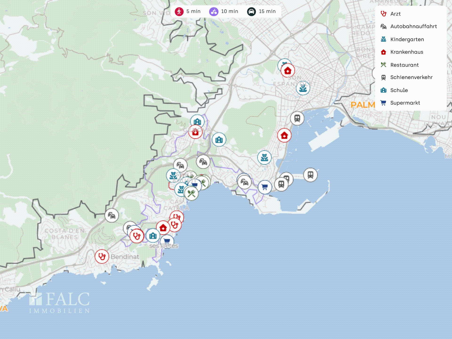 L’accesso all’autostrada nelle vicinanze consente collegamenti rapidi verso Palma e lungo la costa sud-occidentale. Fermate degli autobus come Paradís Hotel Belvedere, Can Tàpera e Noruega Mònaco sono raggiungibili a piedi e garantiscono collegamenti con la città. Anche il porto traghetti e crociere Estació Marítima è facilmente accessibile. L’aeroporto di Palma di Maiorca Son Sant Joan dista circa 20–30 minuti in auto.