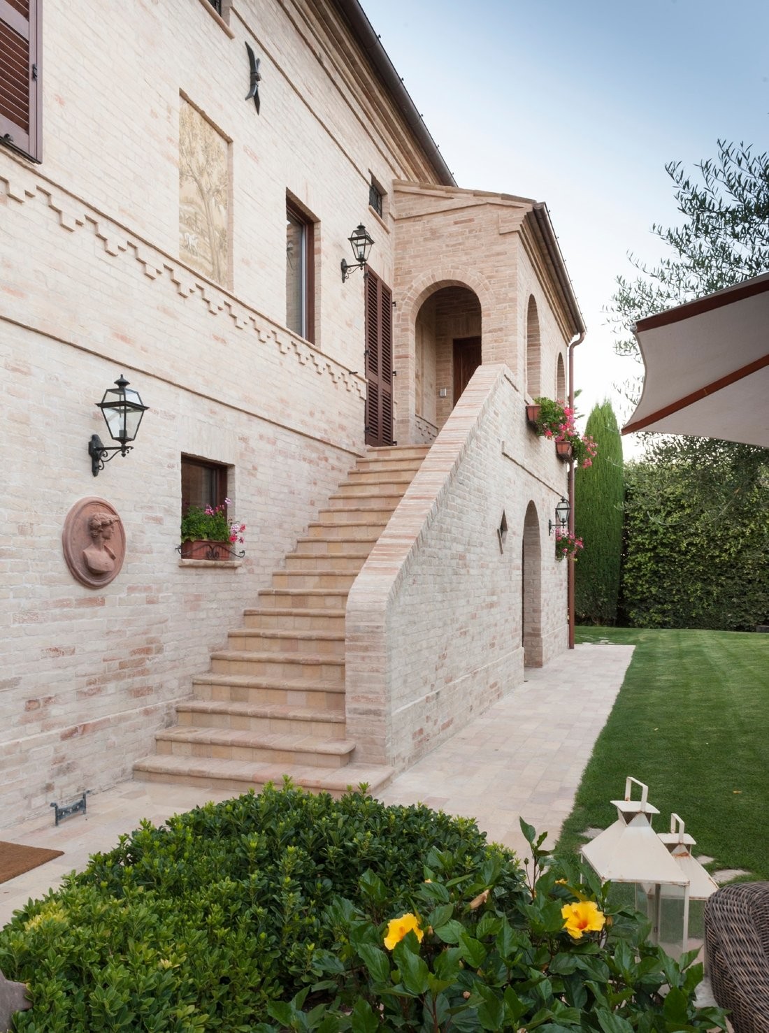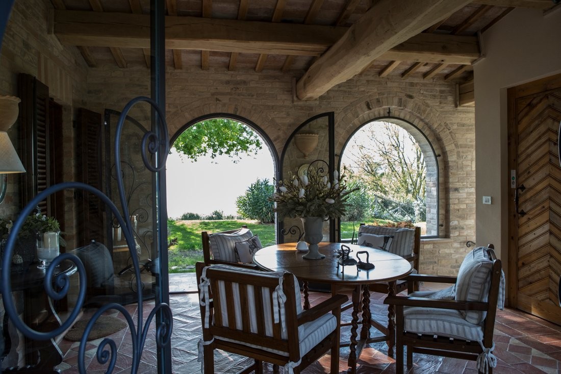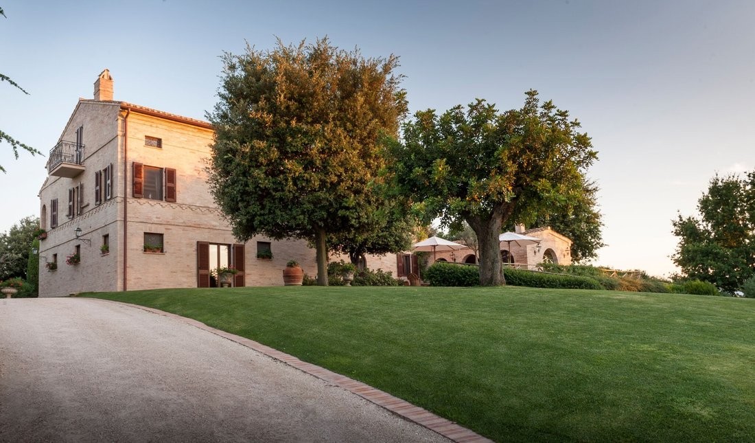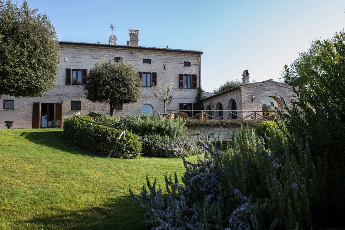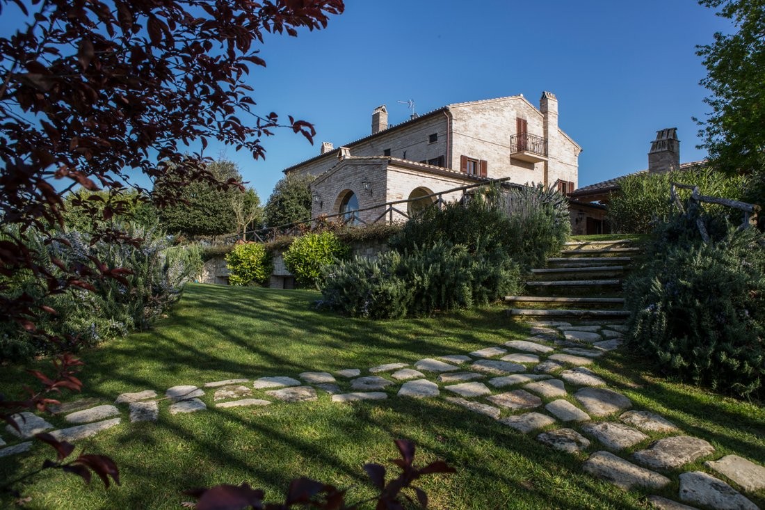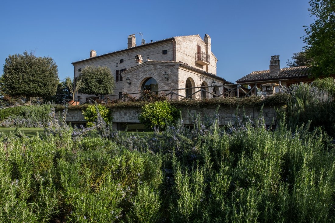 Il casale padronale è stato finemente ristrutturato per valorizzare la vista panoramica sul paesaggio marchigiano verso Fermo. Disposta su cinque livelli, la villa offre sei camere da letto e sei bagni, ampi saloni di rappresentanza, due cucine professionali, un patio interno e un ascensore di servizio. Le dotazioni includono parcheggio sotterraneo, cantina vinicola, sauna e area fitness.