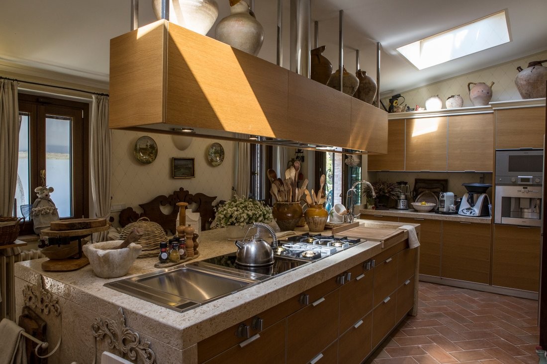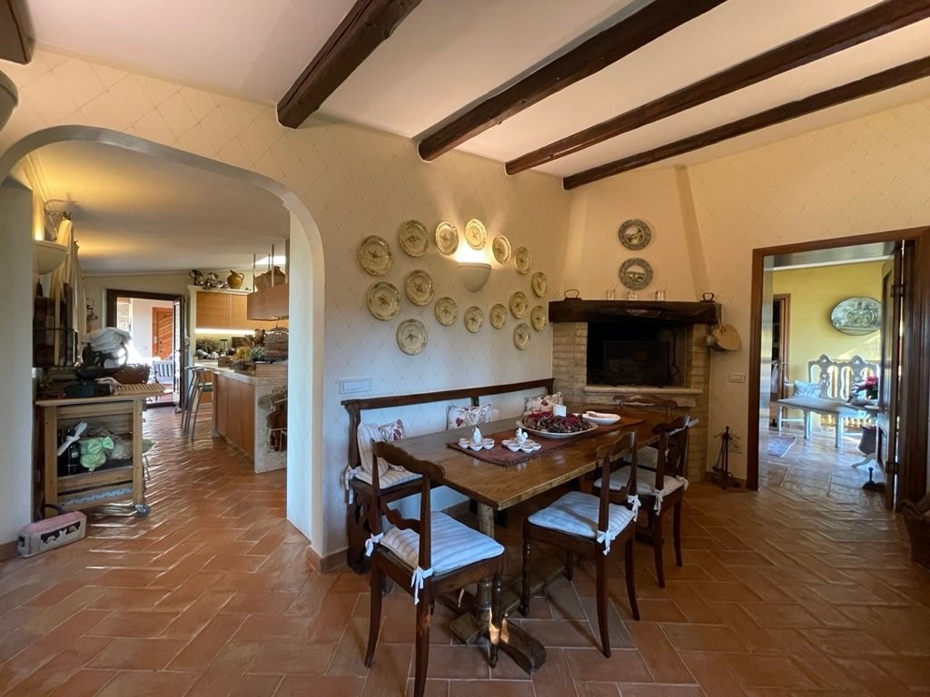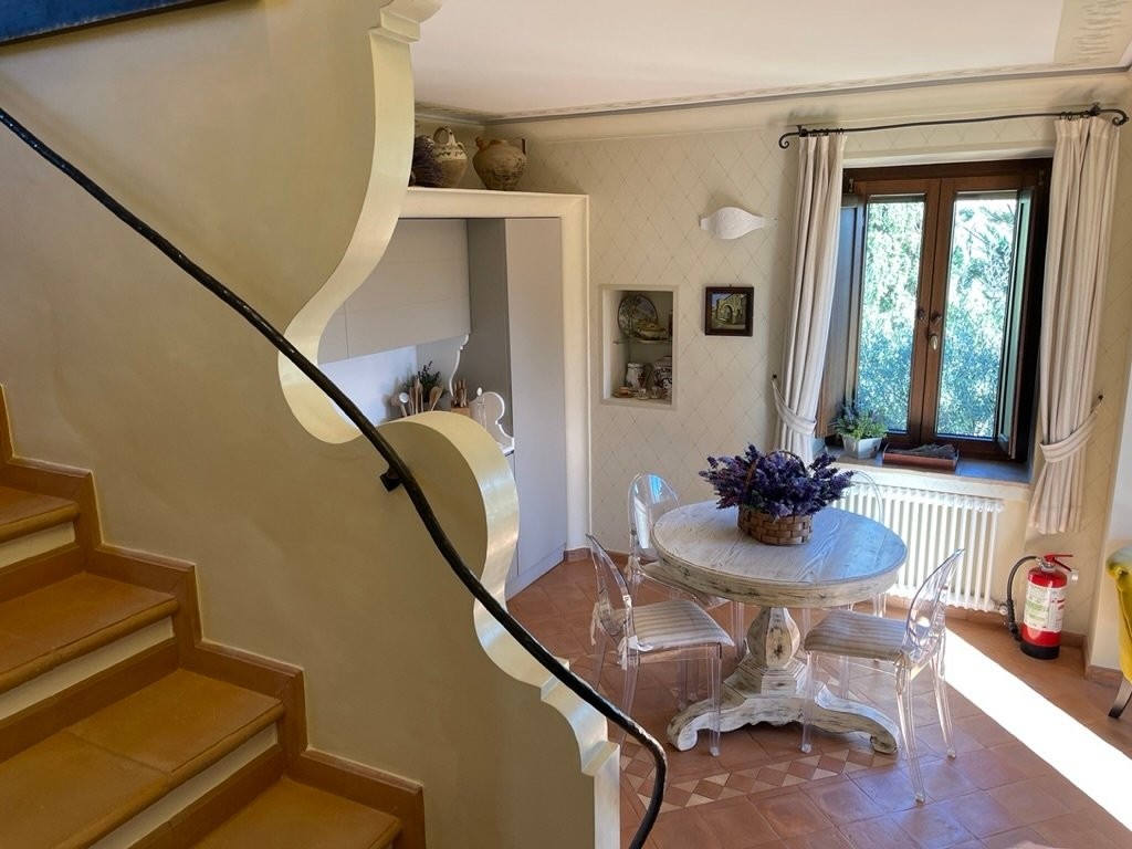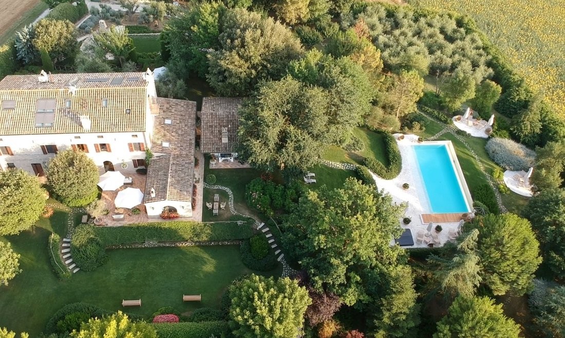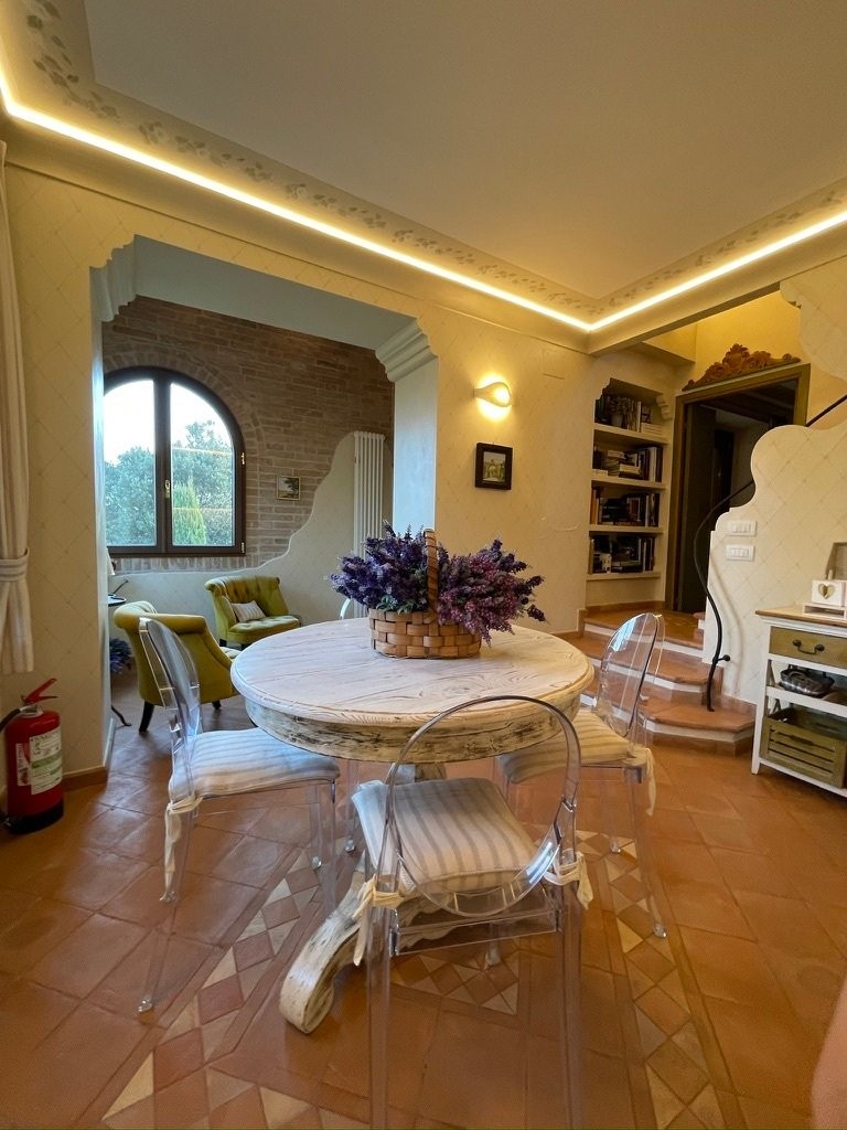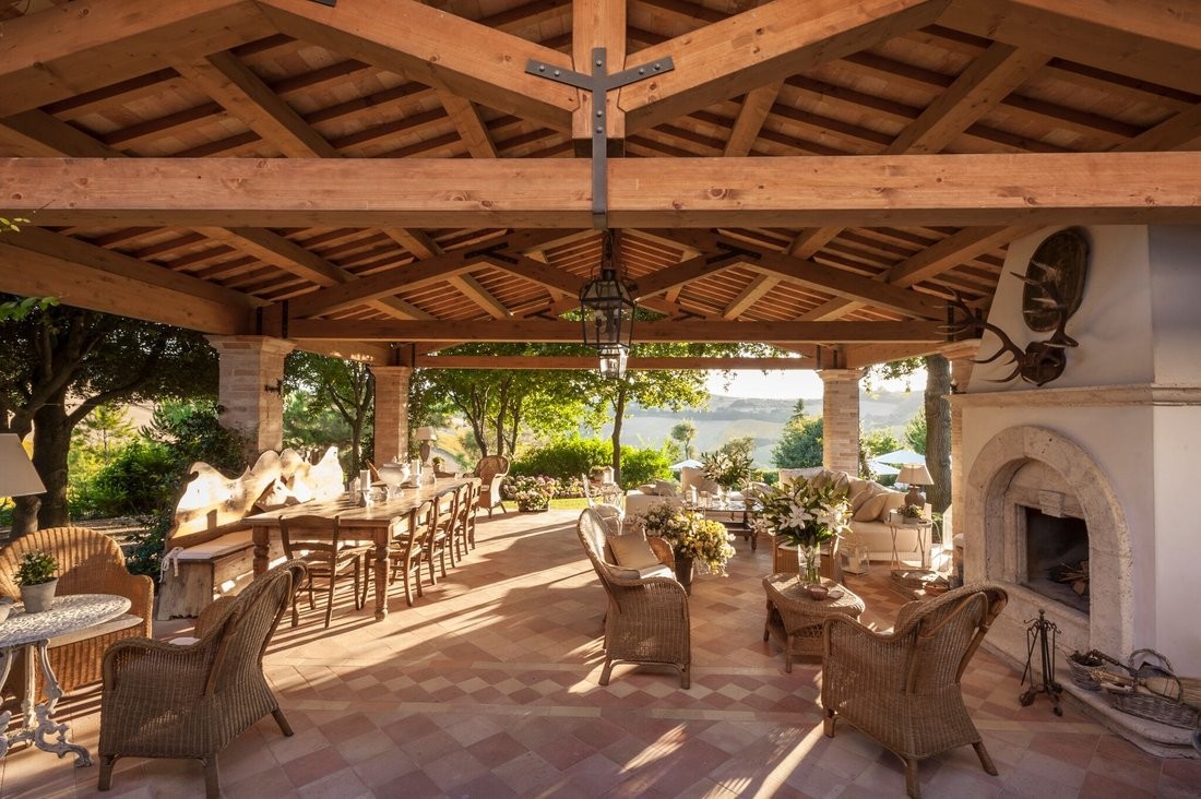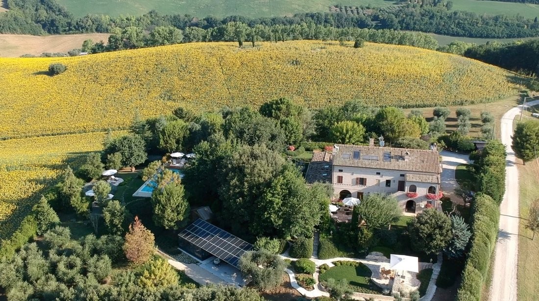 Il casale padronale è stato finemente ristrutturato per valorizzare la vista panoramica sul paesaggio marchigiano verso Fermo. Disposta su cinque livelli, la villa offre sei camere da letto e sei bagni, ampi saloni di rappresentanza, due cucine professionali, un patio interno e un ascensore di servizio. Le dotazioni includono parcheggio sotterraneo, cantina vinicola, sauna e area fitness.