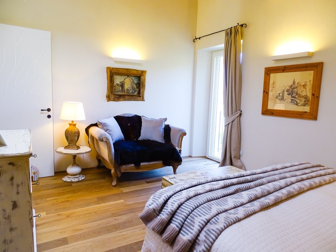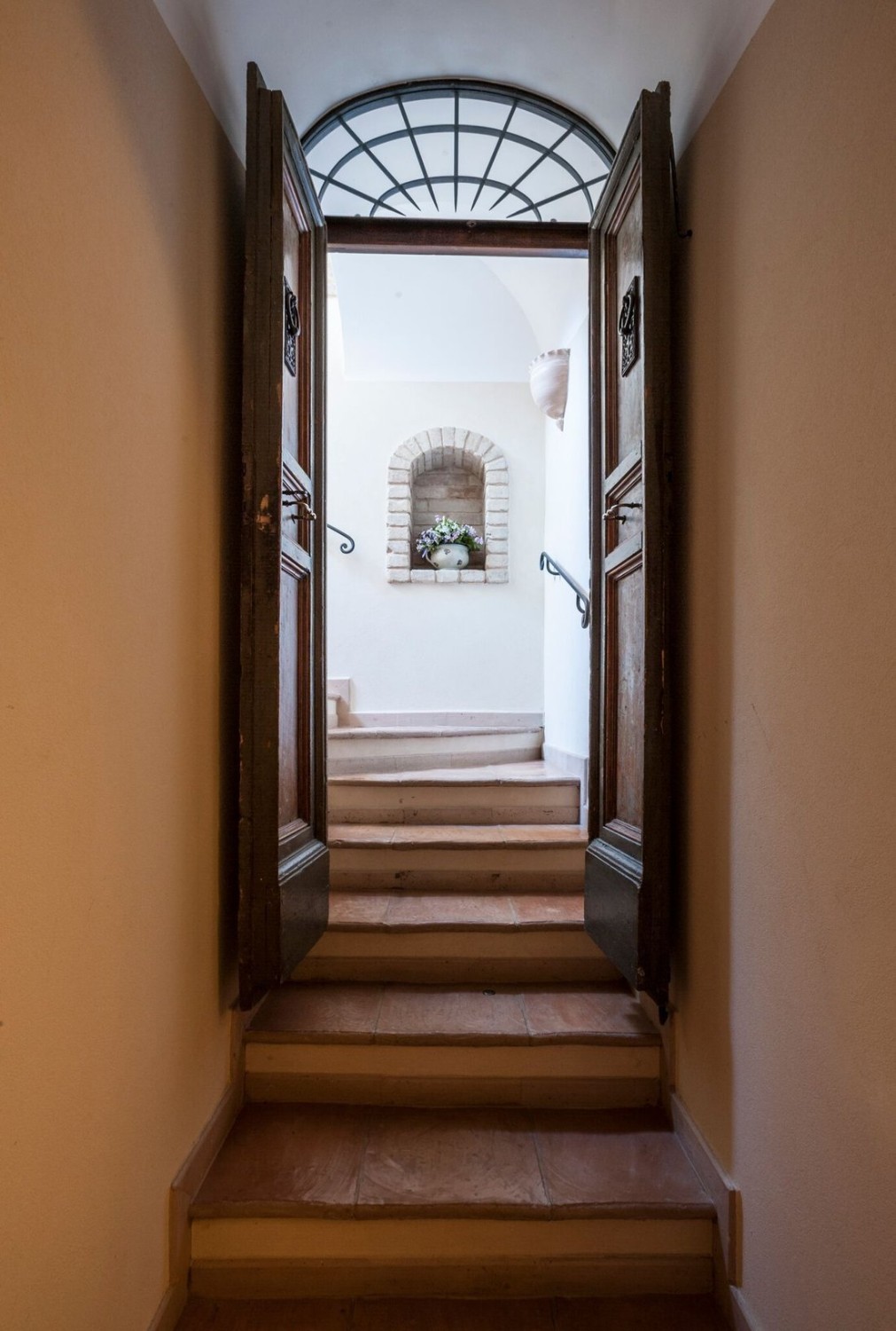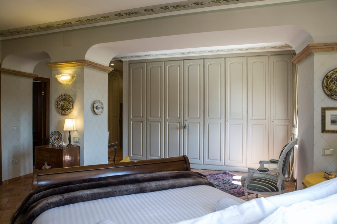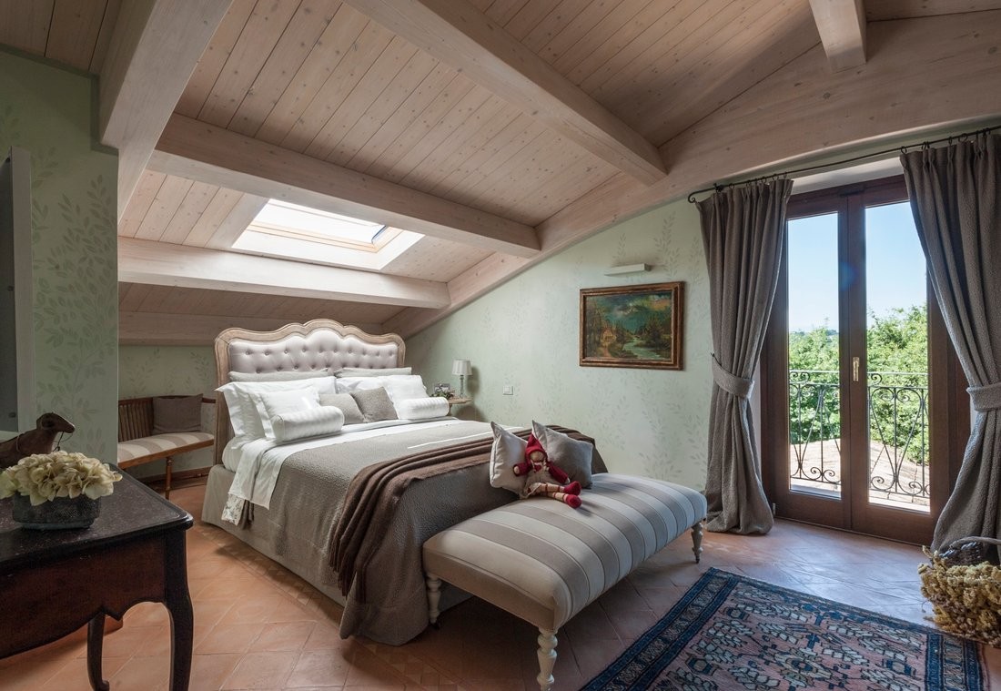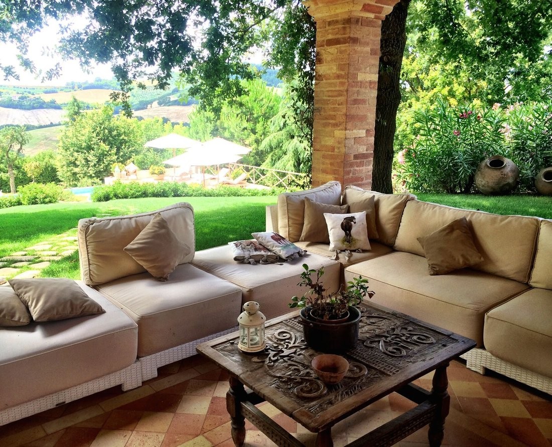 Il casale padronale è stato finemente ristrutturato per valorizzare la vista panoramica sul paesaggio marchigiano verso Fermo. Disposta su cinque livelli, la villa offre sei camere da letto e sei bagni, ampi saloni di rappresentanza, due cucine professionali, un patio interno e un ascensore di servizio. Le dotazioni includono parcheggio sotterraneo, cantina vinicola, sauna e area fitness.