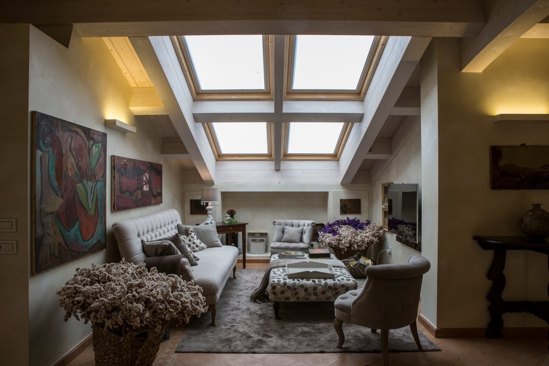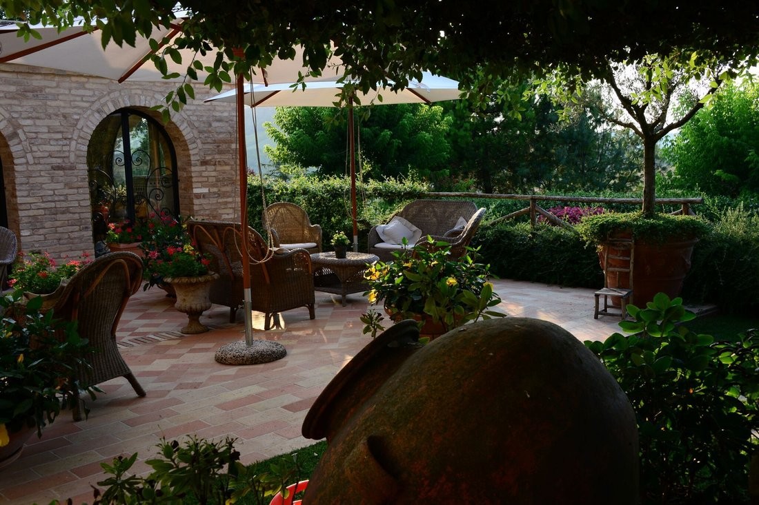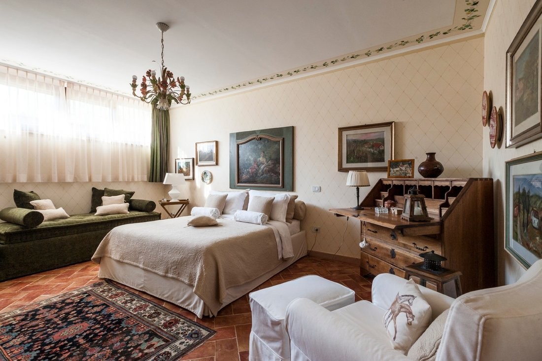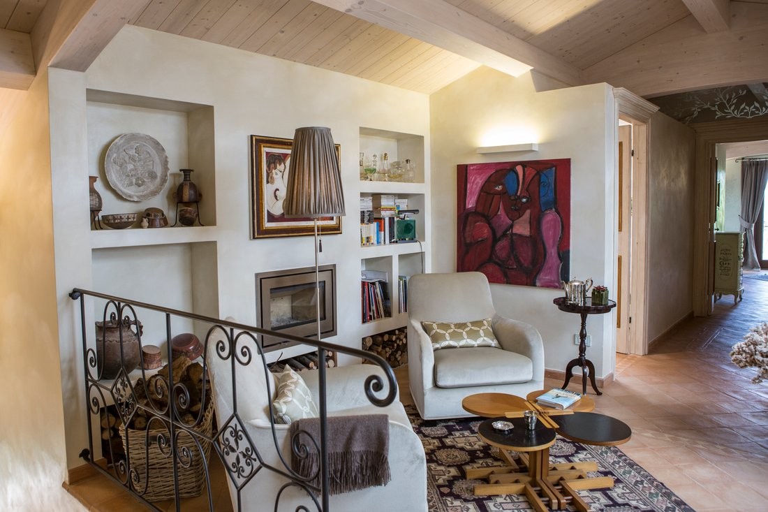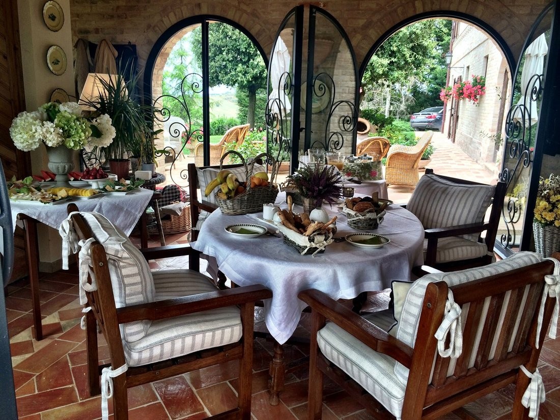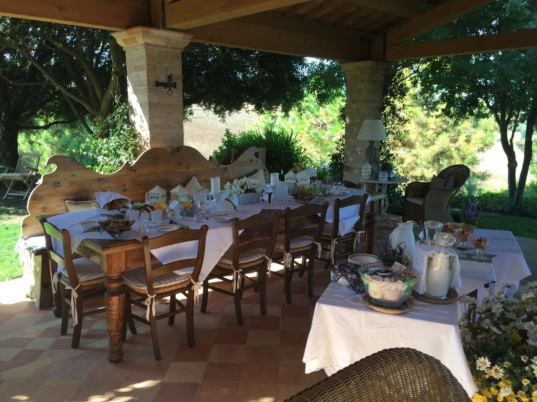 Il casale padronale è stato finemente ristrutturato per valorizzare la vista panoramica sul paesaggio marchigiano verso Fermo. Disposta su cinque livelli, la villa offre sei camere da letto e sei bagni, ampi saloni di rappresentanza, due cucine professionali, un patio interno e un ascensore di servizio. Le dotazioni includono parcheggio sotterraneo, cantina vinicola, sauna e area fitness.