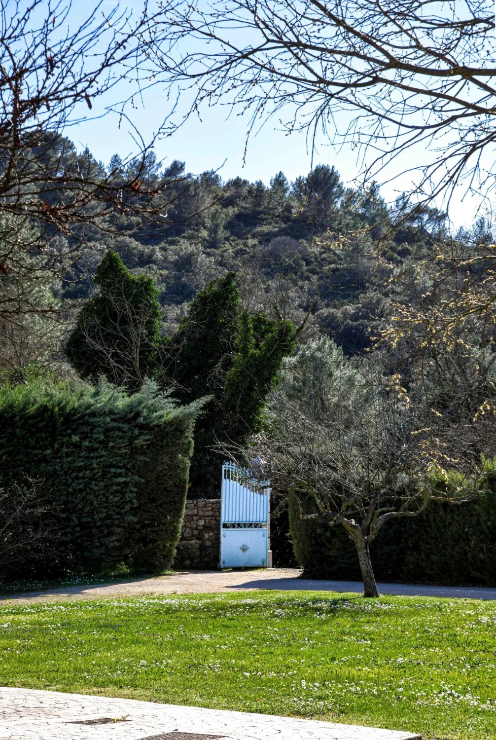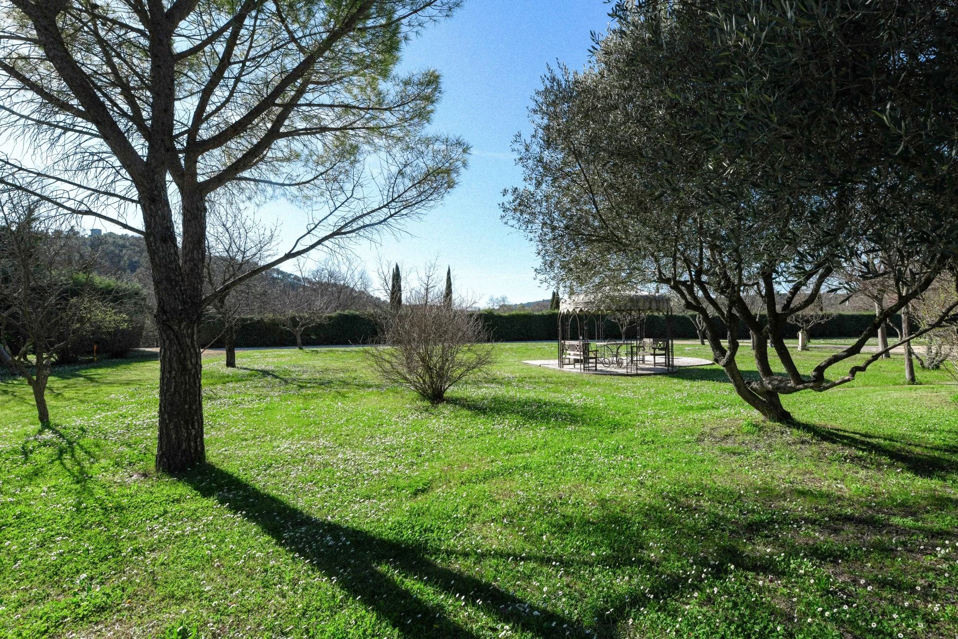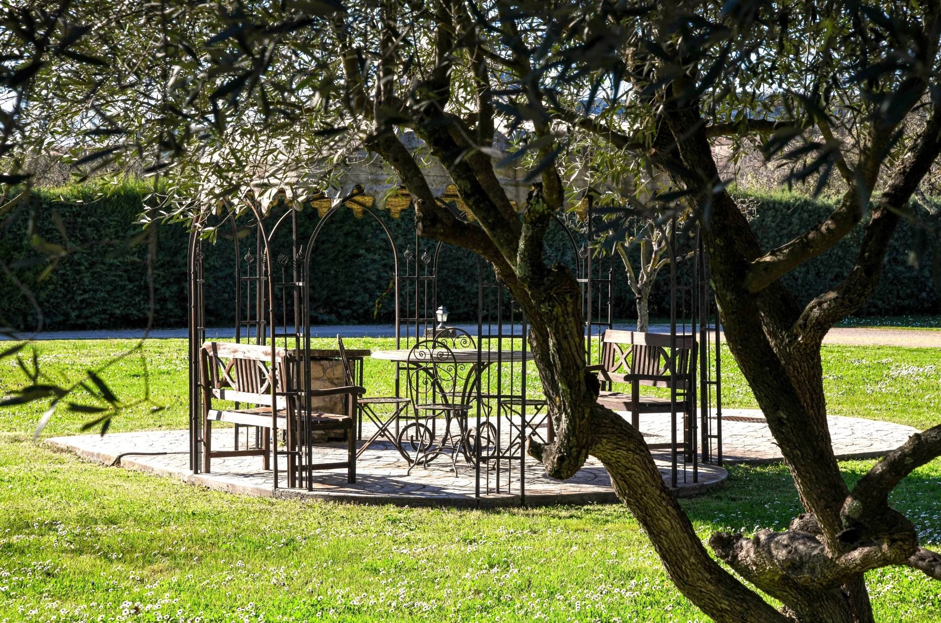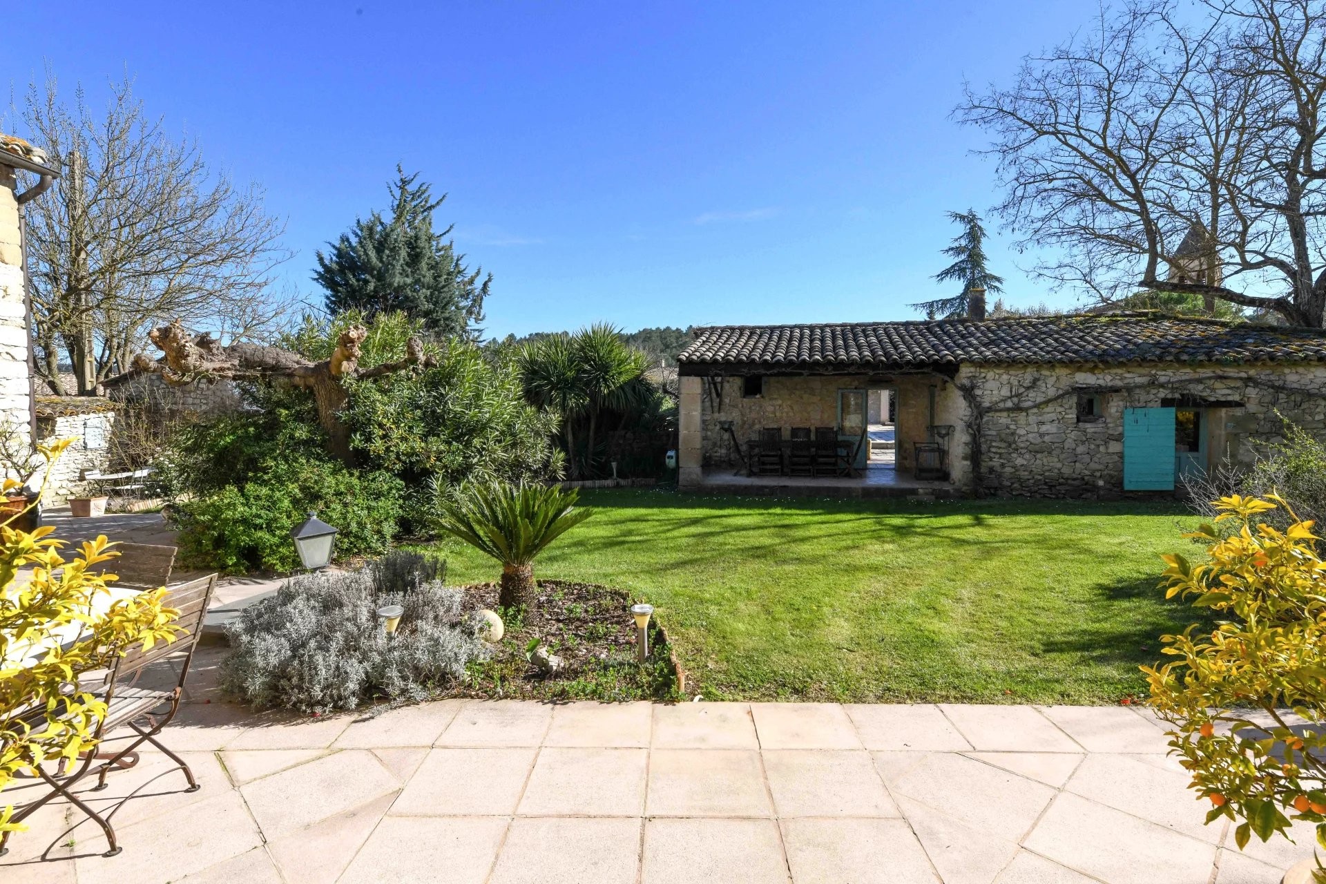 Il parco di circa 6.600 m² è articolato da muri a secco e piantumato con essenze mediterranee. Una grande piscina (15 × 7 m) con ampie zone prendisole è al centro della proprietà, completata da una terrazza coperta. Presente anche una dependance con cucina, camera e bagno.