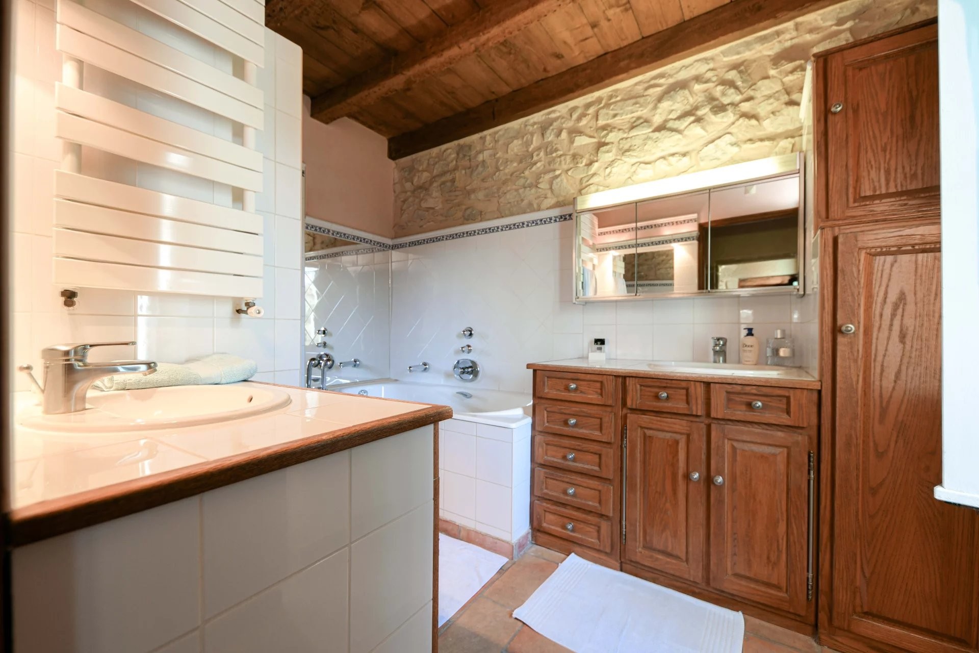 Al piano terra si trova una suite di 25 m² con pavimenti in cotto, soffitti con travi a vista, vista sul giardino ed esposizione a sud. Al piano superiore quattro camere da letto: tre condividono un bagno, la quarta dispone di bagno privato su una galleria. Su questo livello si trova anche un accogliente salotto tipo club. All’ultimo piano, una camera di 16 m² con accesso a una galleria di 13 m² sopra il secondo soggiorno.