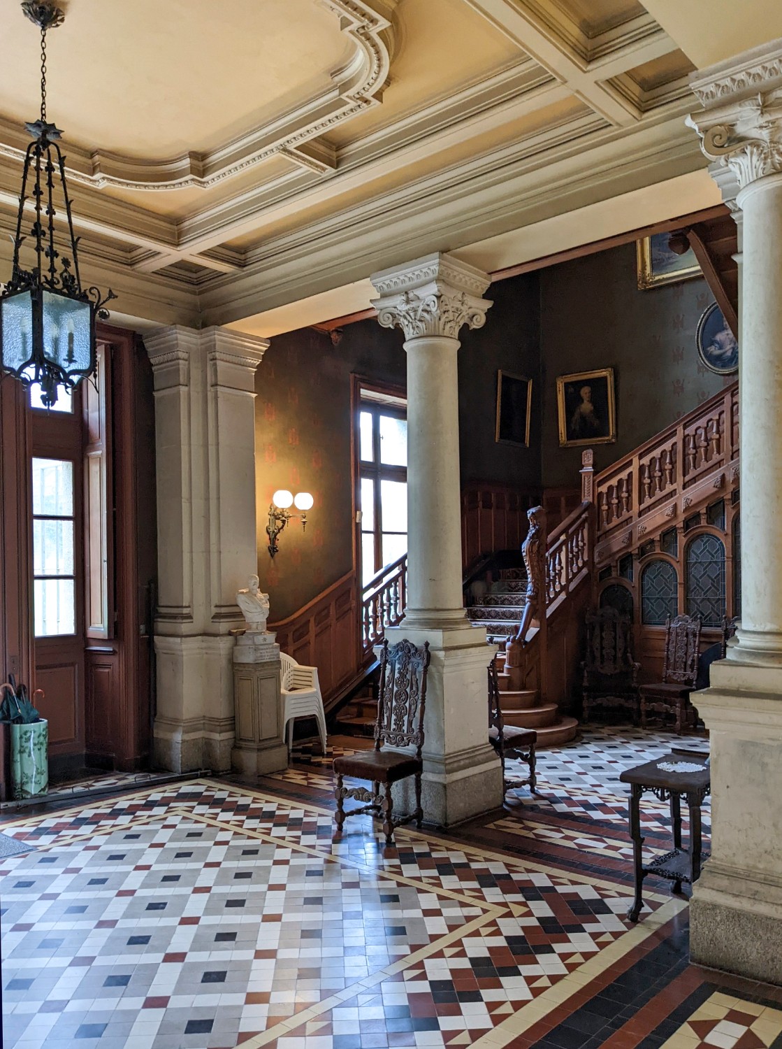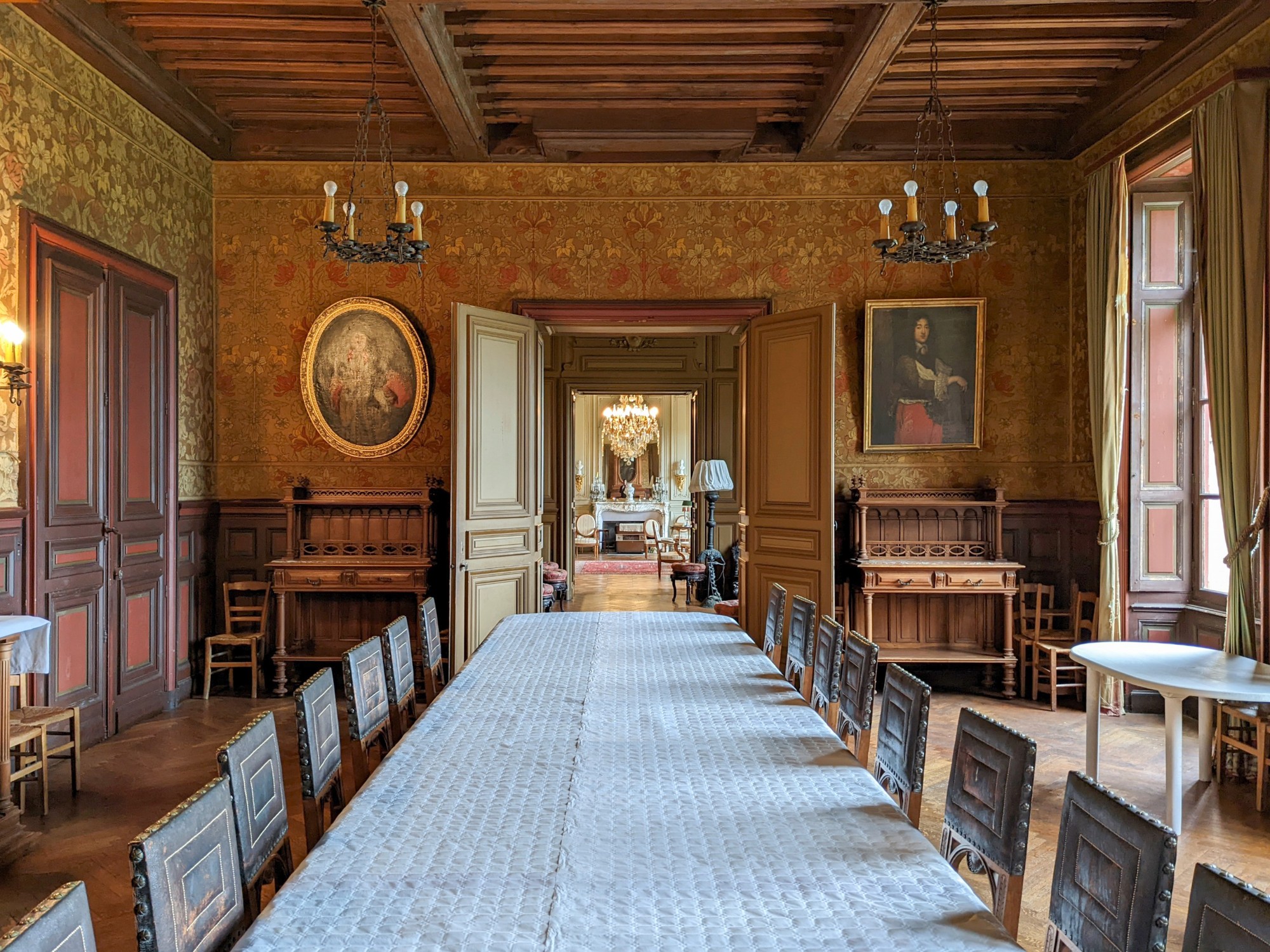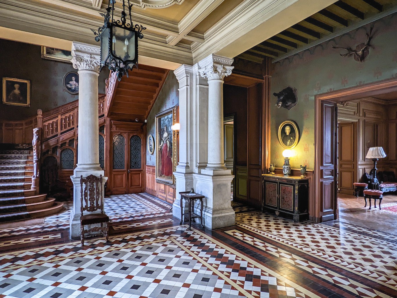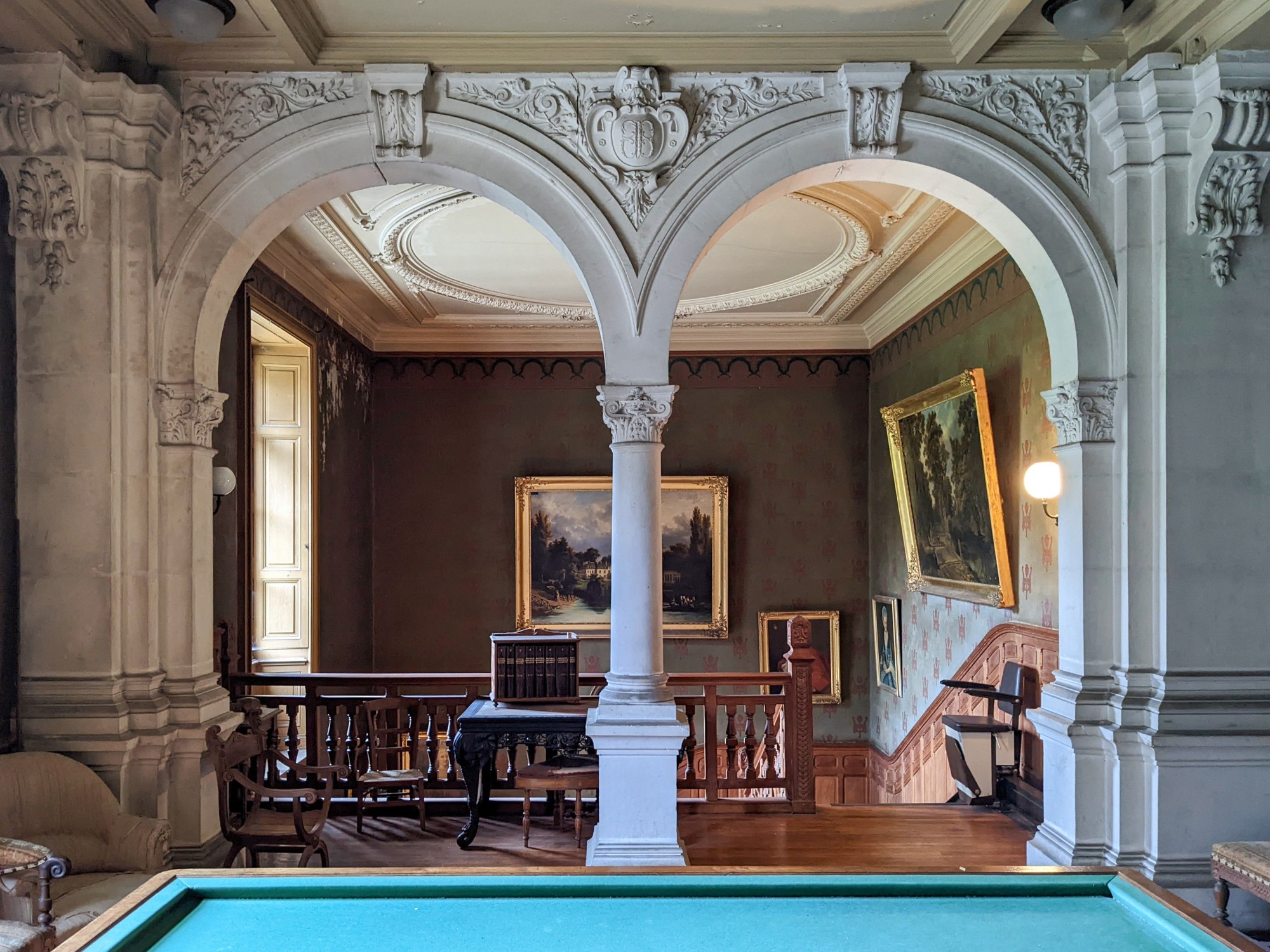 Si presenta con una sezione principale centrale, affiancata da padiglioni e da una cappella del castello. Un ricco repertorio architettonico, che comprende vetrate, ornamenti in legno, caminetti in marmo e soffitti in stucco antico, impreziosisce gli interni. Dalla cantina alla soffitta, il castello offre una varietà di stanze e aree, alcune bisognose di restauro, ma generalmente ben conservate.