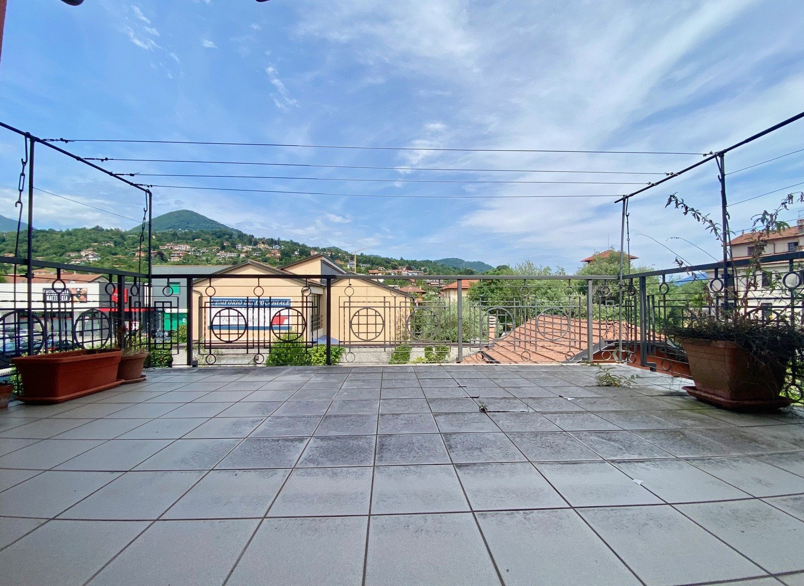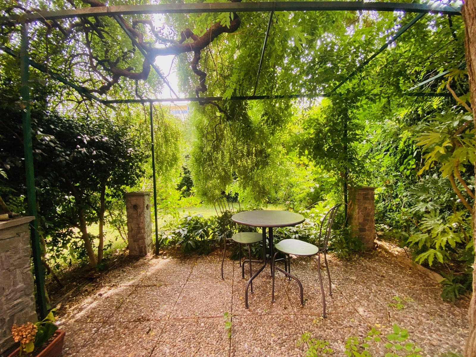Una scala interna conduce al piano superiore, dove si trova un appartamento ampio e luminoso con ingresso, cucina con zona pranzo, sala da pranzo separata, soggiorno con accesso a una terrazza, bagno, due camere grandi e una seconda terrazza con vista sul giardino.