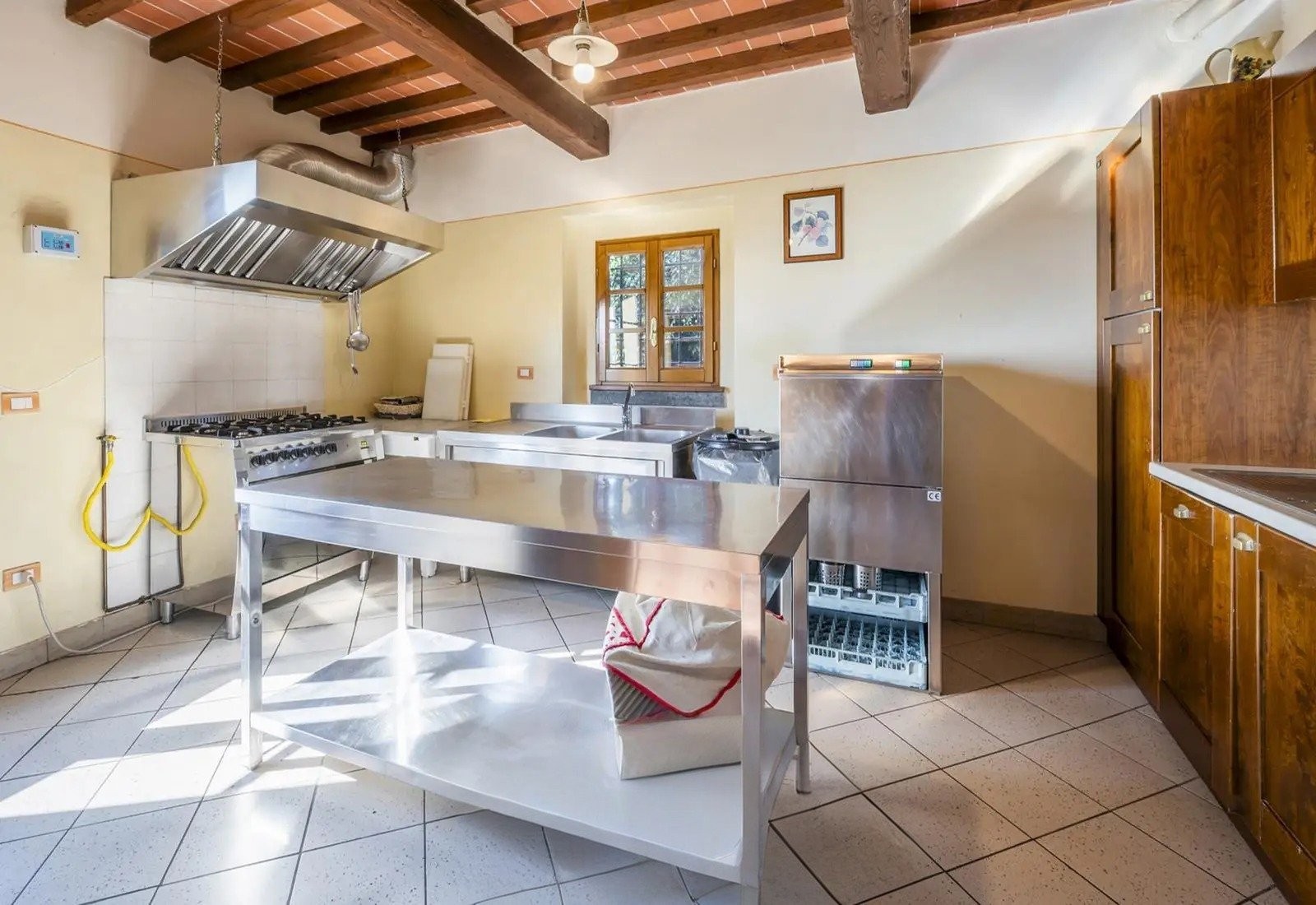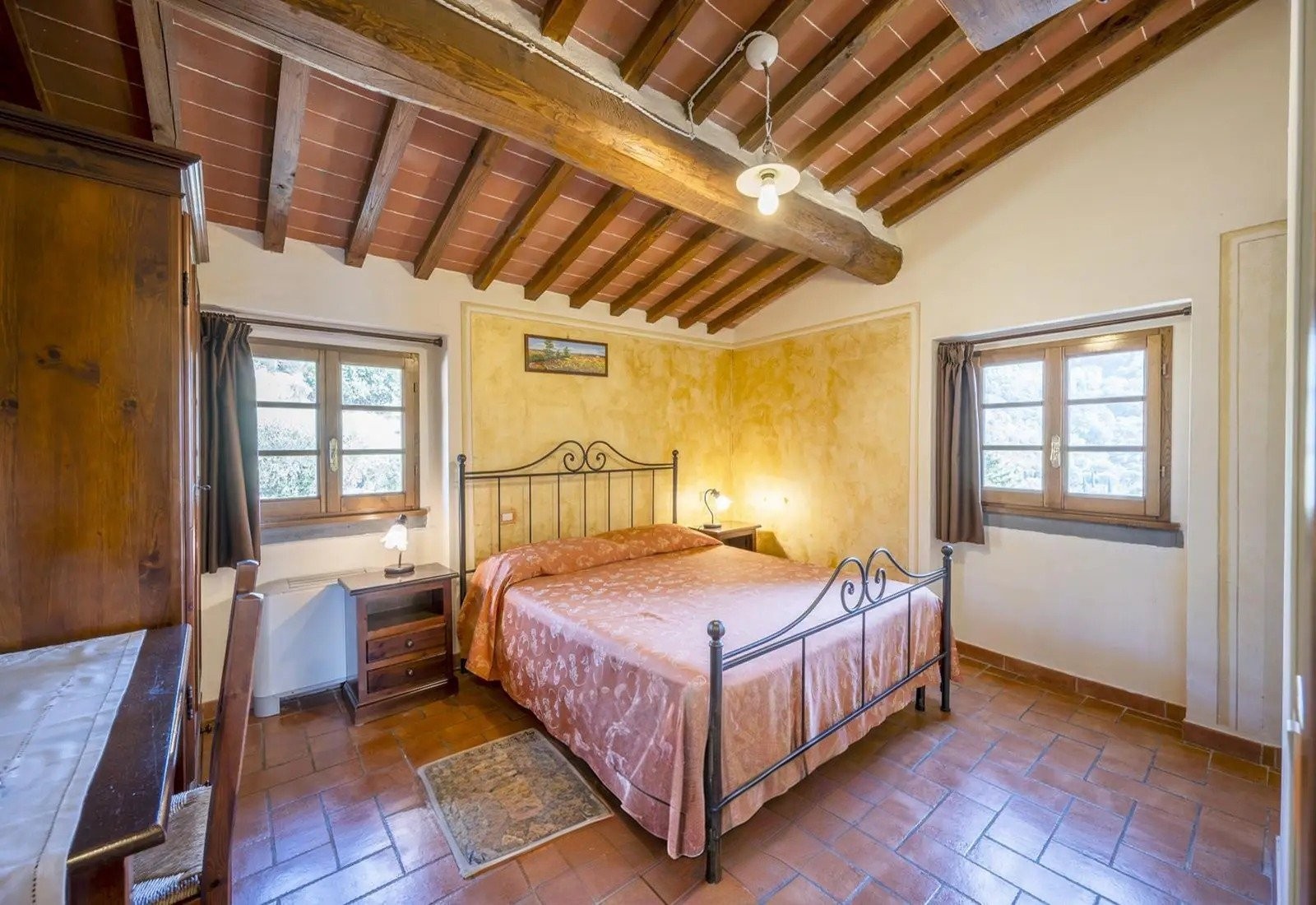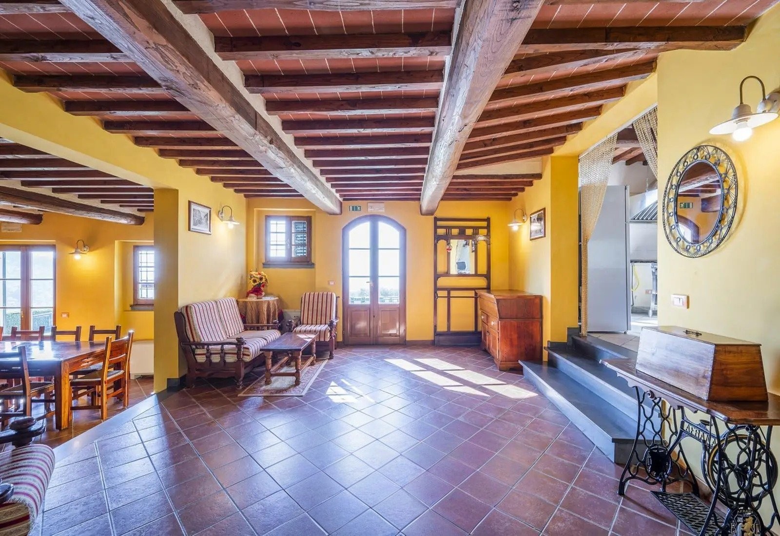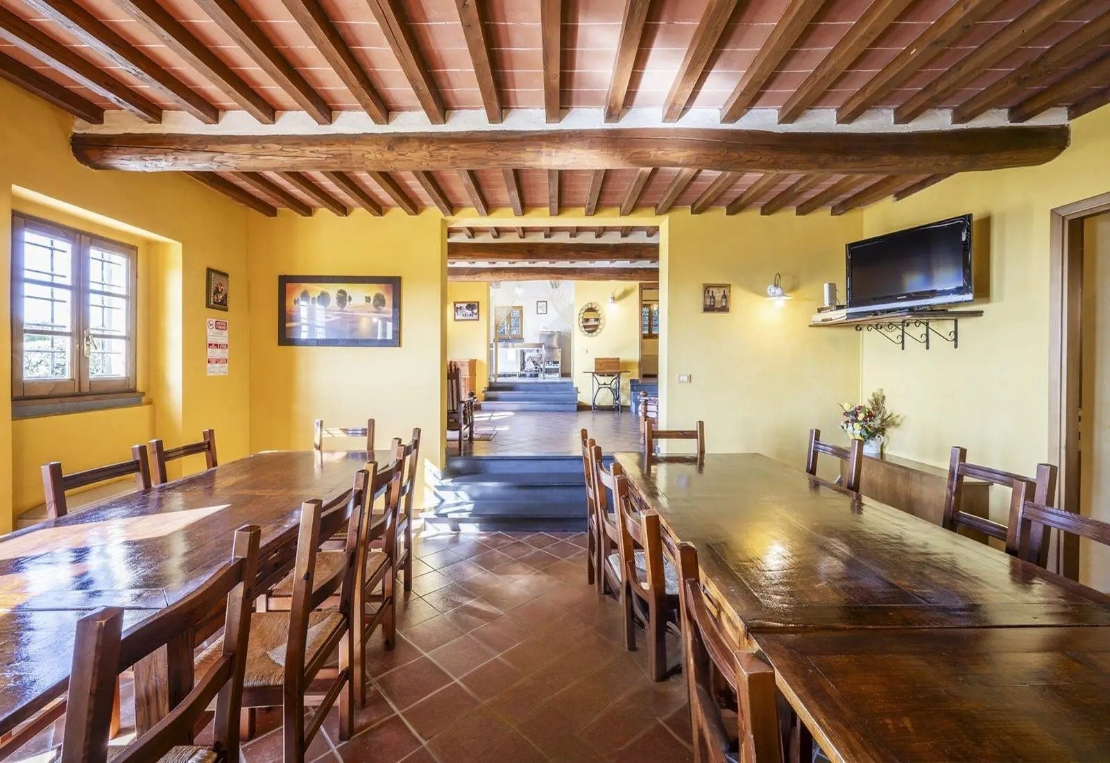 La villa si articola su tre livelli e dispone di 11 camere da letto e 15 bagni, garantendo privacy e comfort per famiglie numerose o gruppi di amici. Gli interni richiamano la tradizione toscana con travi a vista, pareti in pietra, pavimenti in legno e tonalità naturali che valorizzano la luce del giorno. Due ampi saloni con camino costituiscono il fulcro della vita sociale; uno di essi al piano terra è dotato di un bar ideale per ricevimenti e momenti conviviali.