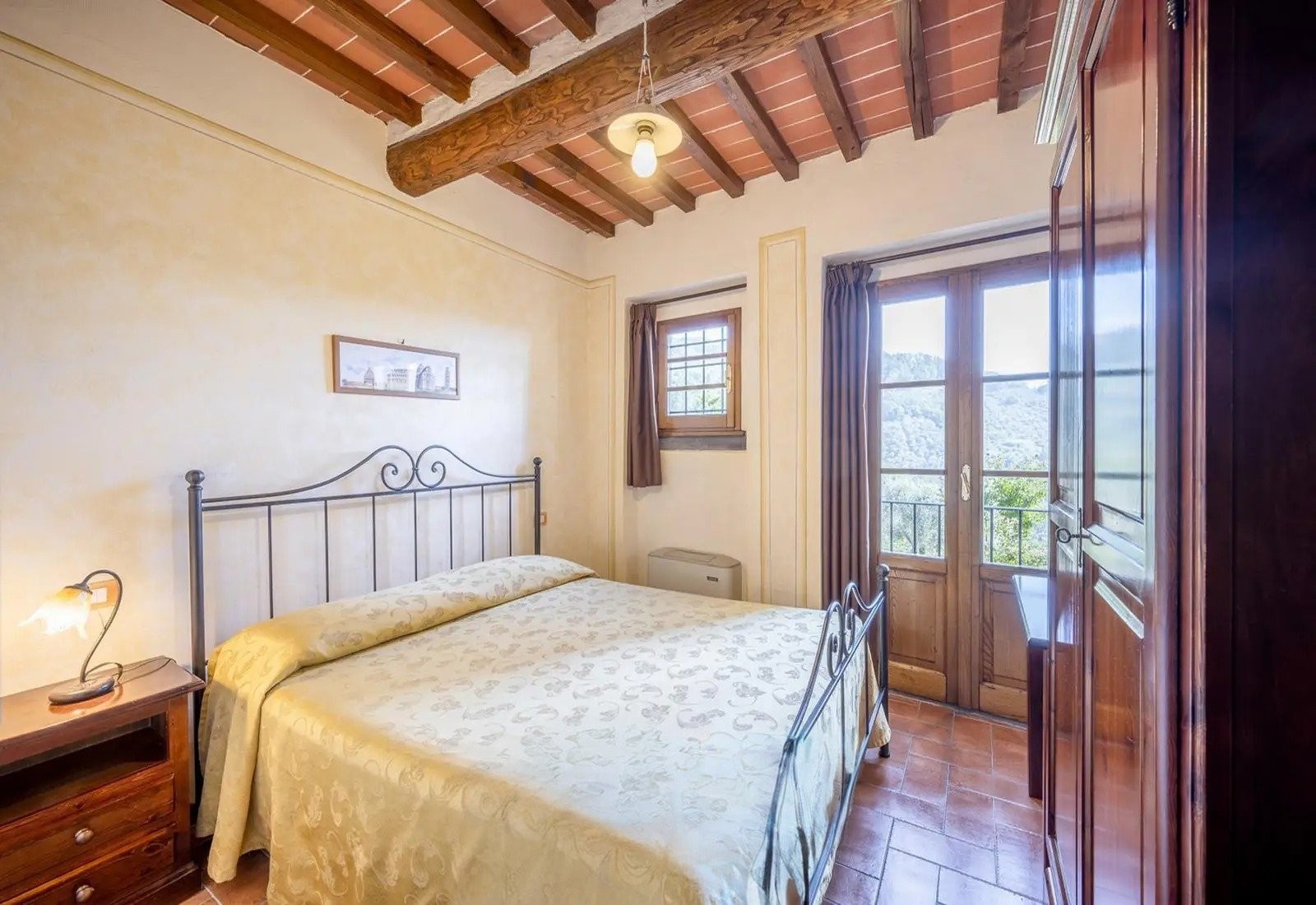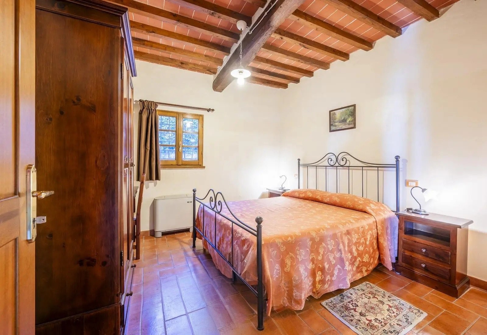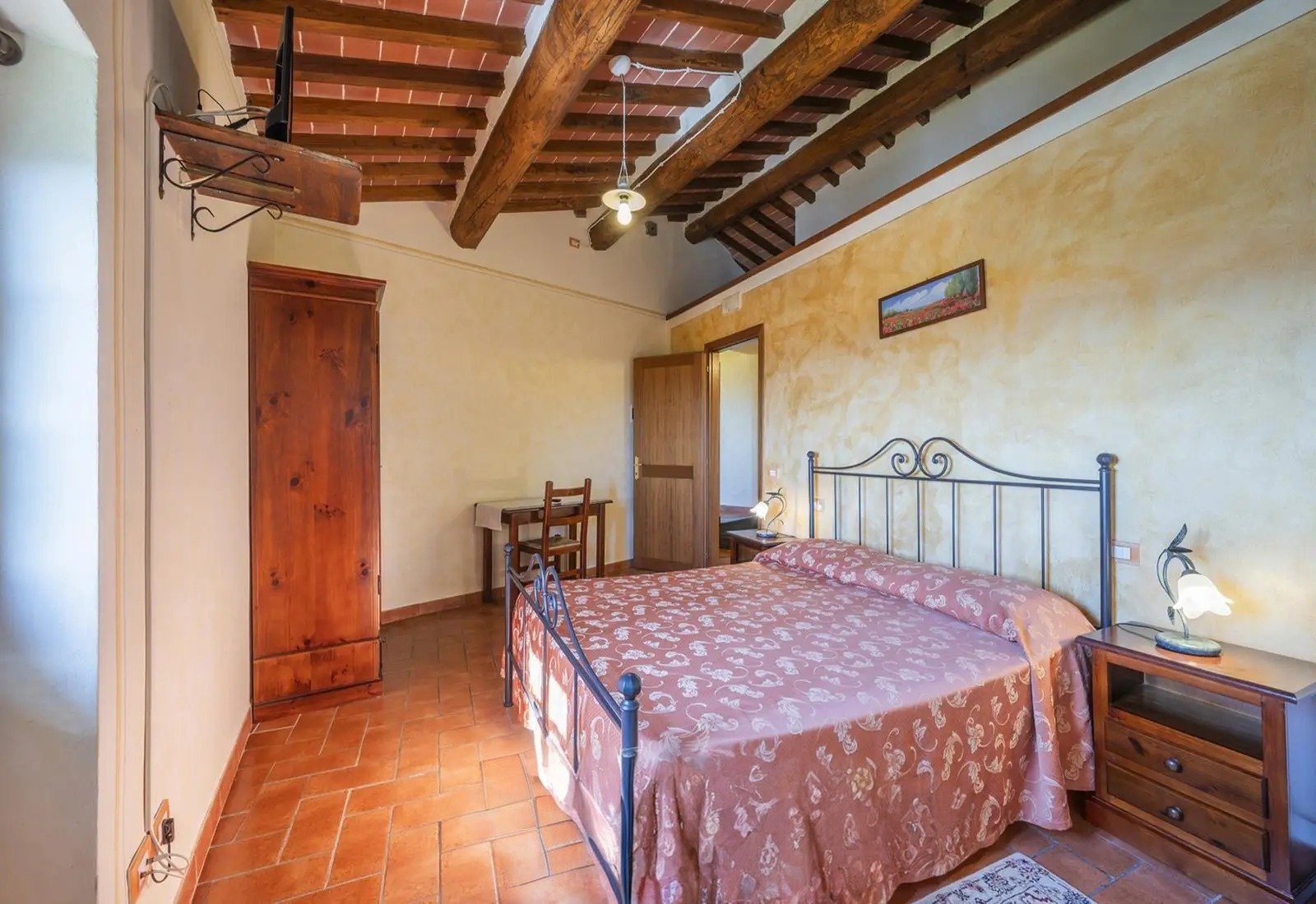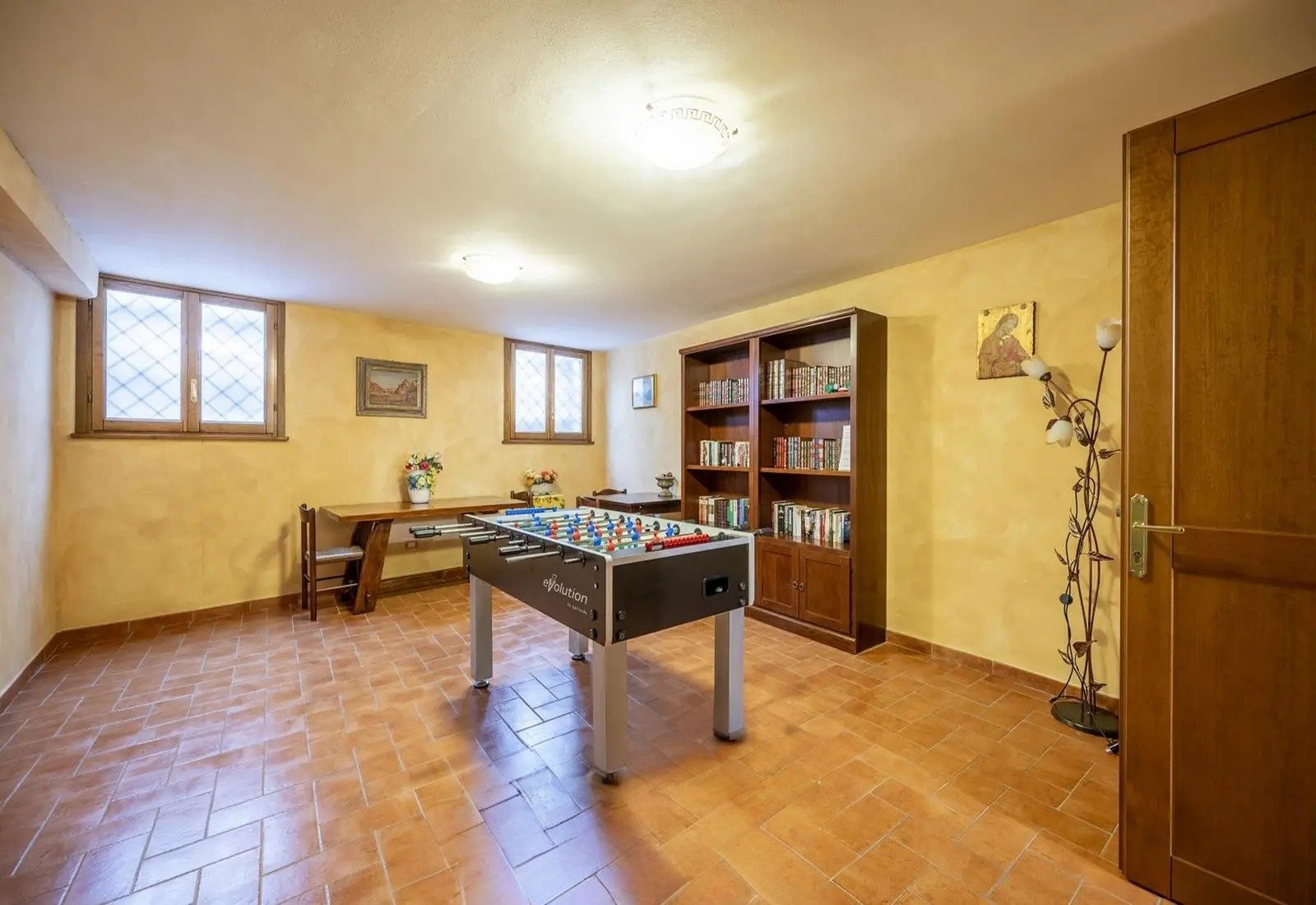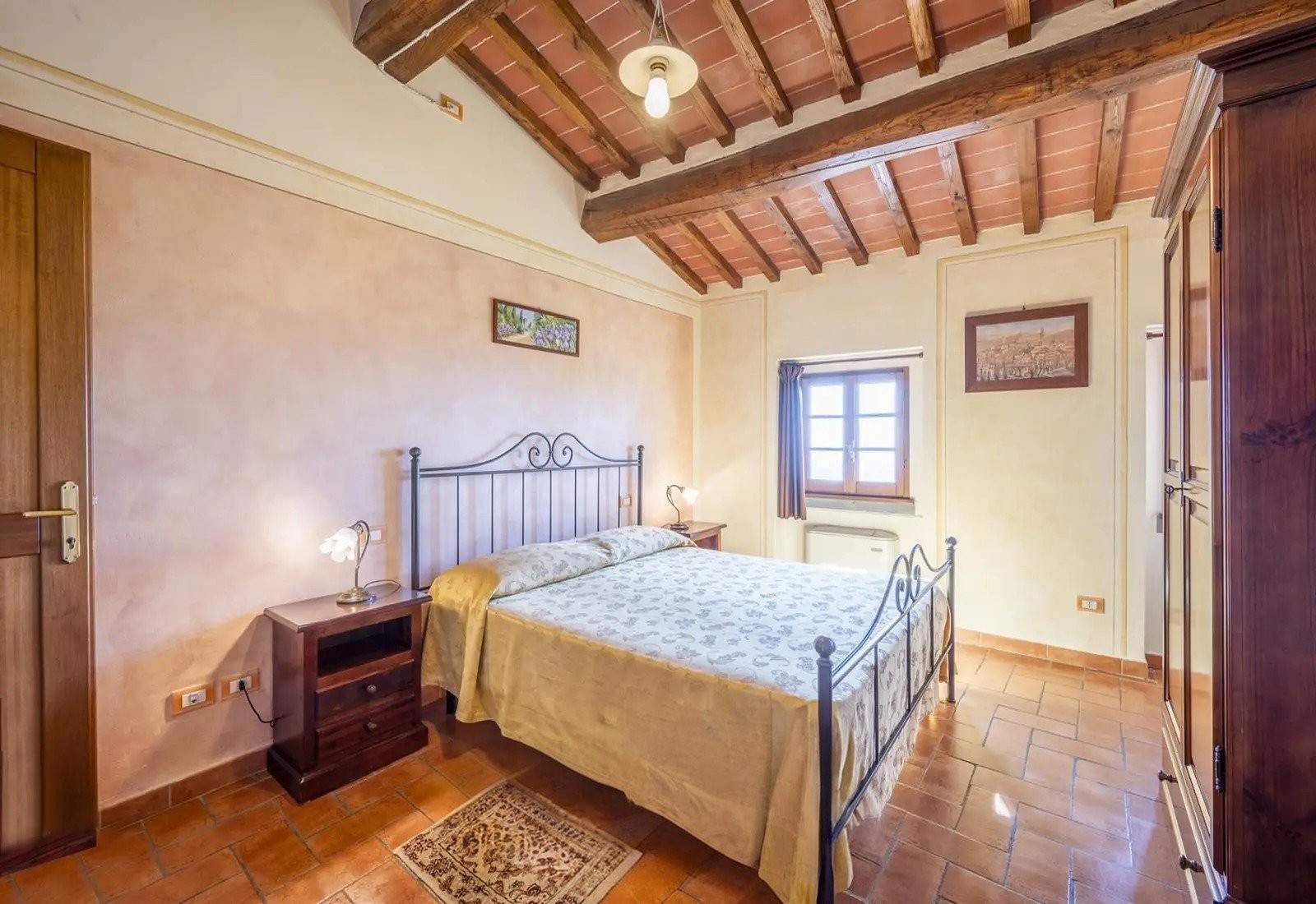 La villa si articola su tre livelli e dispone di 11 camere da letto e 15 bagni, garantendo privacy e comfort per famiglie numerose o gruppi di amici. Gli interni richiamano la tradizione toscana con travi a vista, pareti in pietra, pavimenti in legno e tonalità naturali che valorizzano la luce del giorno. Due ampi saloni con camino costituiscono il fulcro della vita sociale; uno di essi al piano terra è dotato di un bar ideale per ricevimenti e momenti conviviali.