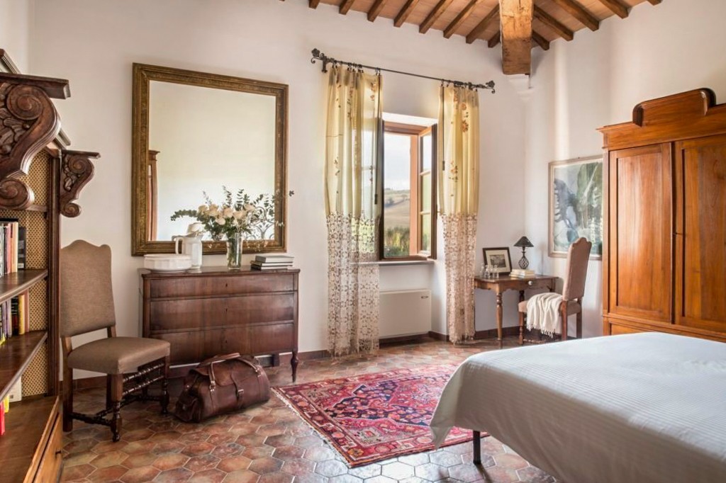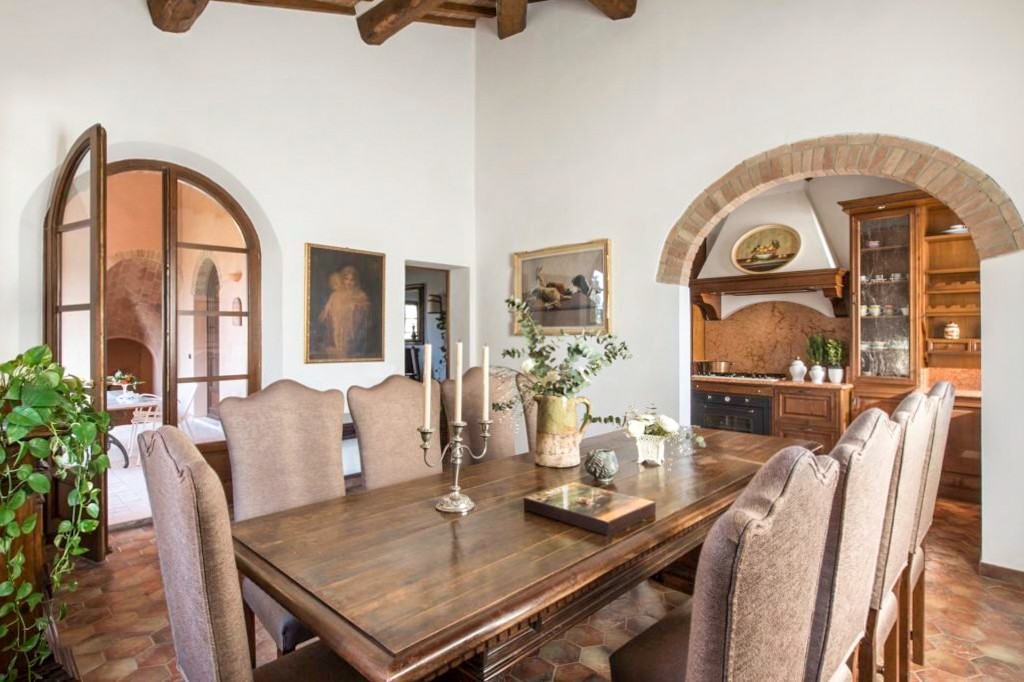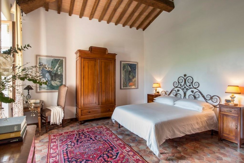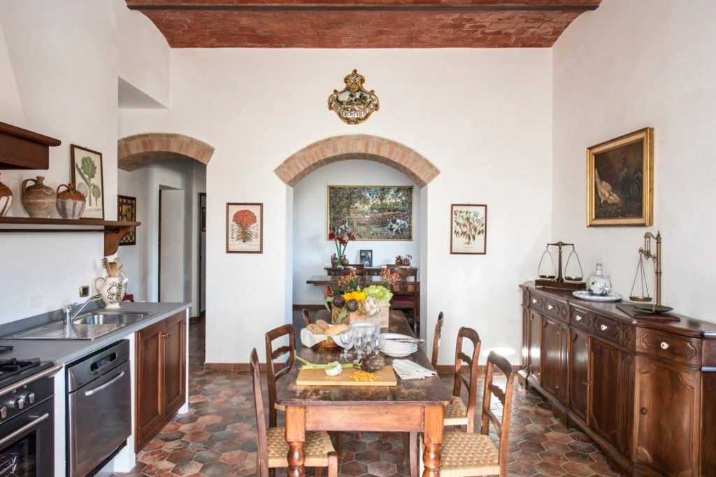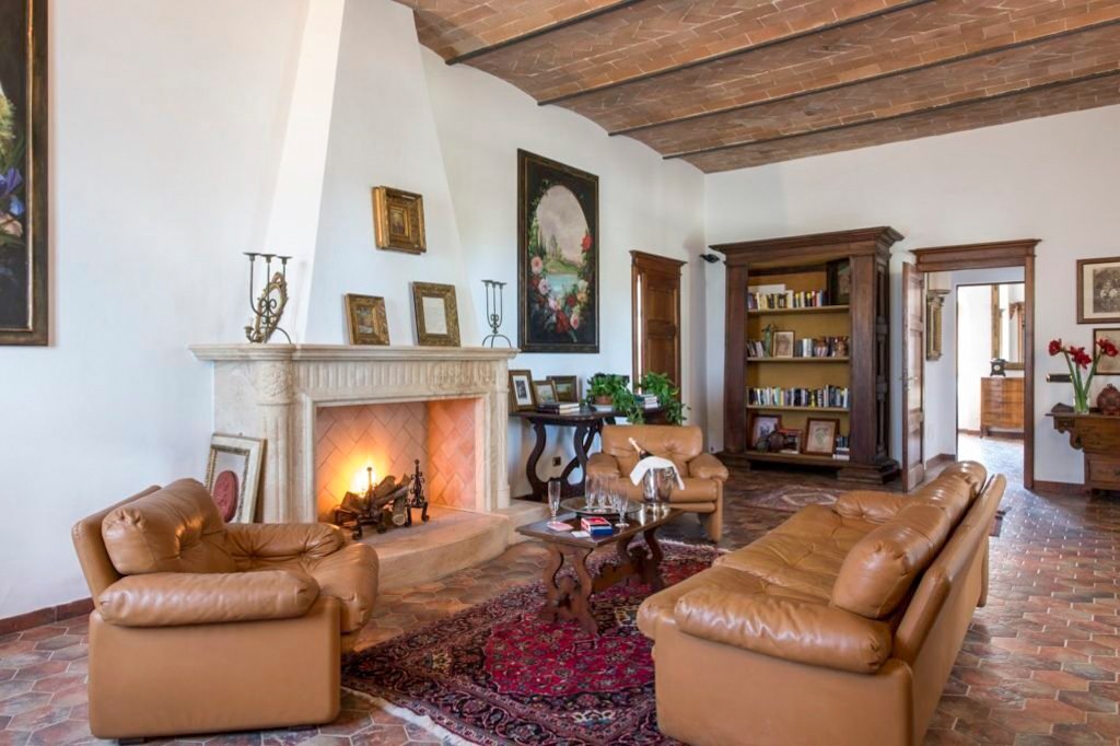 Una scala esterna, tipica delle ville rurali toscane, conduce al primo piano, dove si trovano un secondo soggiorno con camino d’epoca, una seconda cucina con sala da pranzo e un’ampia terrazza panoramica. Qui sono collocate anche tre camere da letto con bagno privato, arredate con materiali di pregio nel rispetto dello stile originario.