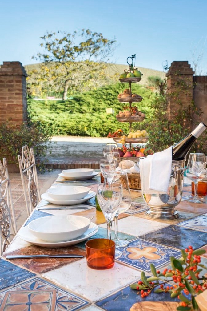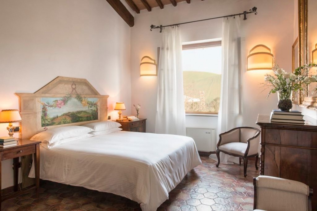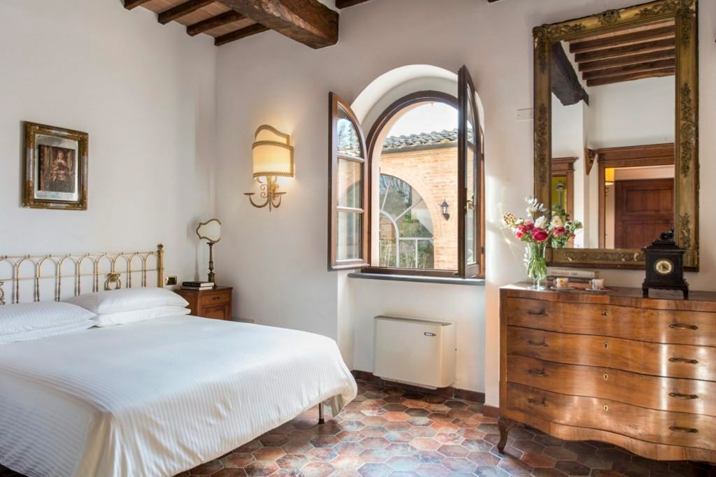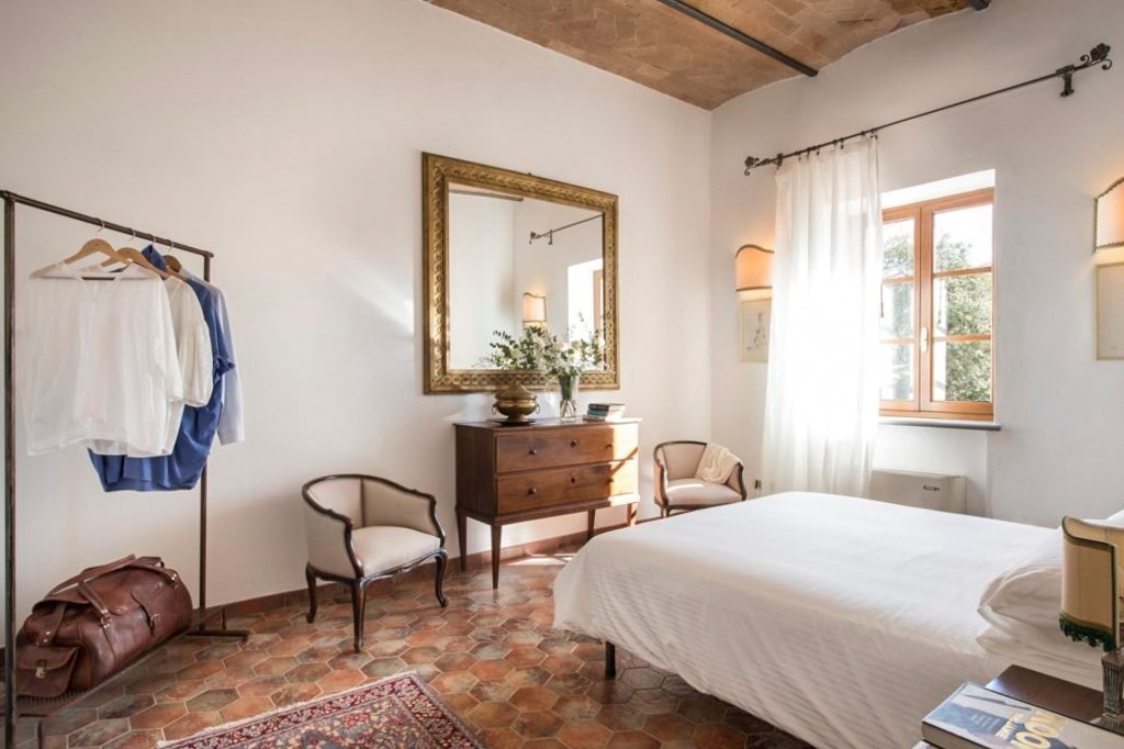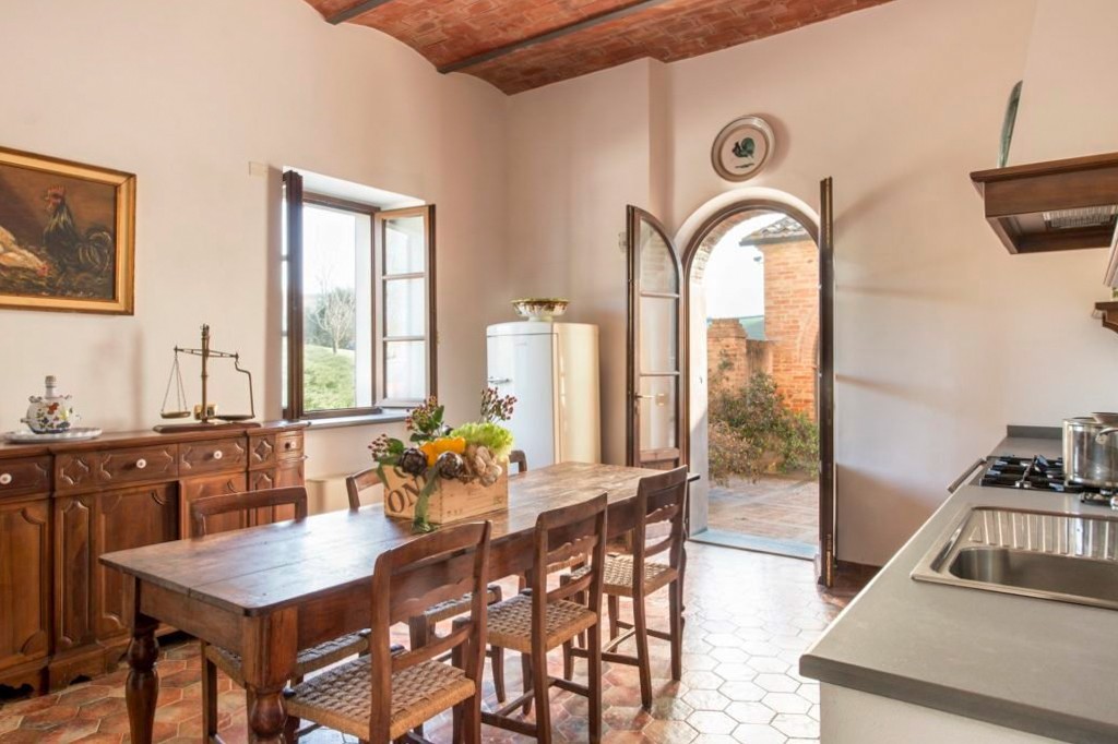Una scala esterna, tipica delle ville rurali toscane, conduce al primo piano, dove si trovano un secondo soggiorno con camino d’epoca, una seconda cucina con sala da pranzo e un’ampia terrazza panoramica. Qui sono collocate anche tre camere da letto con bagno privato, arredate con materiali di pregio nel rispetto dello stile originario.