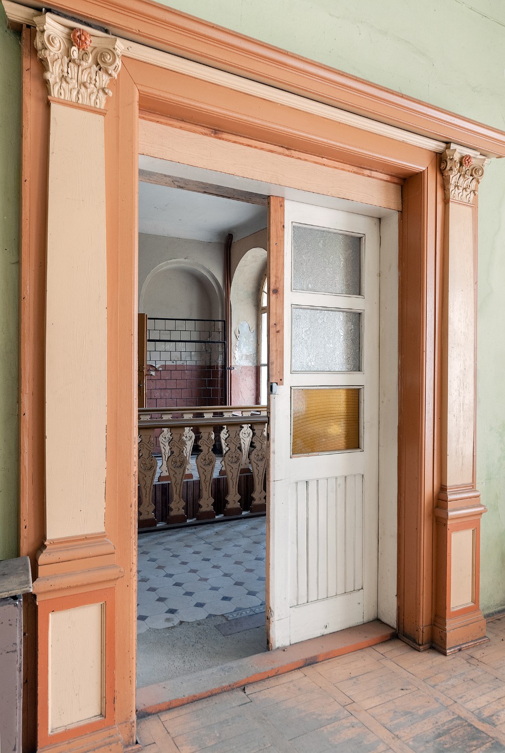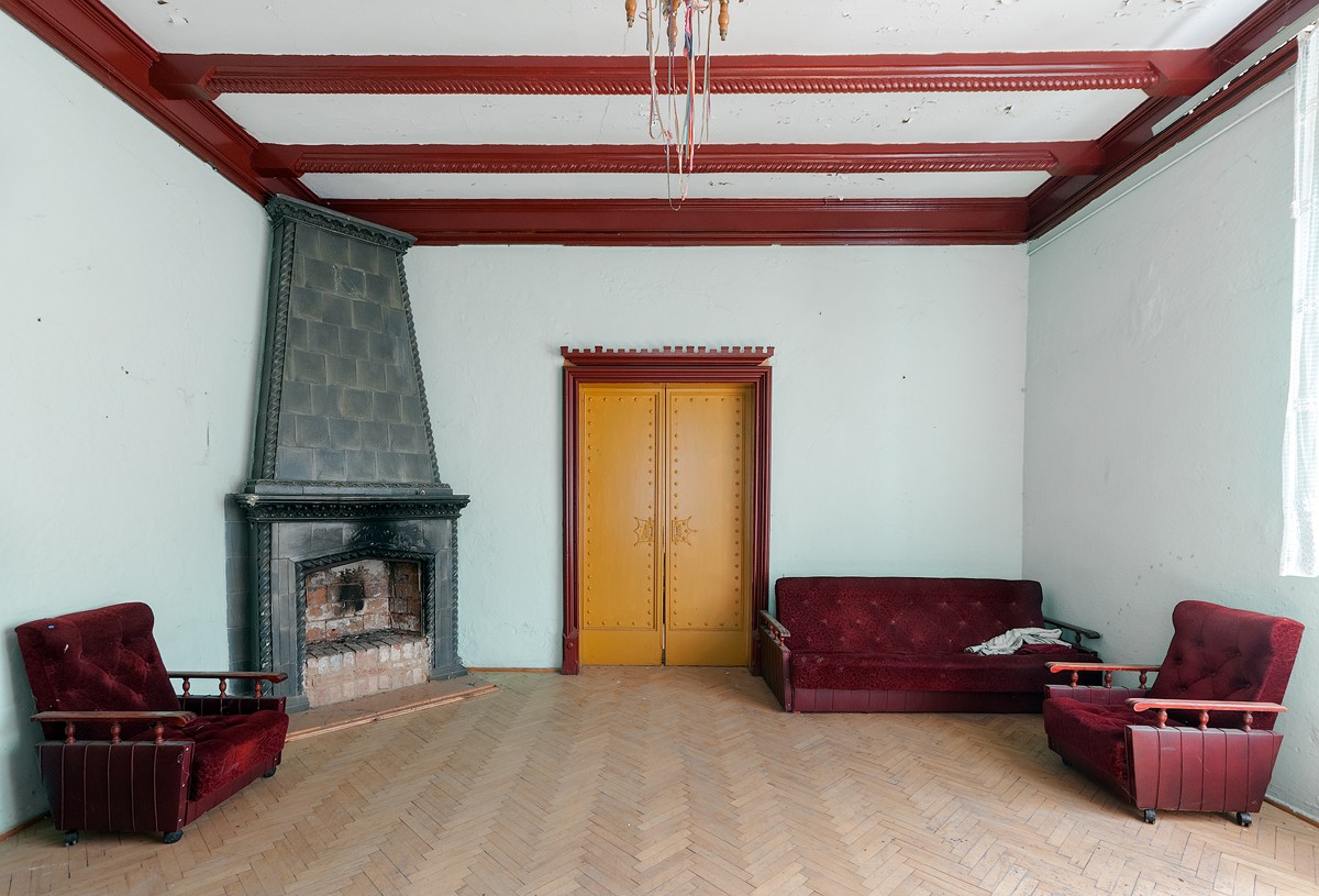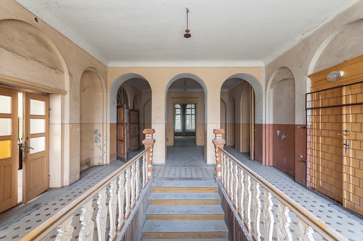Una scala rettilinea conduce al spazioso atrio del piano superiore, che dà accesso agli ambienti rappresentativi e all’antica sala da ballo, un tempo riccamente decorata, che ha perso il suo carattere cerimoniale durante gli usi del dopoguerra. Inoltre, la disposizione originale degli ambienti con dettagli architettonici dell’epoca è stata in gran parte mantenuta, compresi i pavimenti storici, soffitti in stucco, piastrelle, porte massicce, camini e stufe in maiolica.